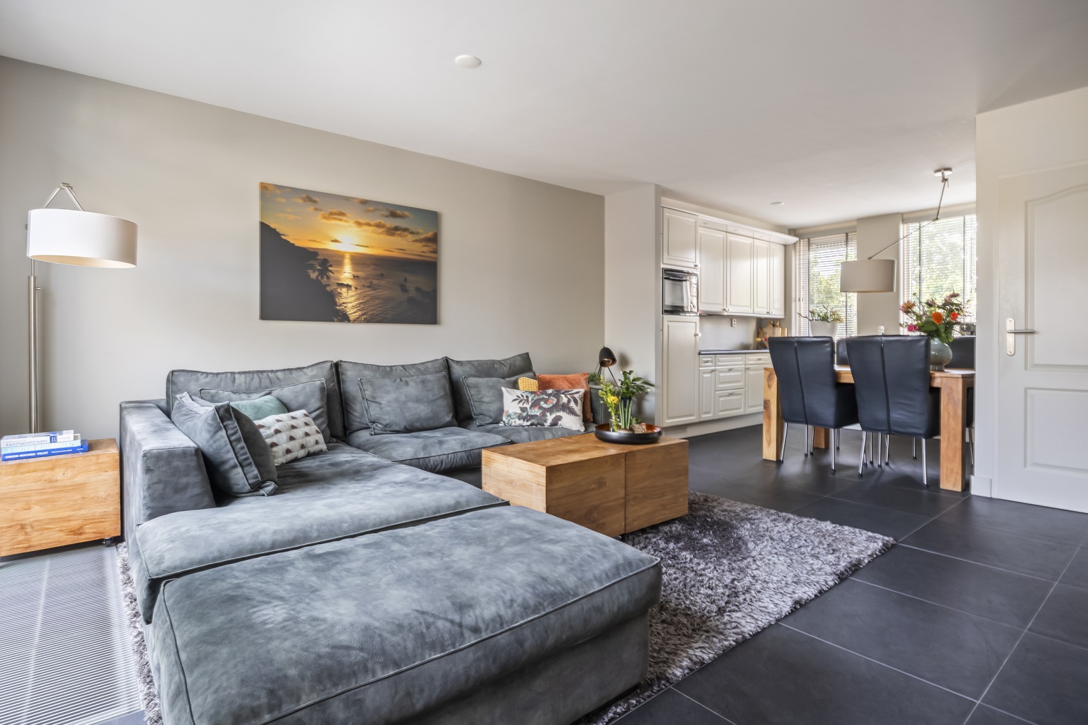 De woonkamer van ca. 32 m² voelt ruim en licht aan. Er is volop plek voor een gezellig zitgedeelte én een eettafel. Door het royale raam tot aan de grond aan de tuinzijde baadt de woonkamer in het licht, met de donkere plavuizen vloer met vloerverwarming als stijlvol en stoer contrast. Handig is de praktische trapkast: de perfecte plek om boodschappen, de stofzuiger of speelgoed uit het zicht op te bergen. Vanuit de woonkamer bereik je de uitgebouwde achterhal met deur naar de tuin.