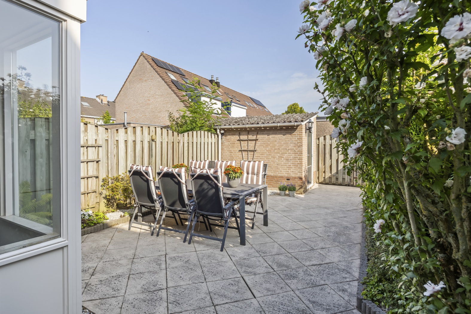 De tuin is onderhoudsvriendelijk ingericht met sierbestrating, groene borders en een stenen berging. Dankzij de brandgang aan de achterzijde is hij ook praktisch bereikbaar.