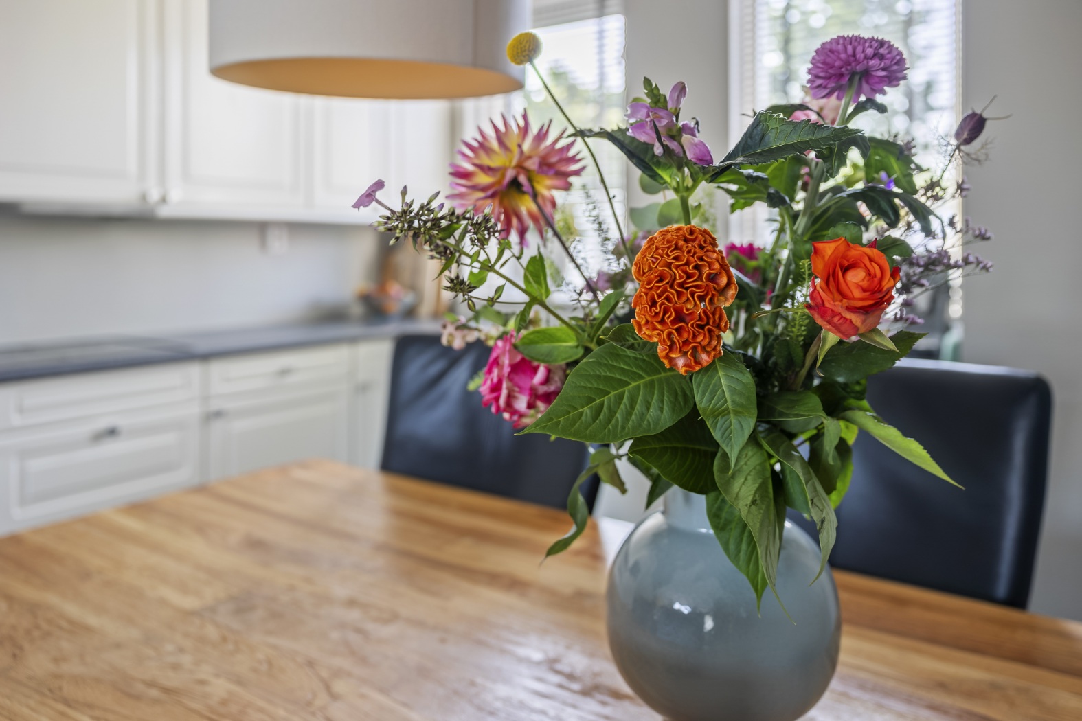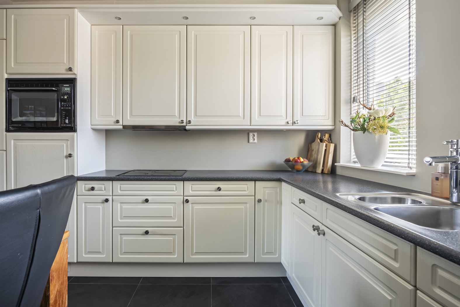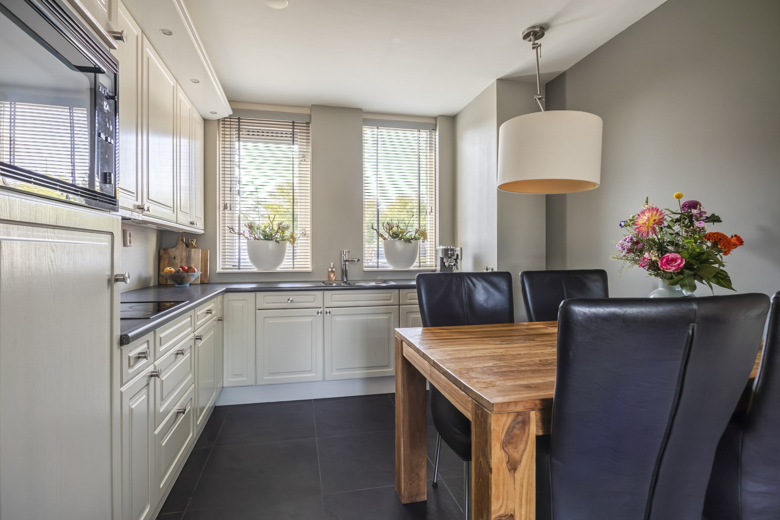 Aan de voorzijde van de woning ligt de keuken, uitgevoerd met lichte hoge kastfronten die een sfeervolle uitstraling geven. Compleet uitgevoerd met koelkast, combi-oven-magnetron, vaatwasser, afzuigkap en lichtkoof. Vanuit hier geniet je van een prettig uitzicht op het groen. De royale hoekopstelling biedt volop werk- én bergruimte. Een ideale plek waar je met gemak de dagelijkse maaltijden bereidt, maar ook uitgebreid kunt koken voor familie en vrienden.