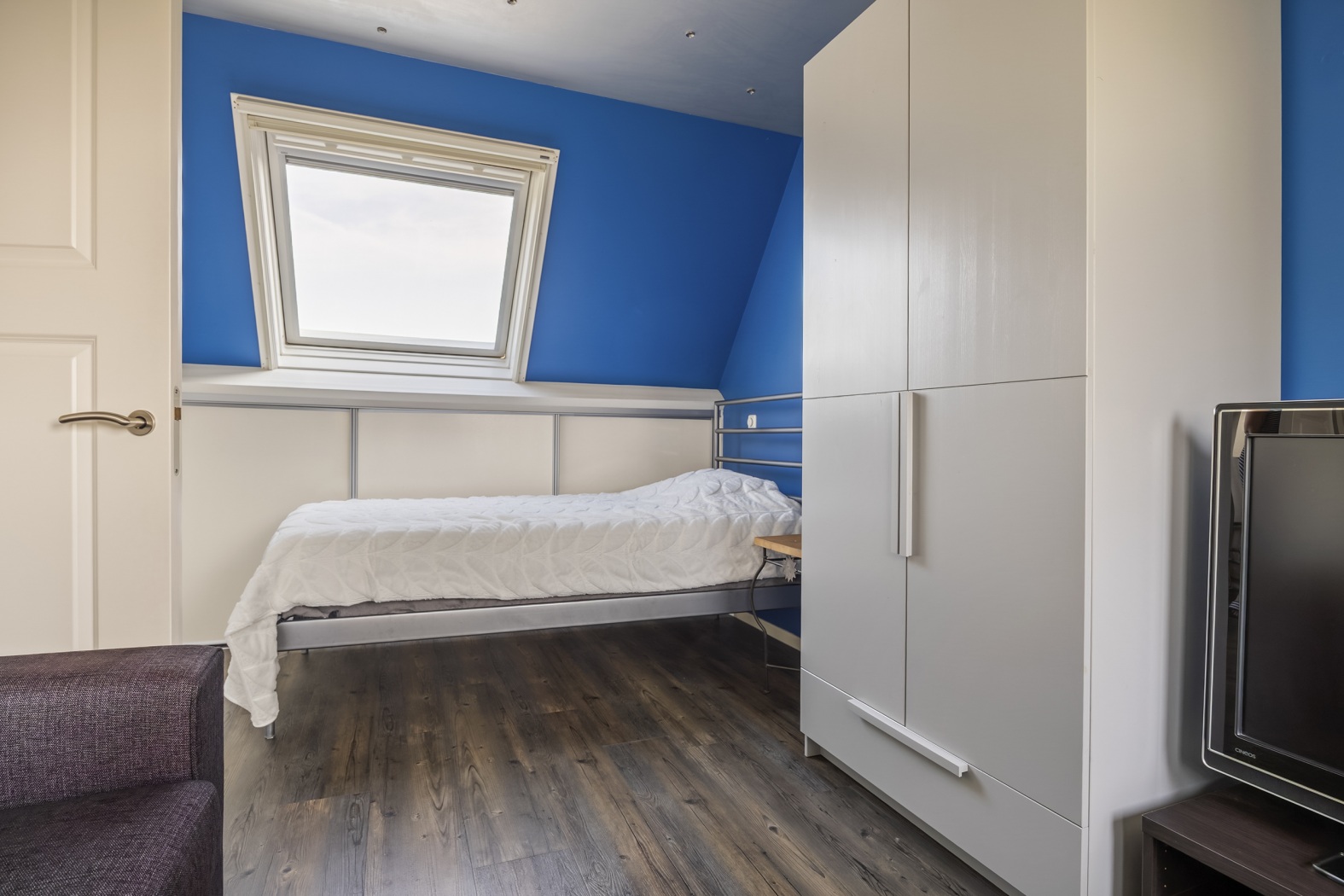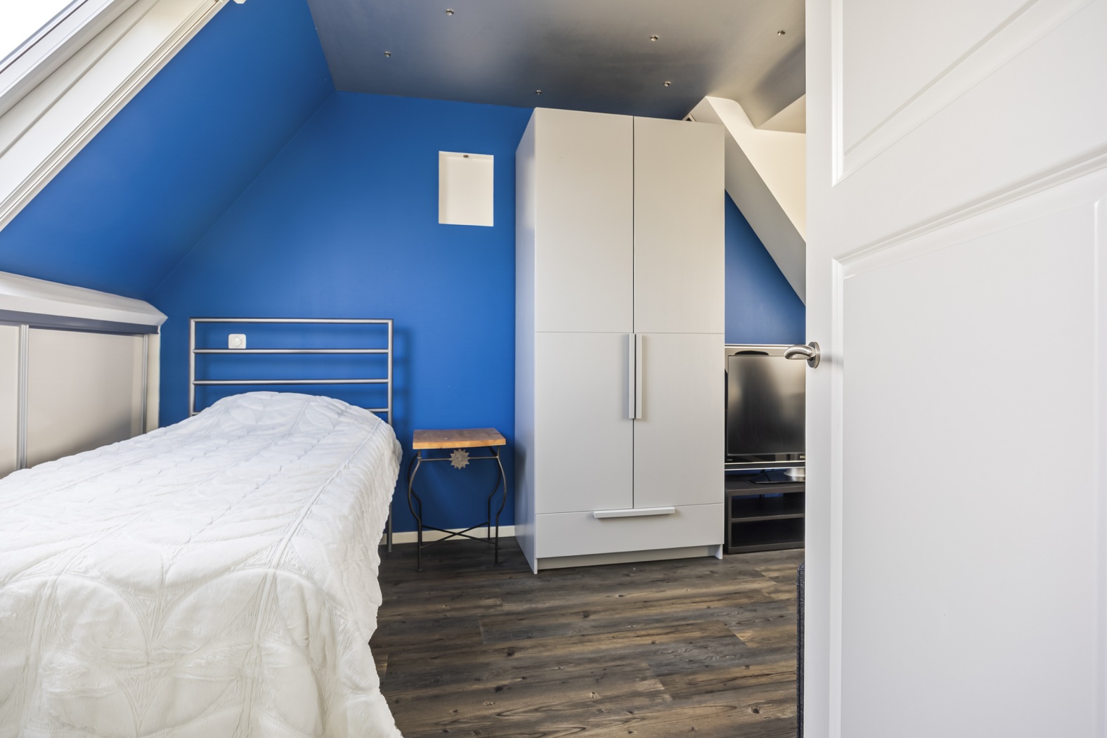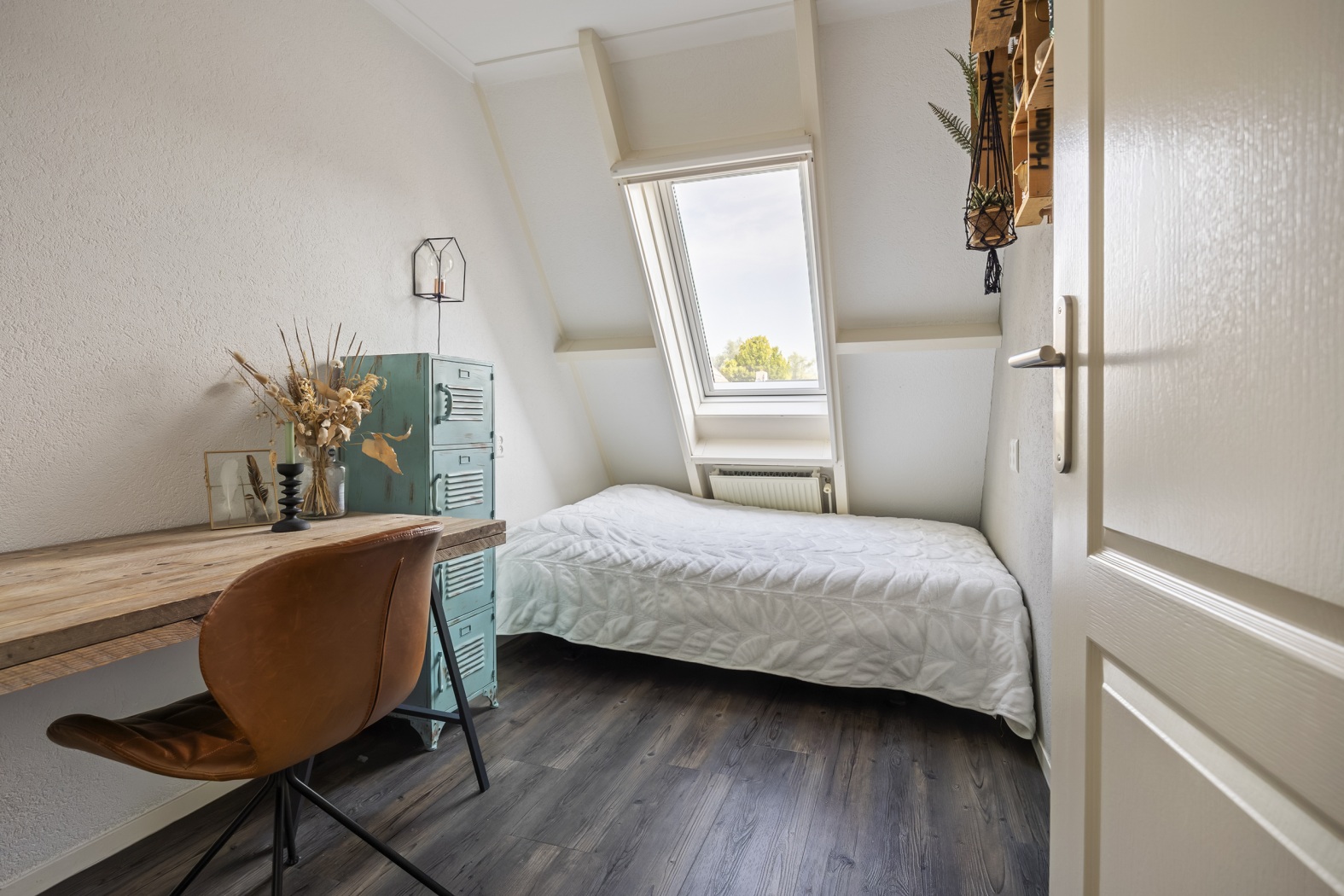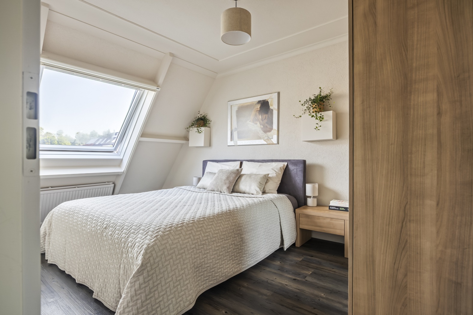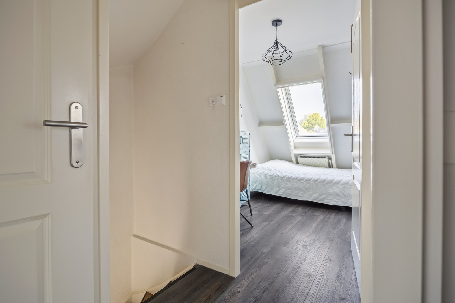 Op de voorzolder bevinden zich de opstelplaats van de cv-installatie en de aansluitingen voor wasmachine en droger – een praktische ruimte waar alles binnen handbereik is. Vanuit hier bereik je de ruime vierde slaapkamer aan de voorzijde, voorzien van een dakkapel en een dakraam, waardoor de kamer aangenaam licht en extra ruimtelijk aanvoelt. Achter de knieschotten is handige bergruimte gecreëerd voor al je spullen. Deze ruime 4e slaapkamer is groot genoeg om eventueel te splitsen in een 5e (slaap)kamer.