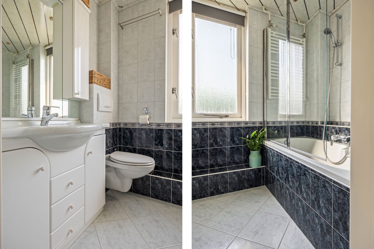 De badkamer ligt aan de voorzijde van de woning en is praktisch ingericht met een ligbad met douchemogelijkheid en spatscherm, een wastafelmeubel en een tweede toilet.