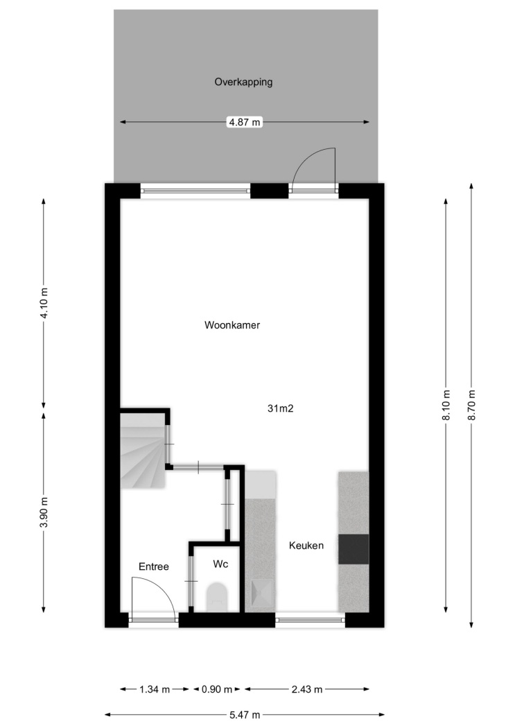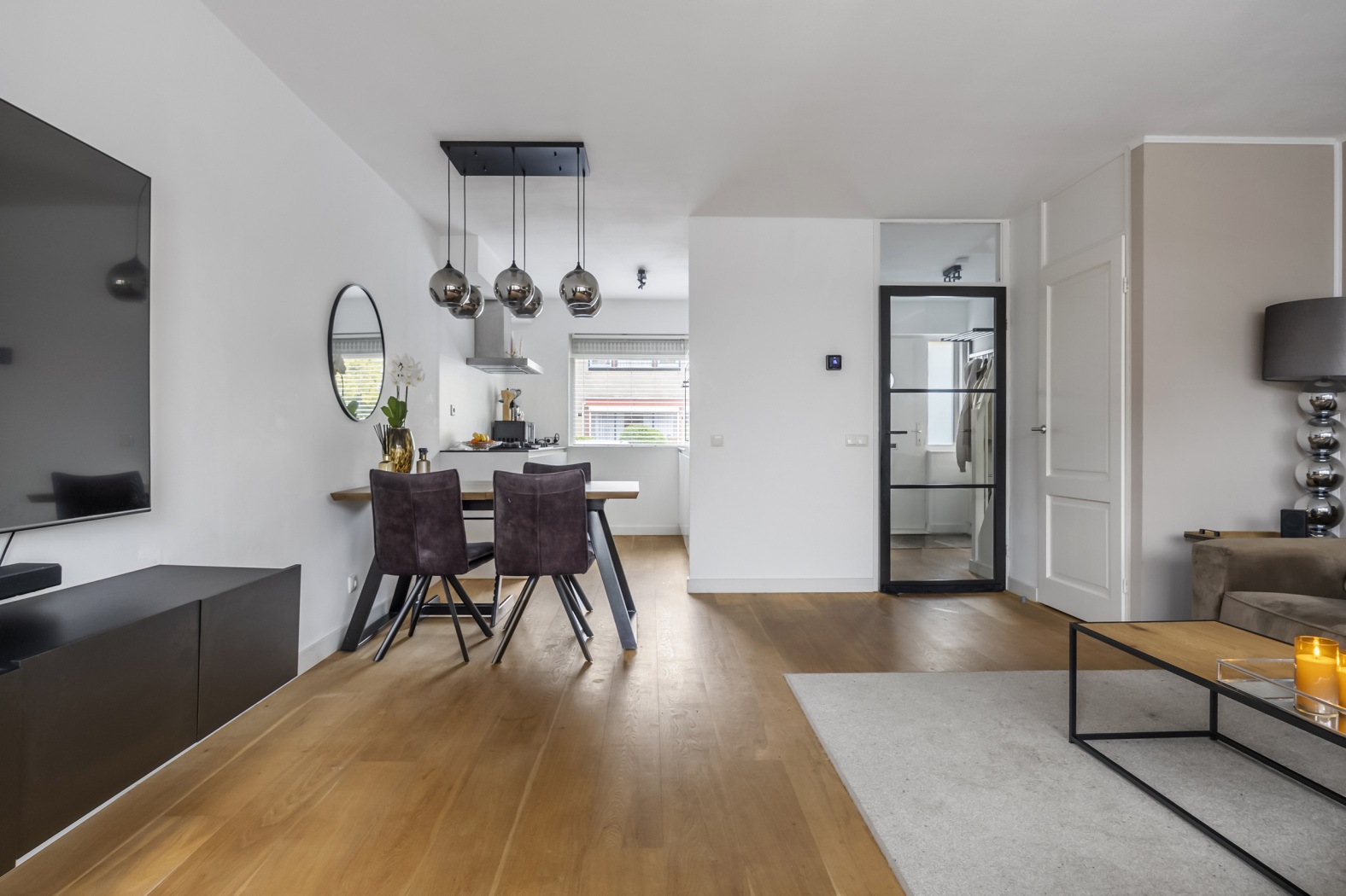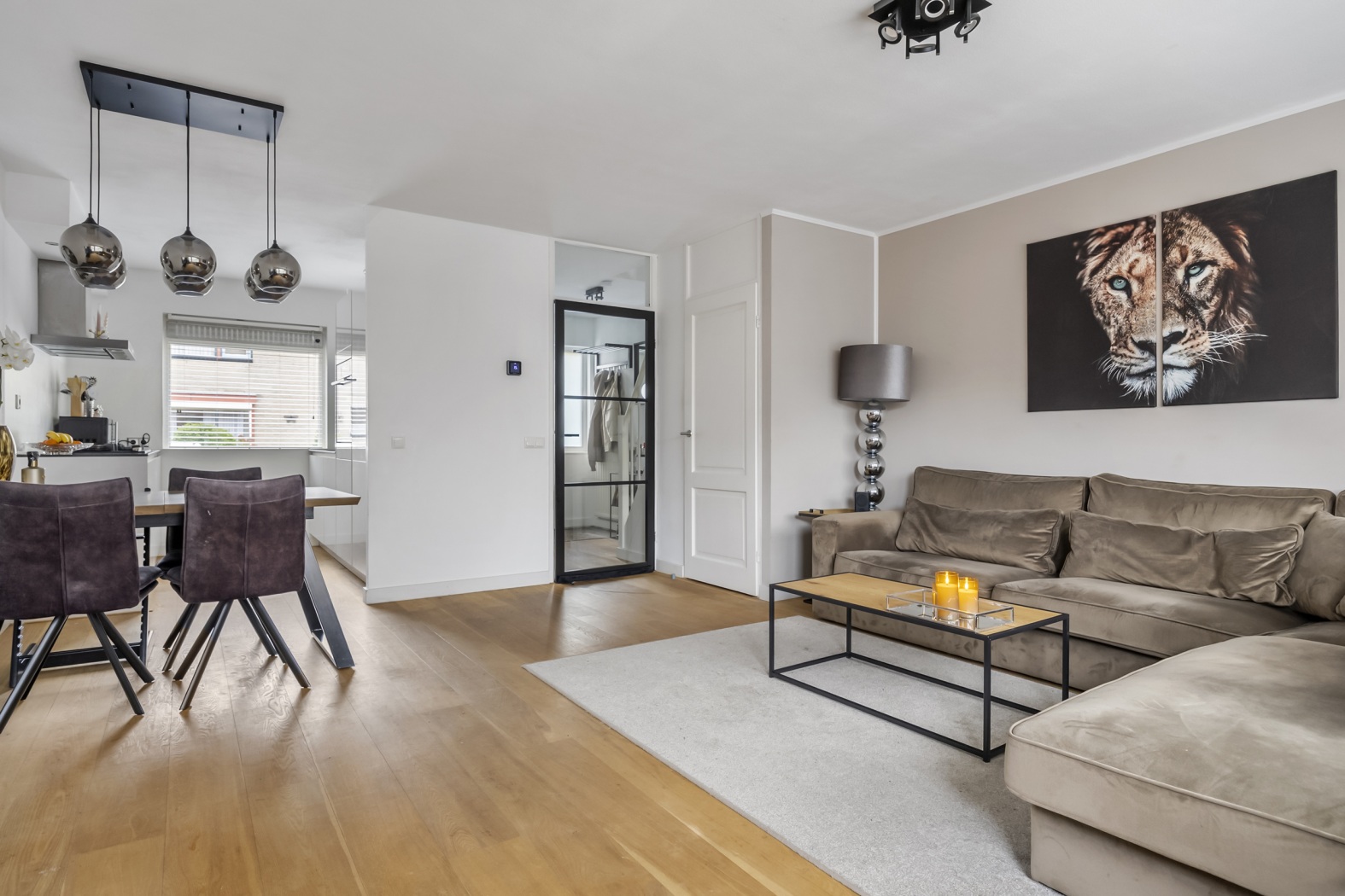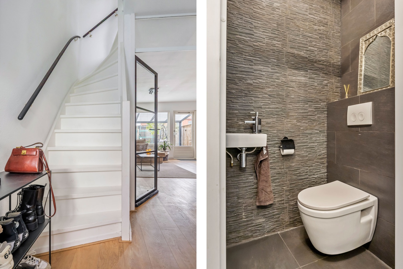 De entree biedt toegang tot de woonkamer, de moderne toiletruimte, de meterkast en de trapopgang naar de verdieping. Een stijlvolle taatsdeur geeft toegang tot de woonkamer en zorgt direct voor een eigentijdse uitstraling.