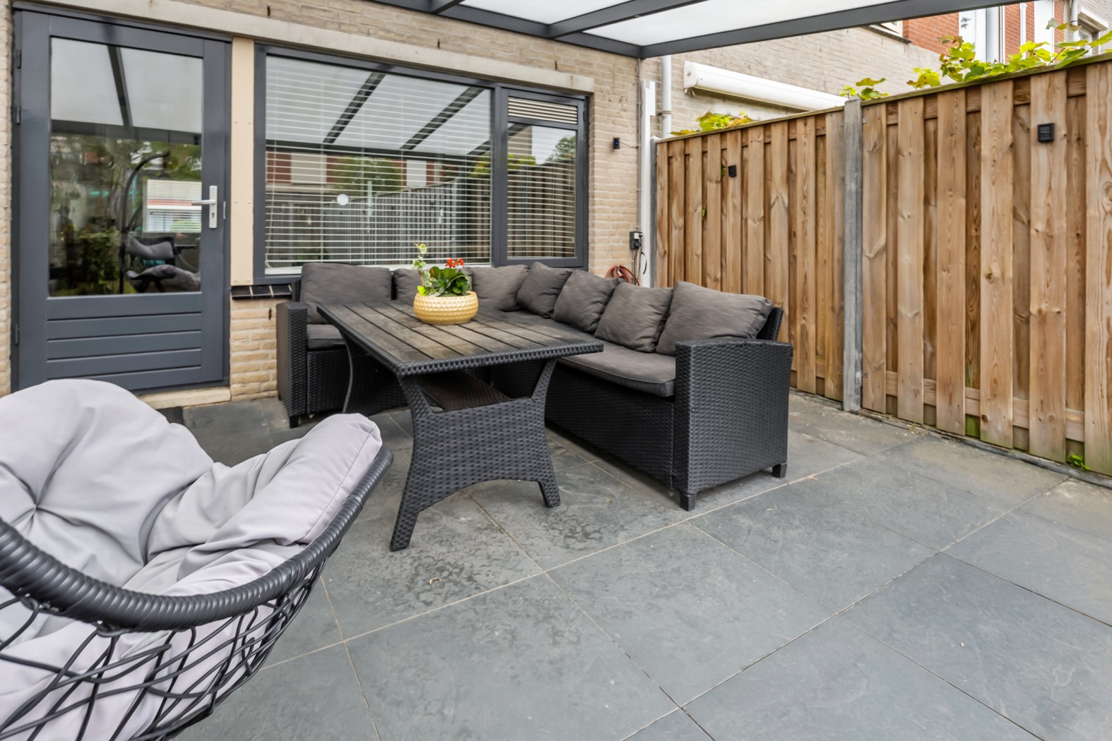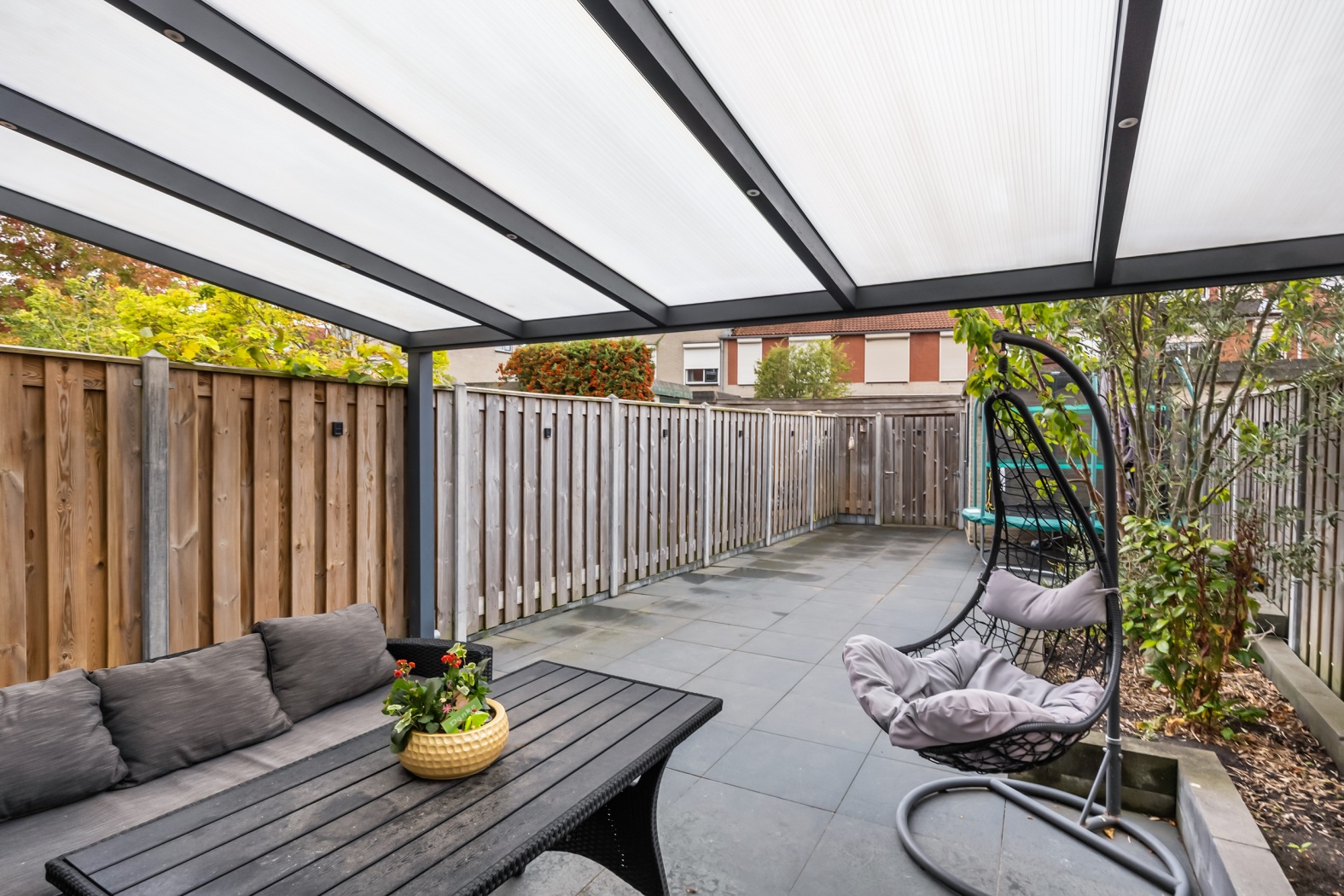 Aan de achtergevel bevindt zich een aluminium veranda van ca. 18 m² (geplaatst in 2021). Dankzij de royale overkapping kun je hier het hele jaar door genieten van het buitenleven – droog in de regen, koel in de zomer.