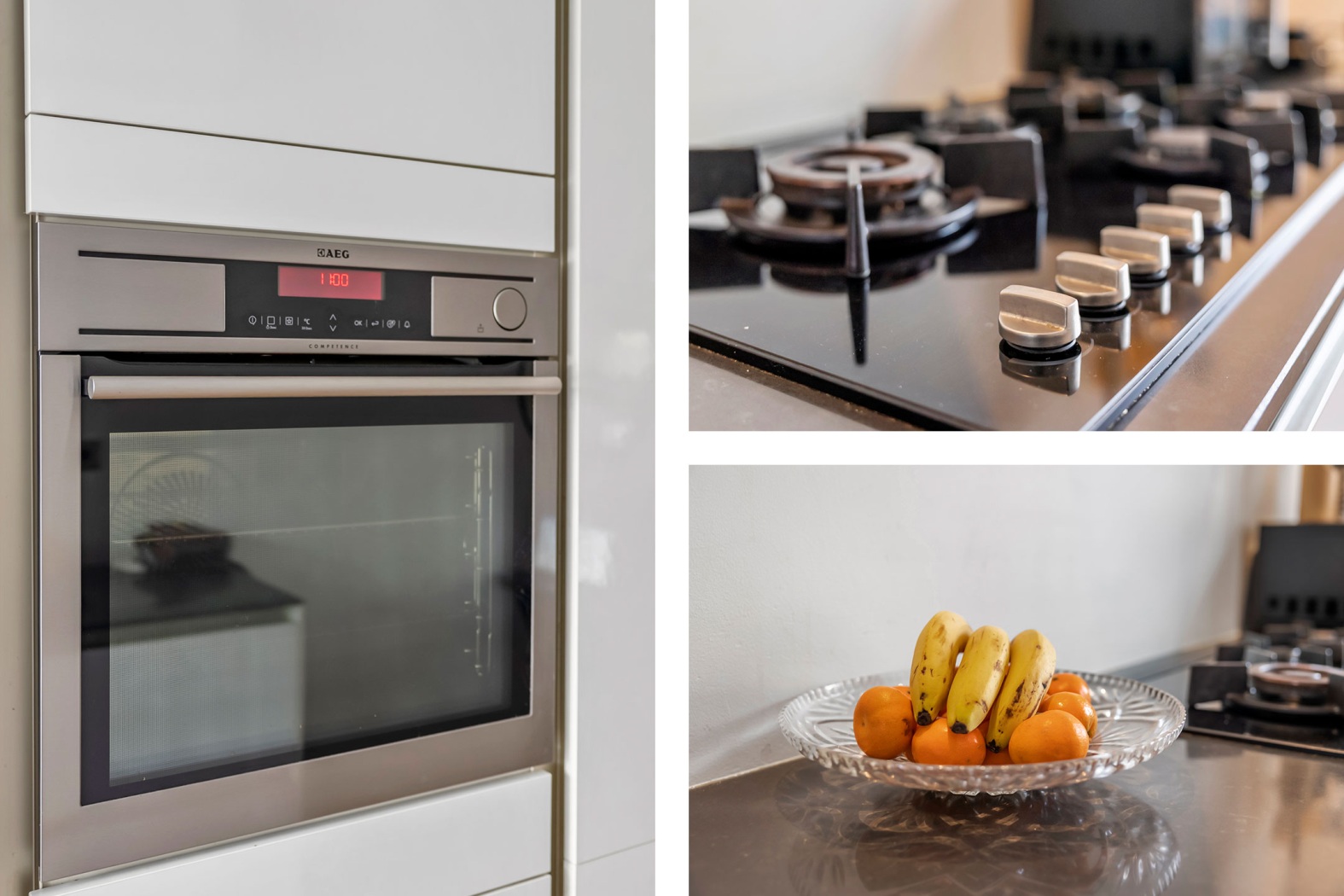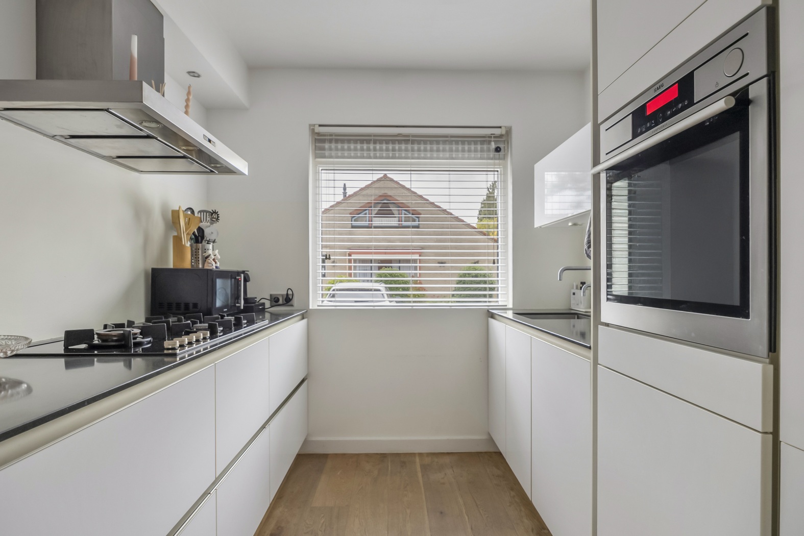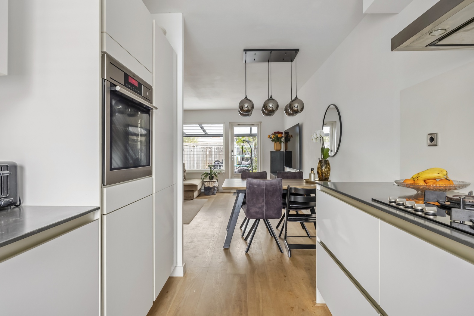 De moderne half open keuken ligt aan de voorzijde van de woning en is uitgevoerd in een strakke parallel opstelling met witte, greeploze kastfronten. Uiteraard is de keuken voorzien van alle benodigde inbouwapparatuur, waaronder een 5-pits gaskookplaat, rvs-afzuigkap, combioven, koel-/vriescombinatie, vaatwasmachine en een Quooker-kraan – alles wat je nodig hebt om met plezier te koken.