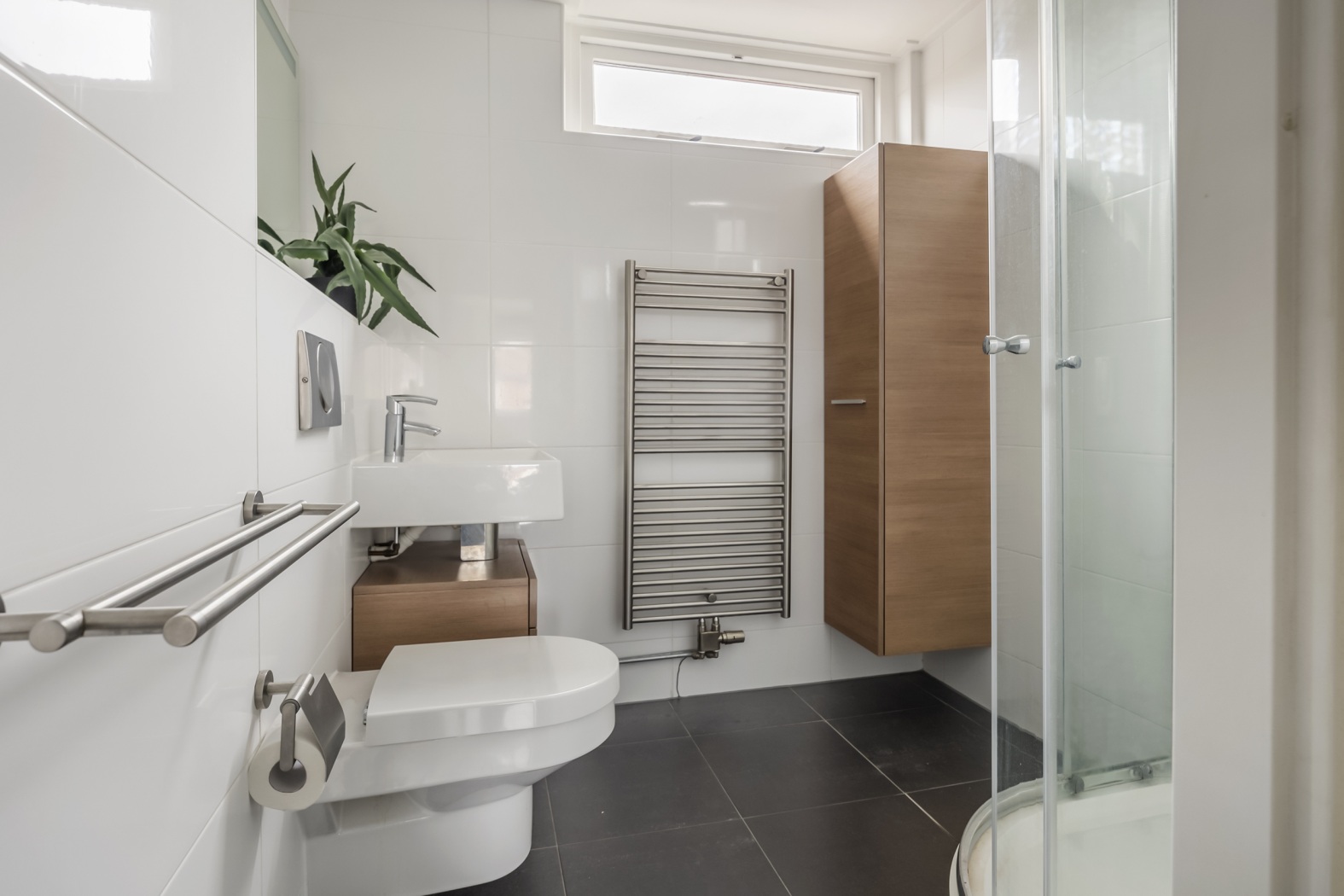 •Moderne badkamer met kwartronde douchecabine, tweede toilet, wastafelmeubel en designradiator