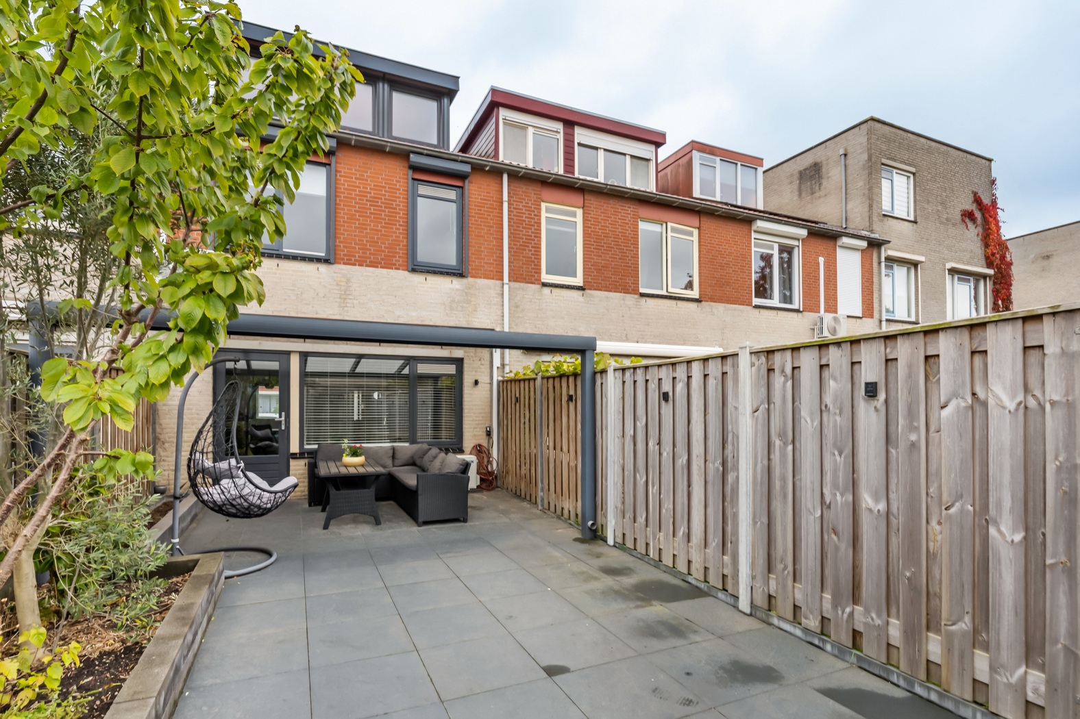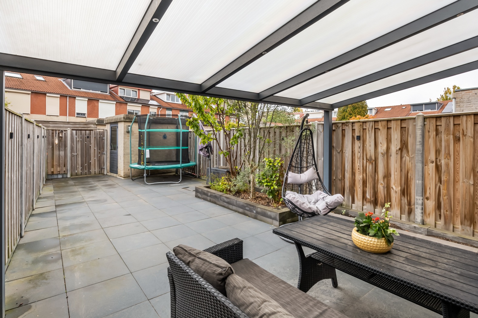 De onderhoudsvriendelijke achtertuin ligt op het westen en is met zijn diepte van circa 13 meter een fijne plek om van de middag- en avondzon te genieten. De tuin is volledig bestraat, voorzien van een kleine verhoogde border en omsloten door schuttingen voor optimale privacy. Aan de achtergevel bevindt zich een aluminium veranda van ca. 18 m², ideaal om het hele jaar door buiten te zitten. Daarnaast beschikt de tuin over een achterom en een stenen fietsenberging van ca. 5 m².