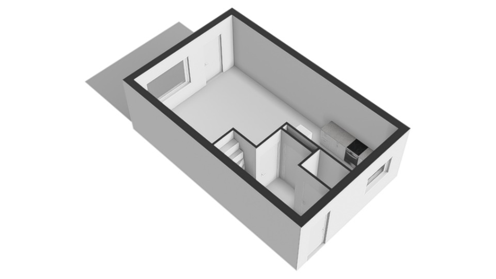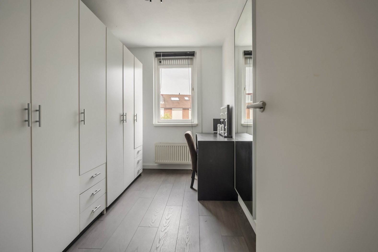 •Keuken aan de voorzijde, strak wit, greeploos en parallel opgesteld met inbouwapparatuur