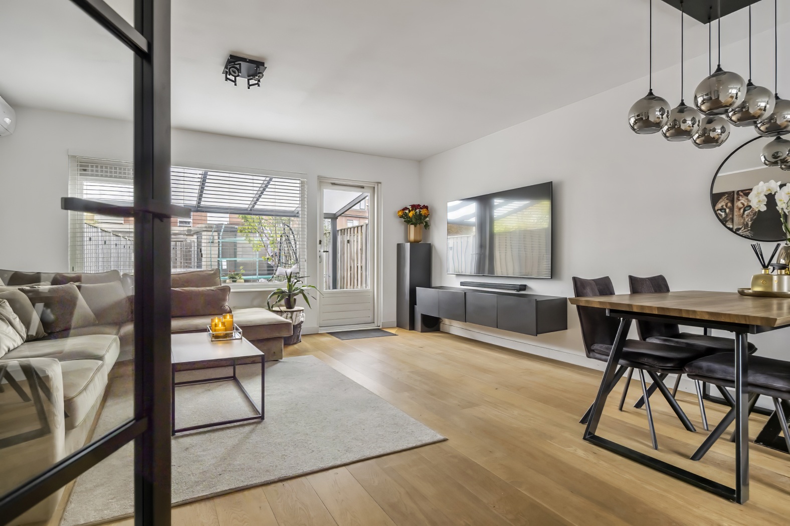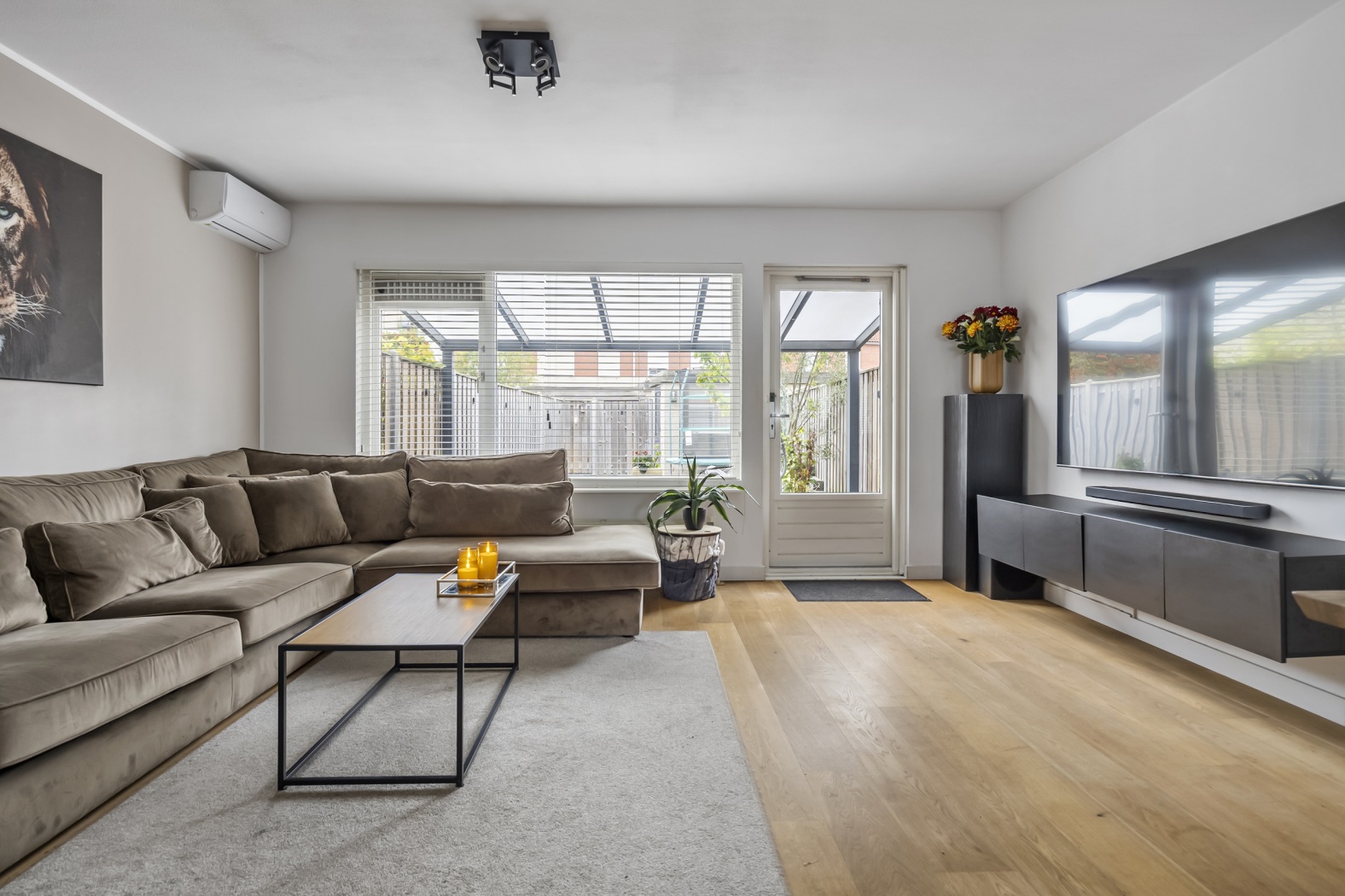 De woonkamer is een lichte en prettige leefruimte met een parketvloer, airconditioning, trapkast en een deur naar de tuin. Via de achterzijde stap je zo de veranda op – een heerlijke verlenging van de woonkamer, ideaal voor lange avonden buiten.
