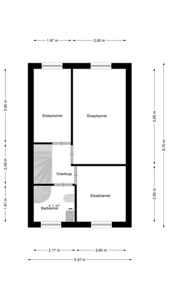 Op de eerste verdieping bevinden zich drie goed bemeten slaapkamers – één aan de voorzijde en twee aan de achterzijde, waarvan de laatste zijn voorzien van rolluiken. De hoofdslaapkamer beschikt bovendien over airconditioning. Alle kamers hebben laminaatvloeren en een nette afwerking.