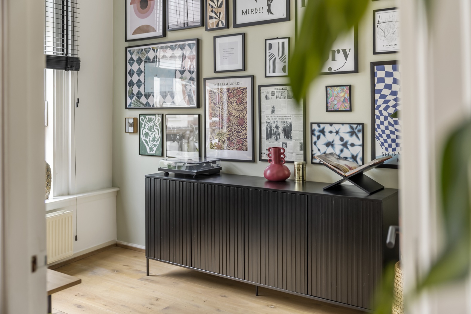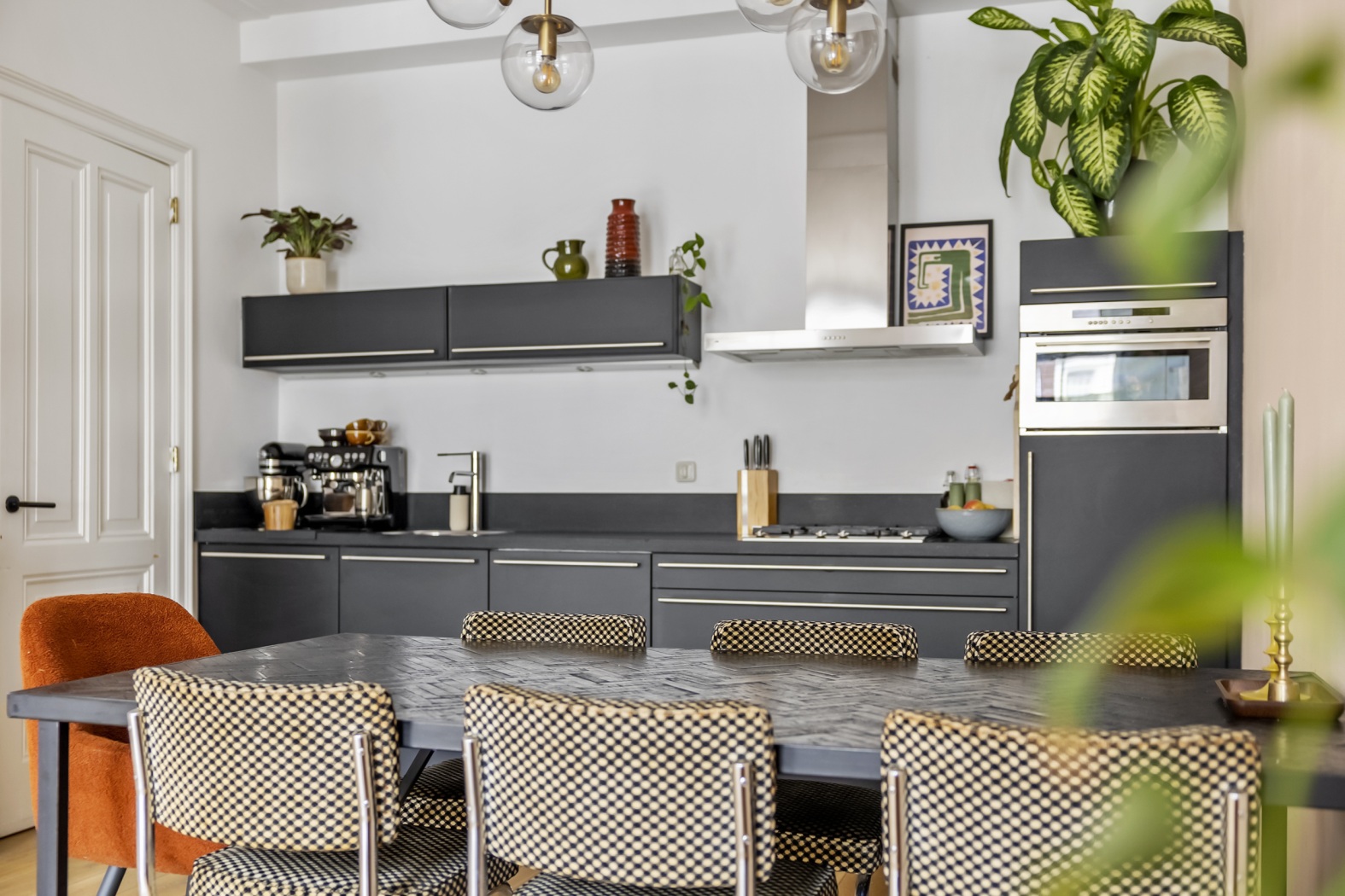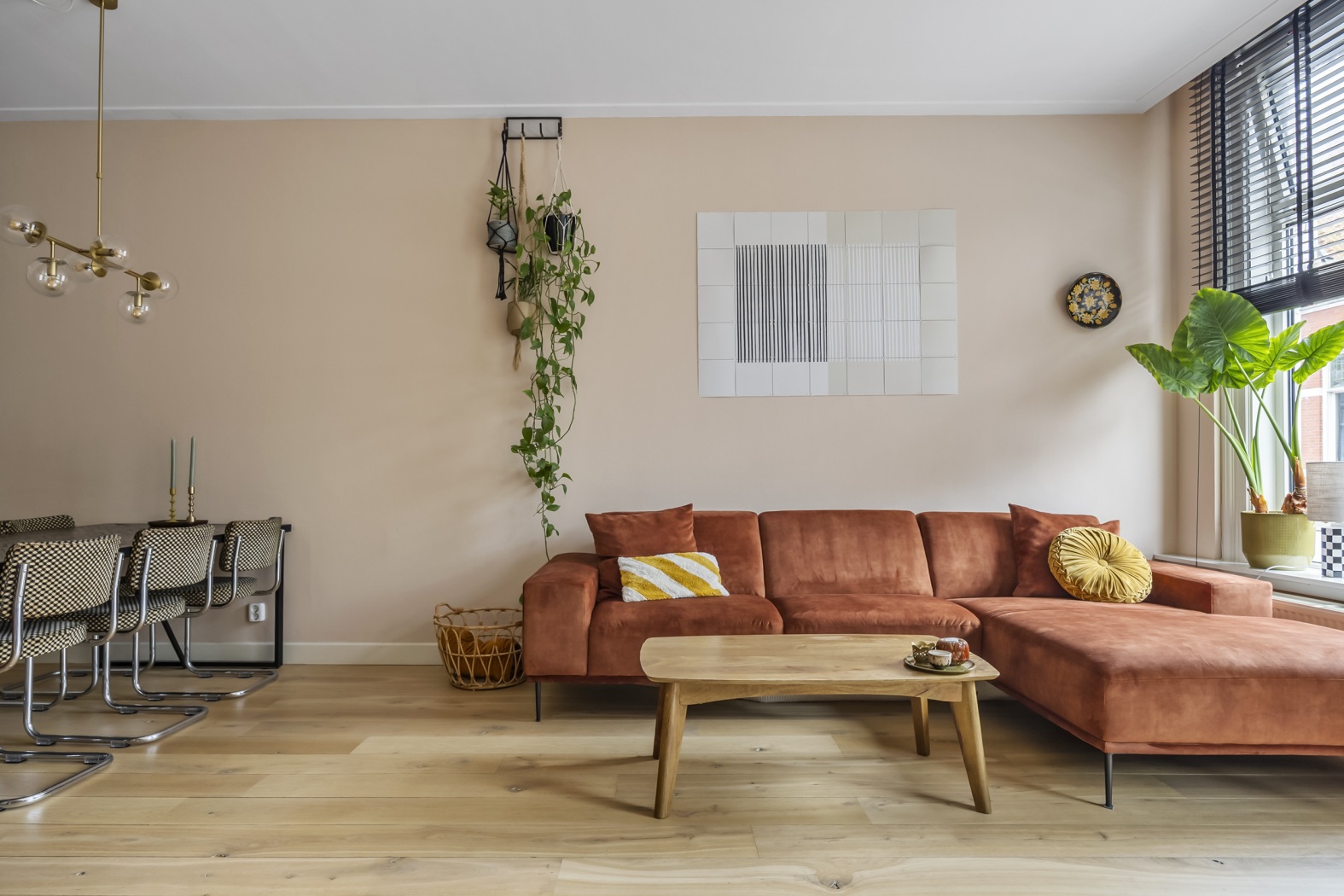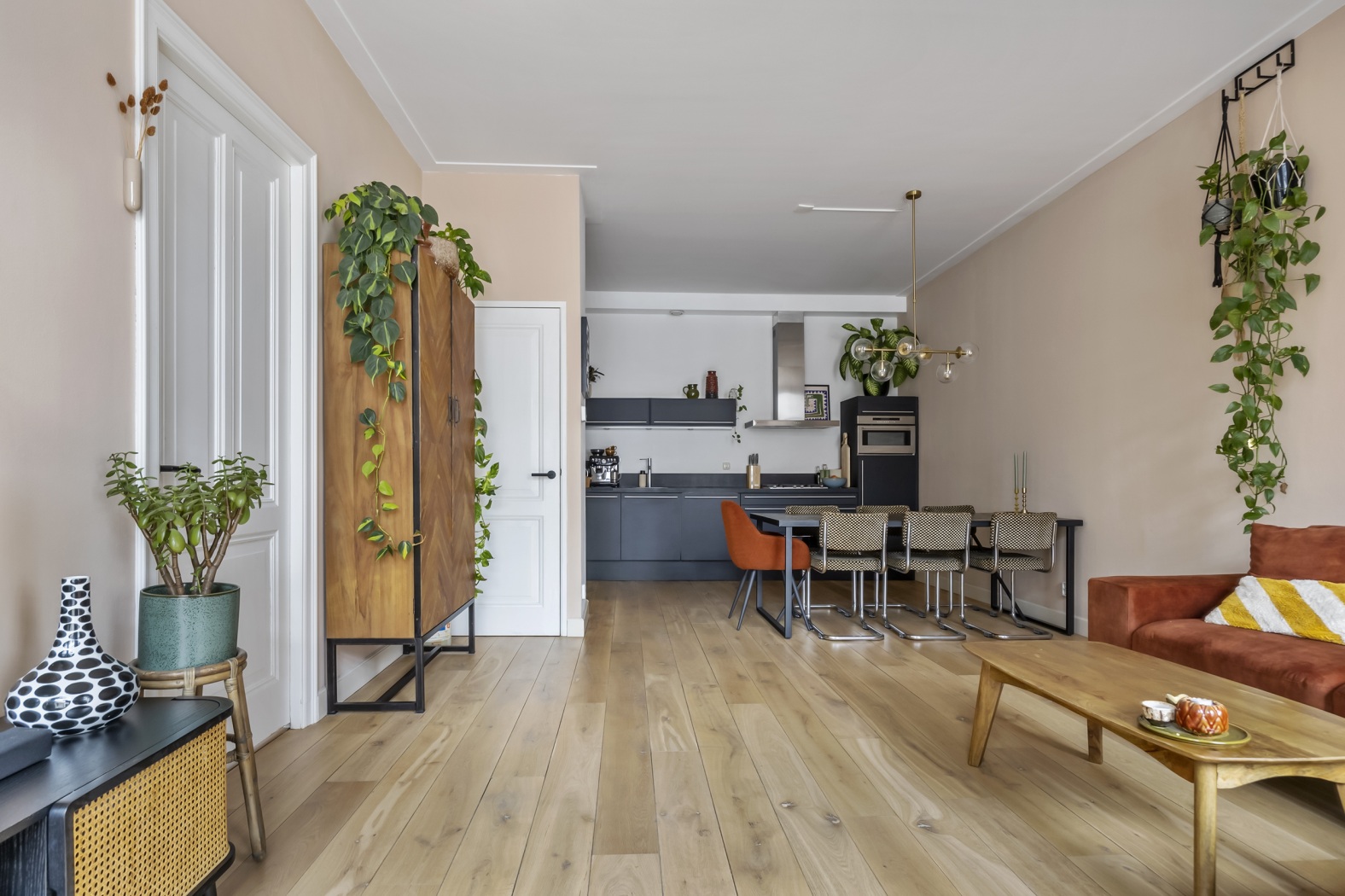 De woonkamer bevindt zich aan de voorzijde van de woning en voelt direct ruim en licht aan dankzij de grote ramen en het hoge plafonds. Hier is volop plek voor een comfortabele zithoek én een gezellige eethoek. De open keuken sluit mooi aan bij het geheel en maakt de woonkamer tot een fijne, sociale leefruimte.