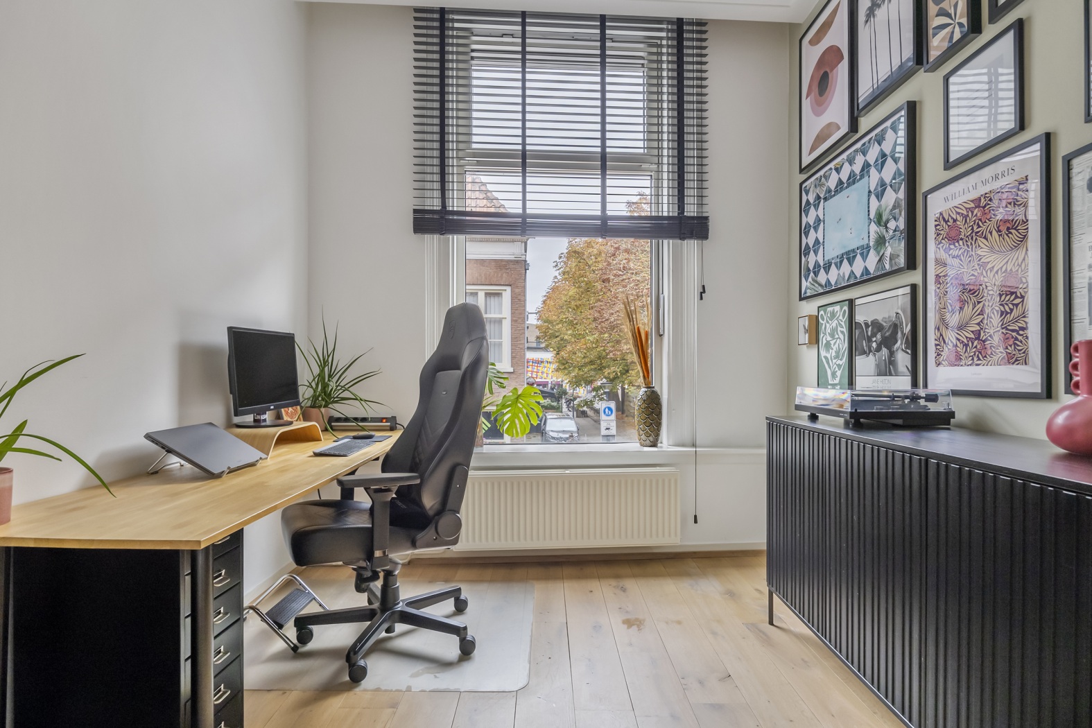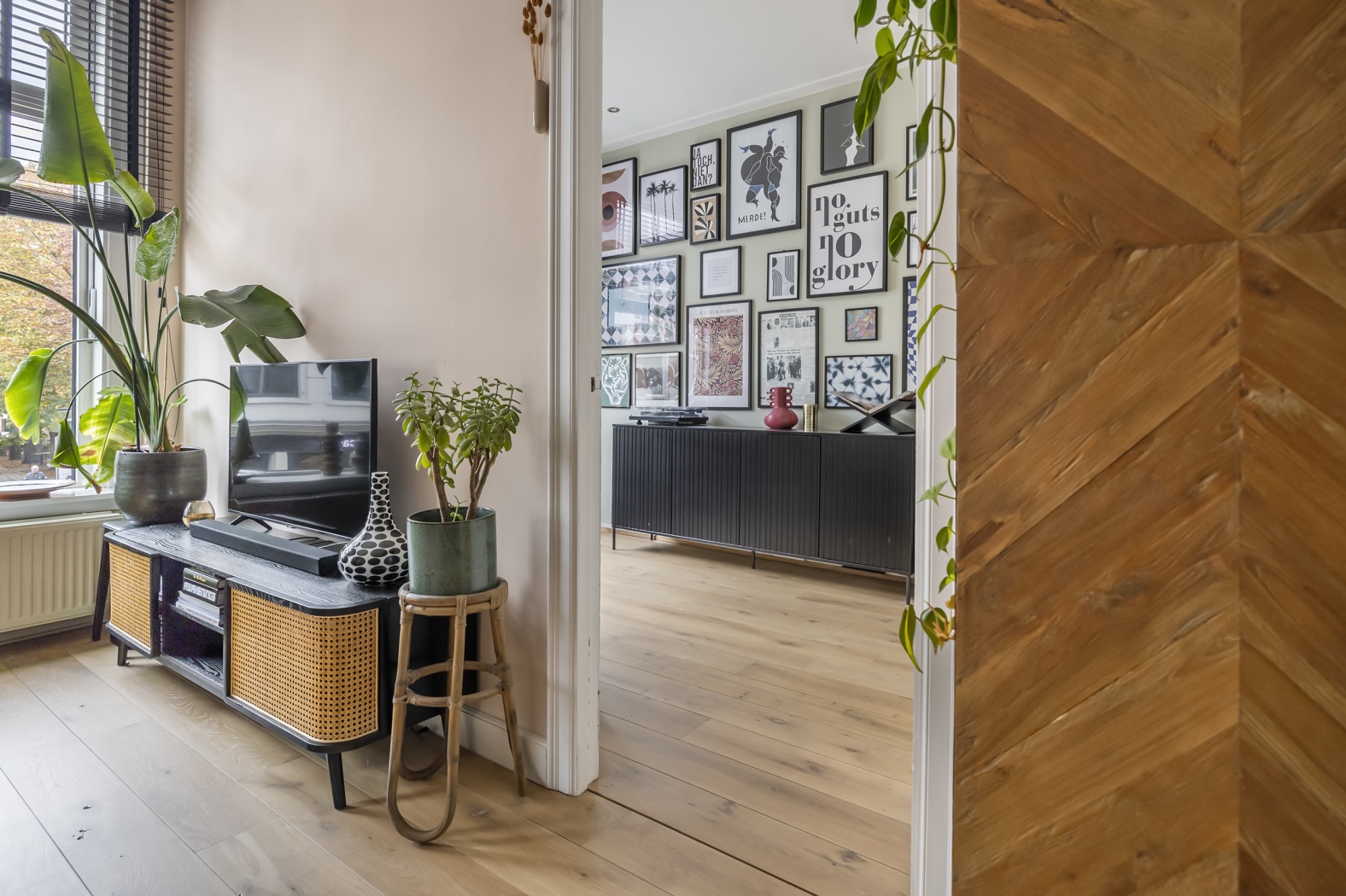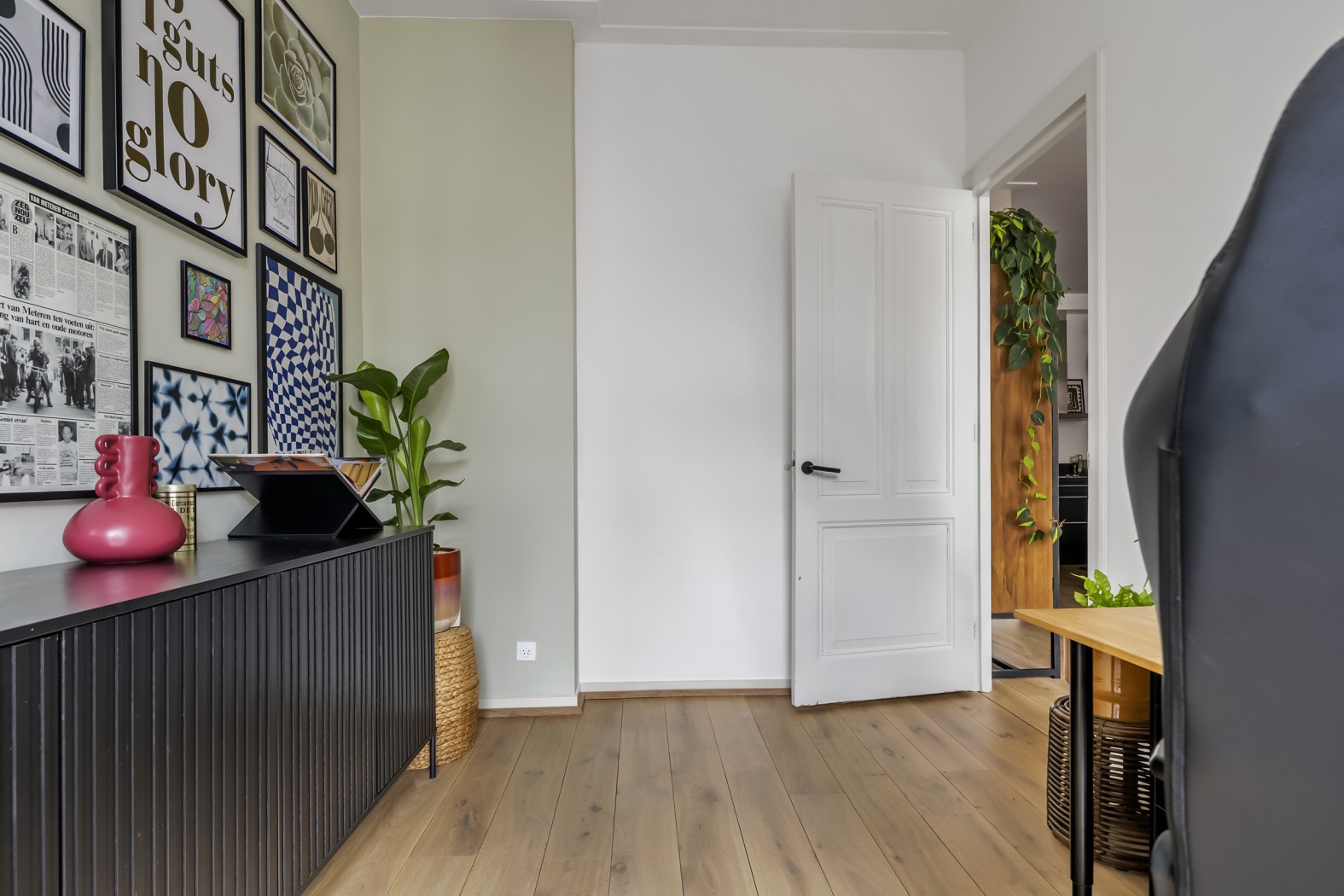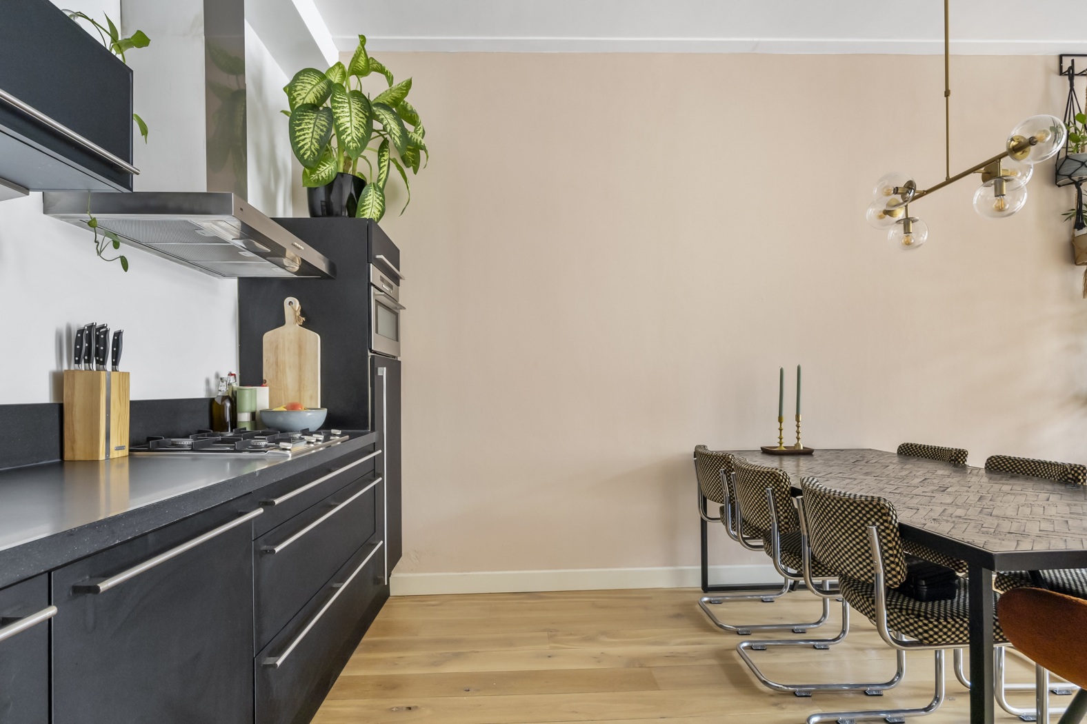 De woonkamer bevindt zich aan de voorzijde van de woning en voelt direct ruim en licht aan dankzij de grote ramen en het hoge plafonds. Hier is volop plek voor een comfortabele zithoek én een gezellige eethoek. De open keuken sluit mooi aan bij het geheel en maakt de woonkamer tot een fijne, sociale leefruimte.