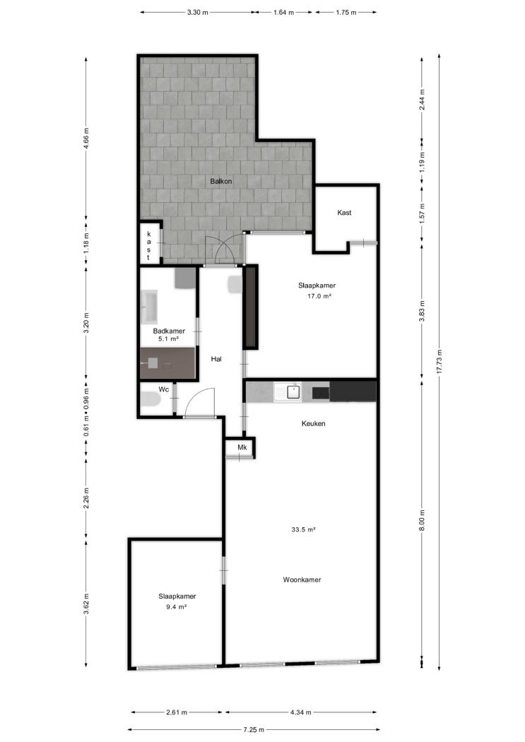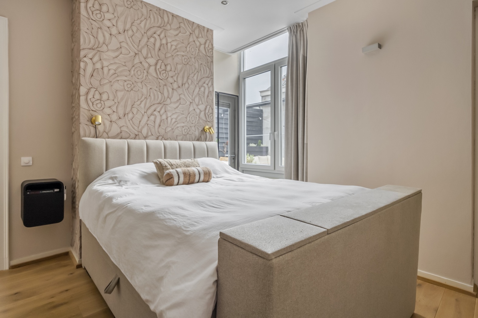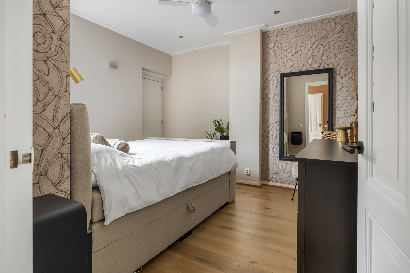 Aan de voorzijde vind je de eerste slaapkamer, ideaal als logeer- of werkkamer. De hoofdslaapkamer ligt aan de rustige achterzijde en beschikt over een ruime inloop kledingkast. De badkamer is bereikbaar via de hal en is stijlvol afgewerkt en voorzien van een inloopdouche, dubbele wastafel en wasmachineaansluiting.