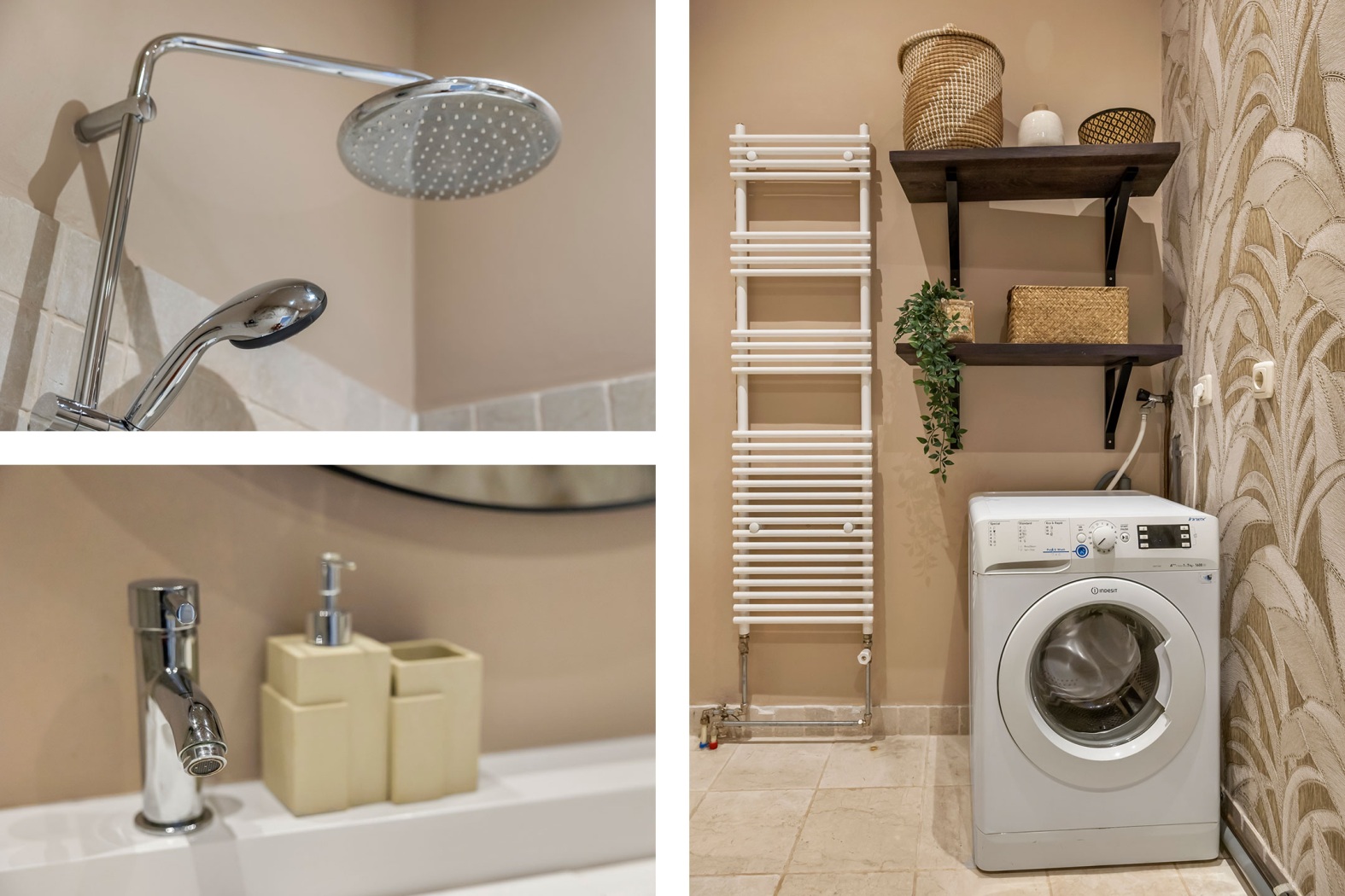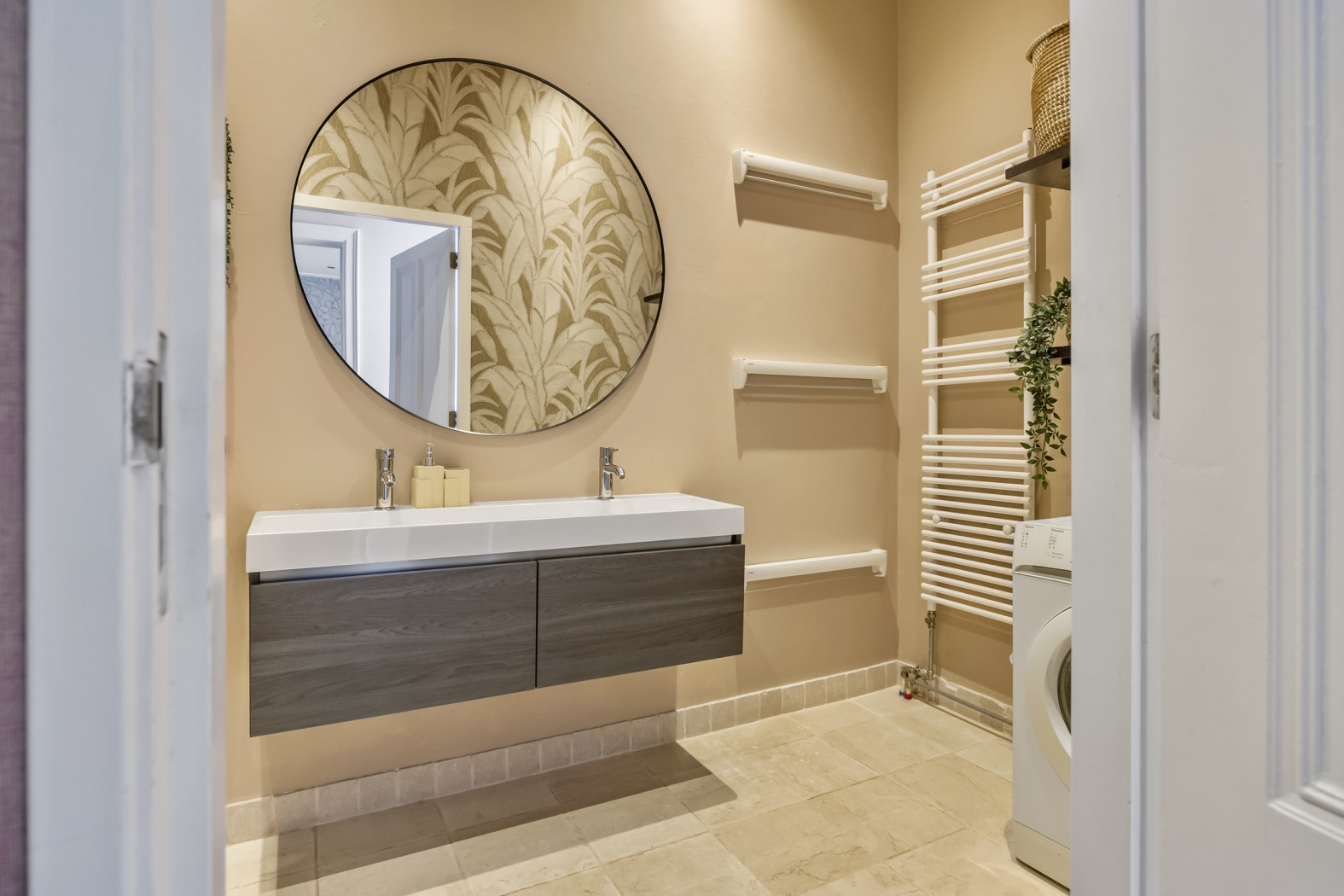 - Badkamer met inloopdouche, dubbele wastafel en wasmachineaansluiting