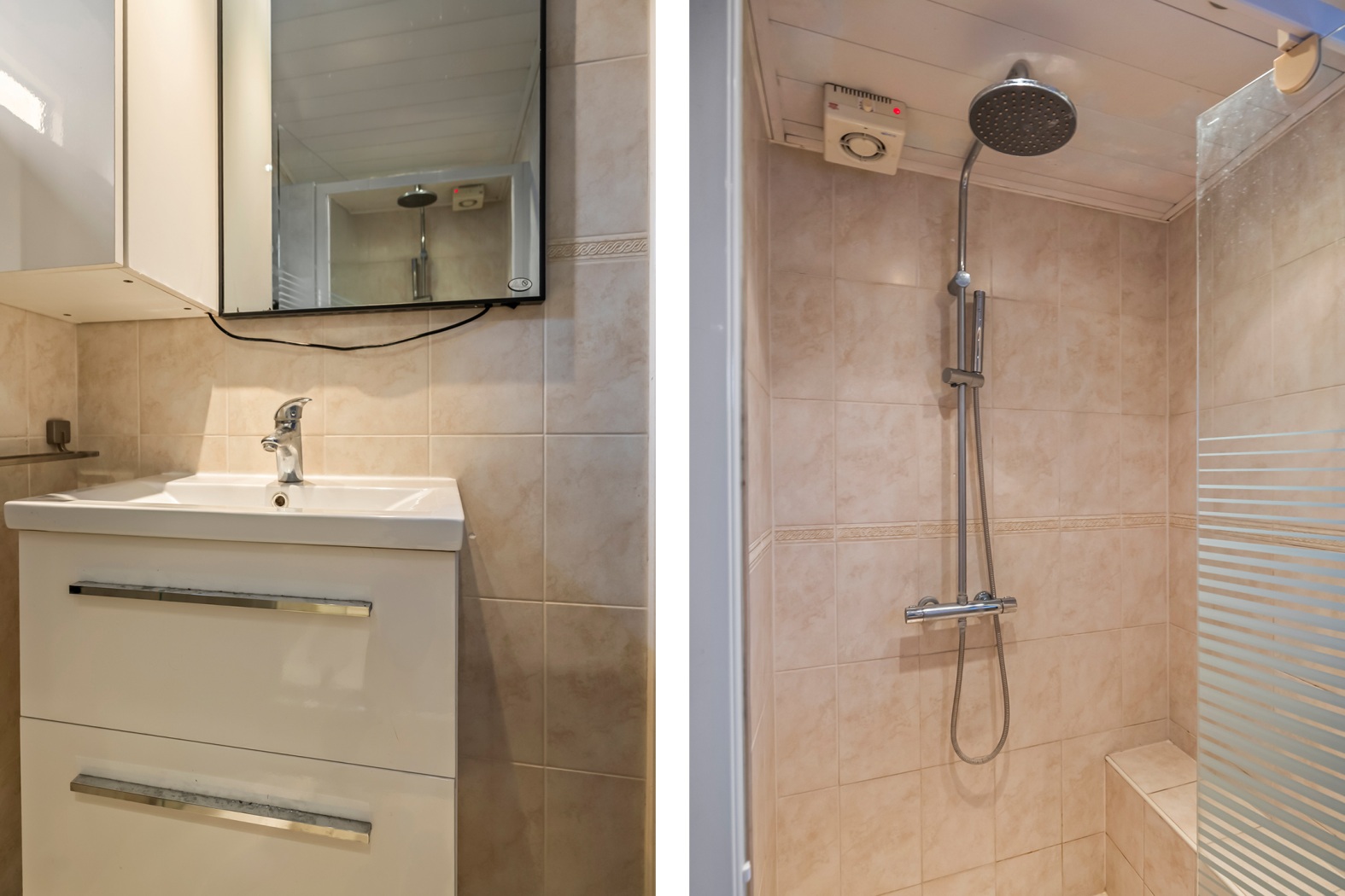 Op de eerste verdieping bevindt zich een zeer ruime slaapkamer, met de mogelijkheid om hier eenvoudig twee kamers van te creëren. Daarnaast is er nog een tweede, kleinere slaapkamer van goed formaat. Beide kamers zijn flexibel in te richten als slaap-, werk- of hobbyruimte. De badkamer is praktisch ingedeeld en voorzien van een wastafelmeubel en een ruime douche. Hoewel de ruimte compact is, is deze netjes onderhouden en verzorgd afgewerkt.