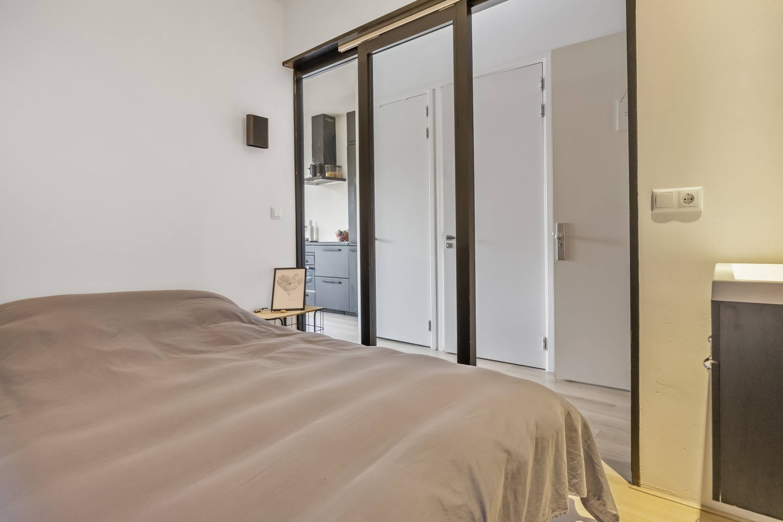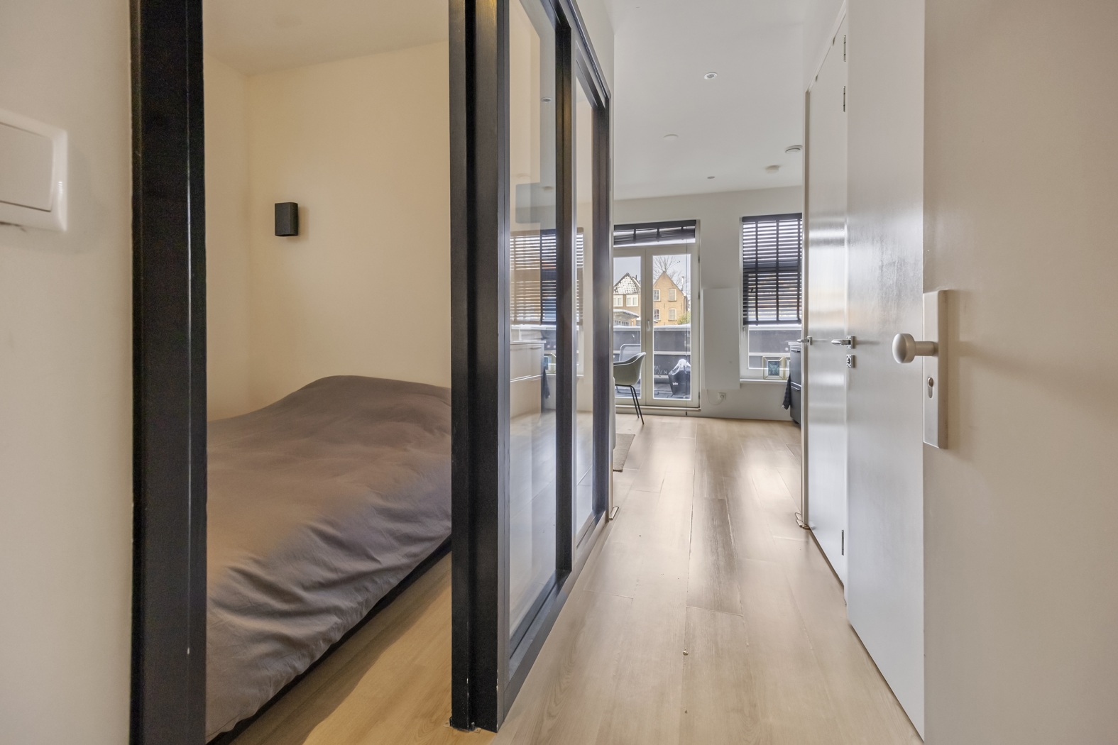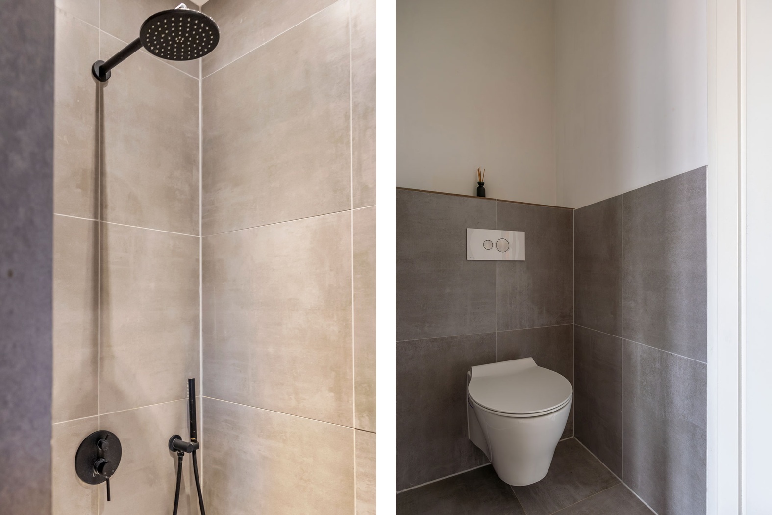 De slaapkamer grenst direct aan de woonkamer en keuken en beschikt over een badkamer en suite, wat zorgt voor een comfortabele en hotelachtige sfeer. In de hal bevinden zich een separaat toilet en praktische inbouwkasten, ideaal voor extra opbergruimte en een opgeruimd geheel.