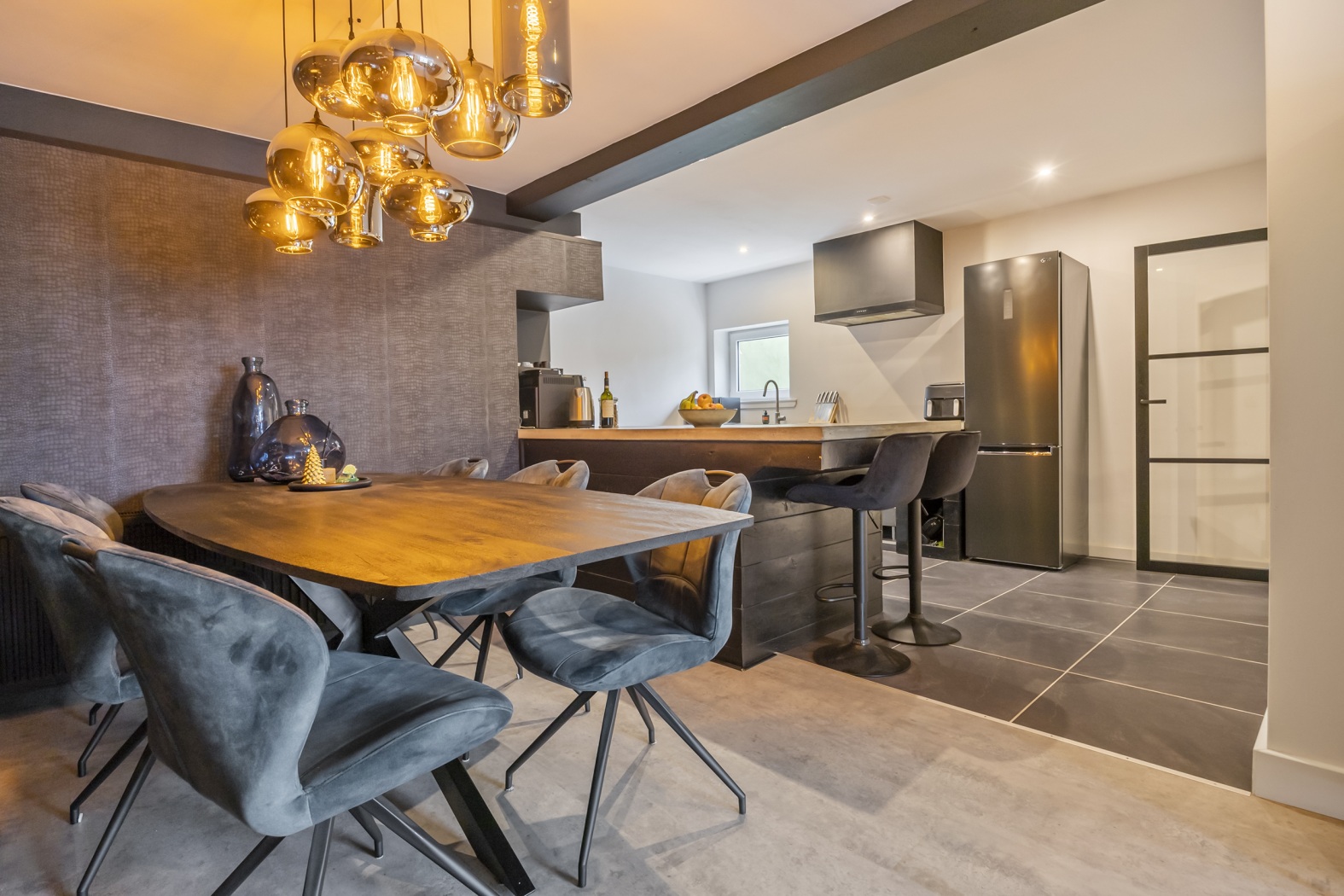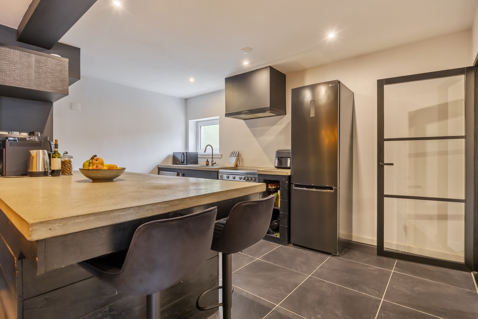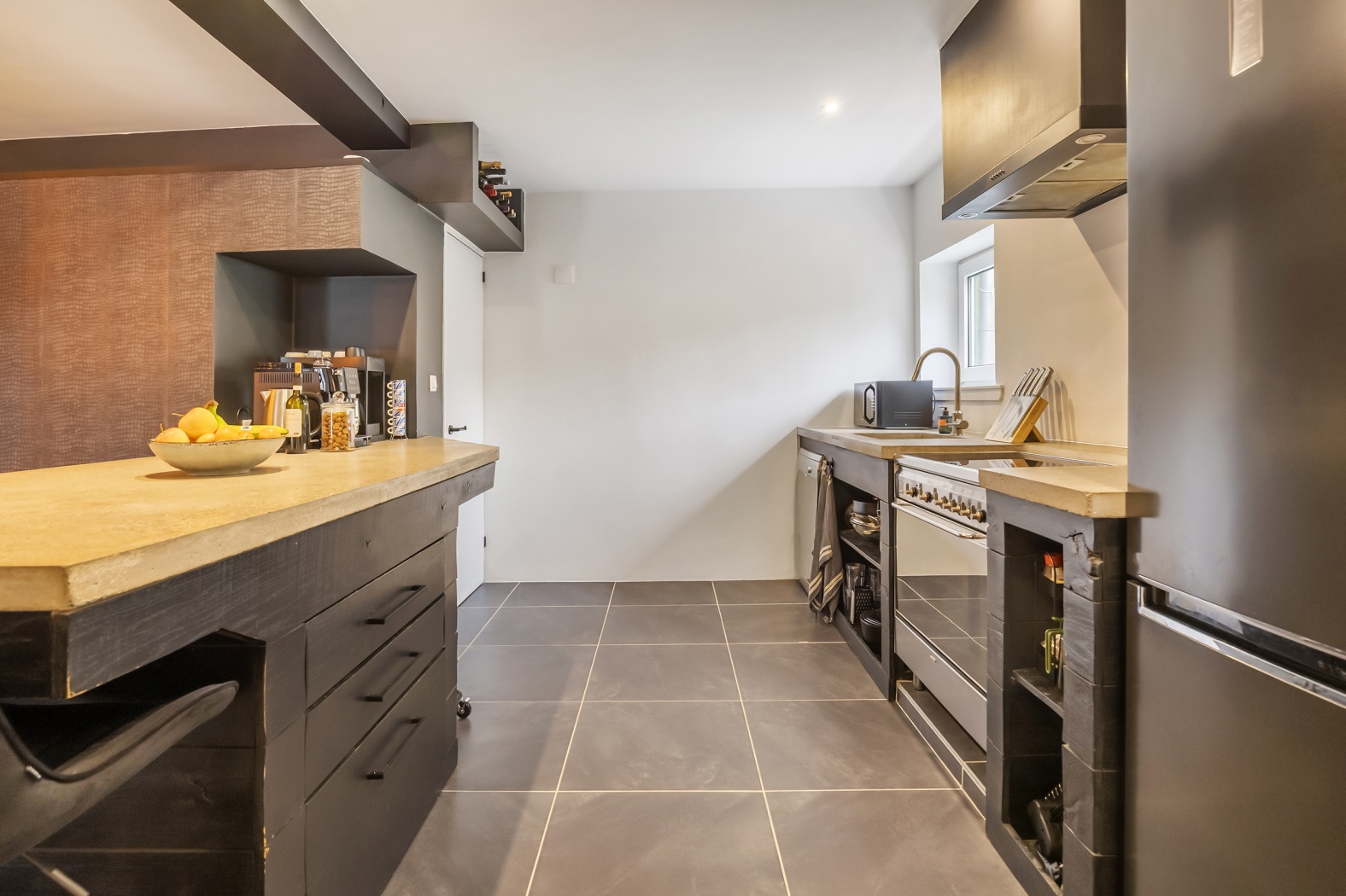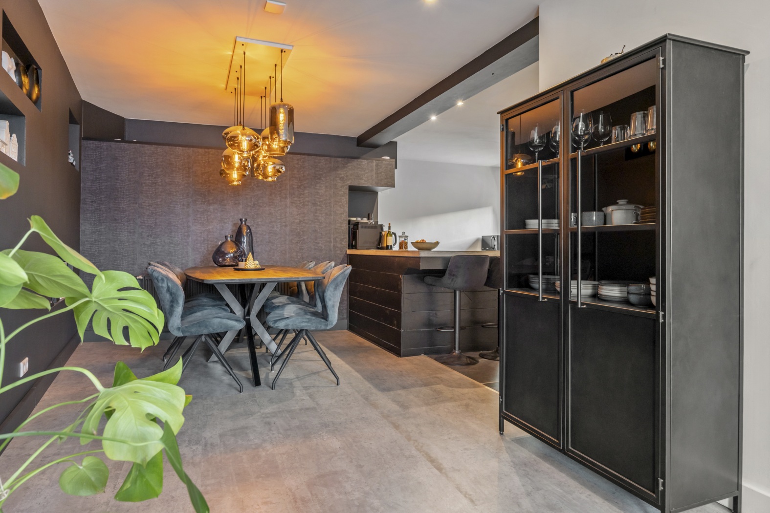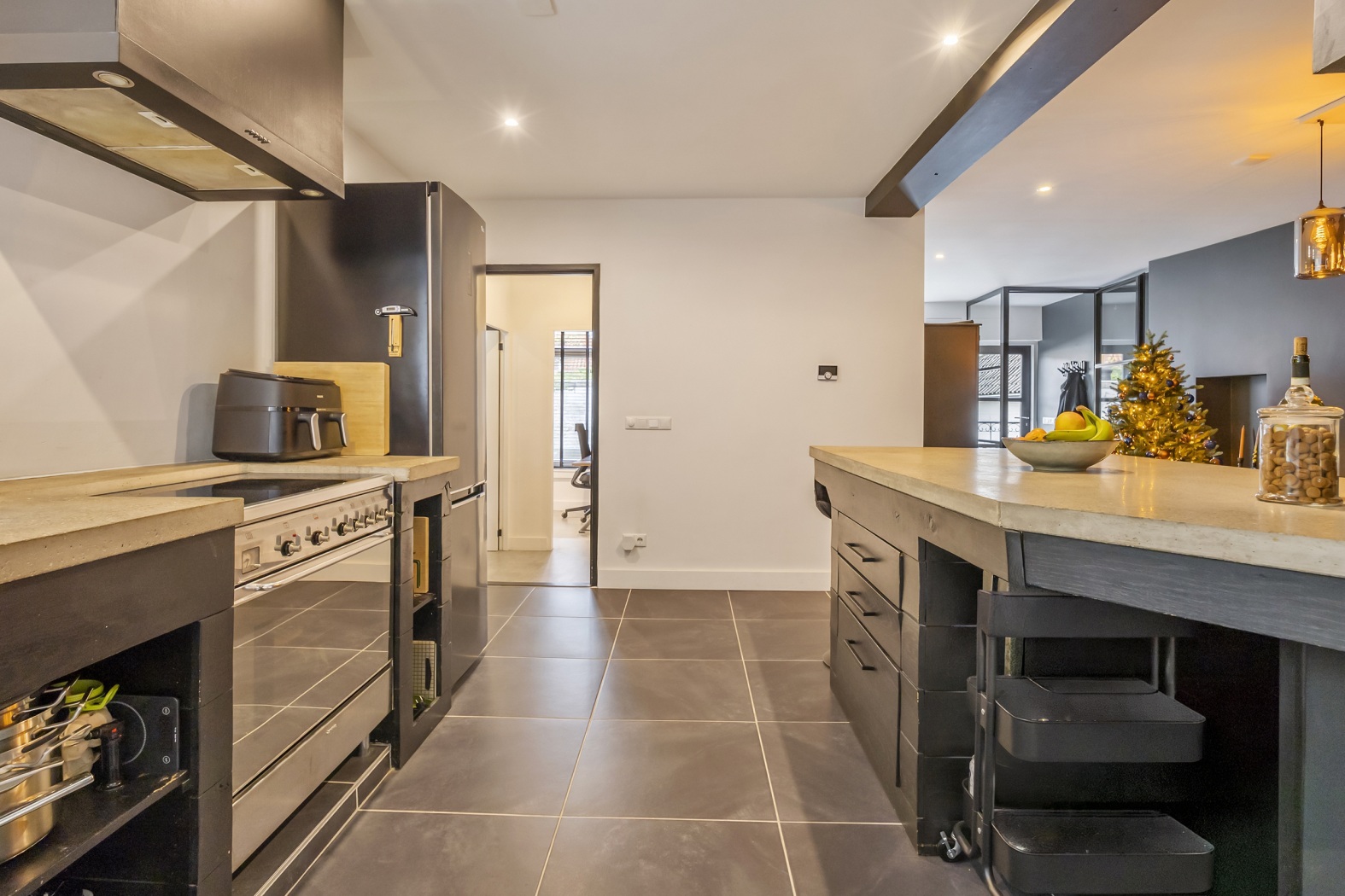 De open, industriële keuken is een echte eyecatcher en voorzien van een robuust werk schiereiland met houten blad, dat tevens dienstdoet als bar met plek voor twee barkrukken – perfect voor een snelle hap of een borrel. De keuken beschikt over diverse inbouwapparatuur, waaronder een stoer fornuis met oven, afzuigschouw, koel-/vriescombinatie en vaatwasser. De combinatie van donkere plavuizen en laminaatvloer geeft de ruimte een eigentijdse en warme uitstraling.