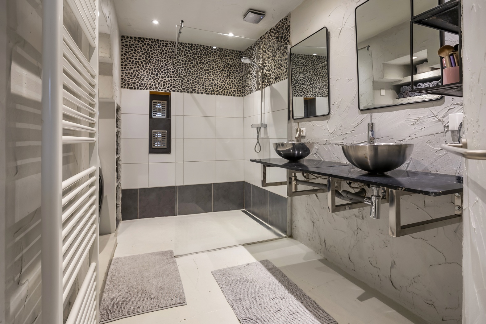 •Moderne badkamer voorzien van inloopdouche, dubbele wastafel, designradiator en aansluitingen voor wasmachine en droger