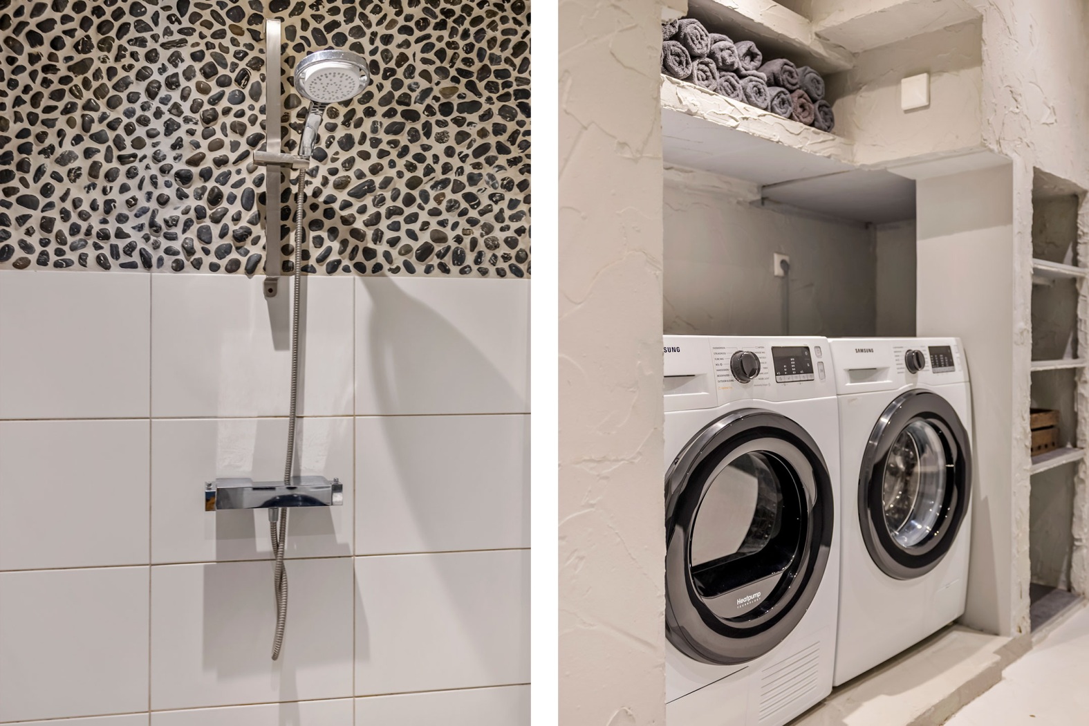 Vanuit de keuken bereik je de royale badkamer, voorzien van een comfortabele inloopdouche, dubbele RVS-waskommen en spiegels boven het wastafelmeubel. Daarnaast zijn er aansluitingen voor zowel een wasmachine als droger, praktisch weggewerkt.