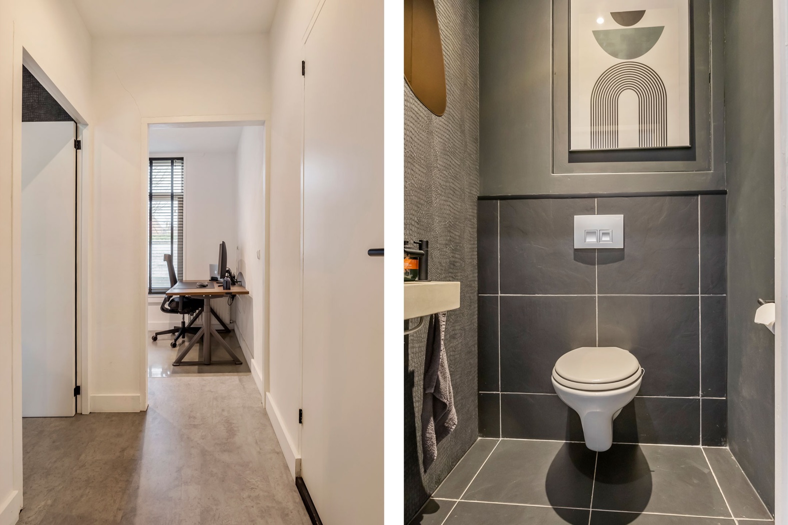 Via een compact halletje met een strakke, moderne toiletruimte – voorzien van een hangend toilet en fonteintje – bereik je de twee slaapkamers.