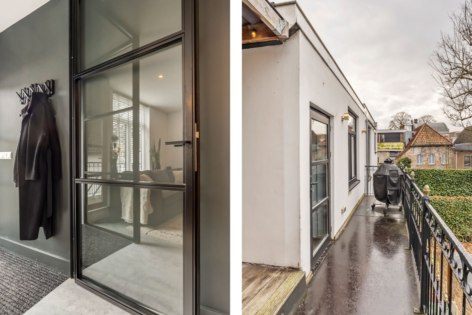 Het balkon, afgezet met een elegante balustrade en verfijnd hekwerk, leidt naar de voordeur. Vanuit het compacte tochtportaal opent een stoere taatsdeur zich naar het woongedeelte.