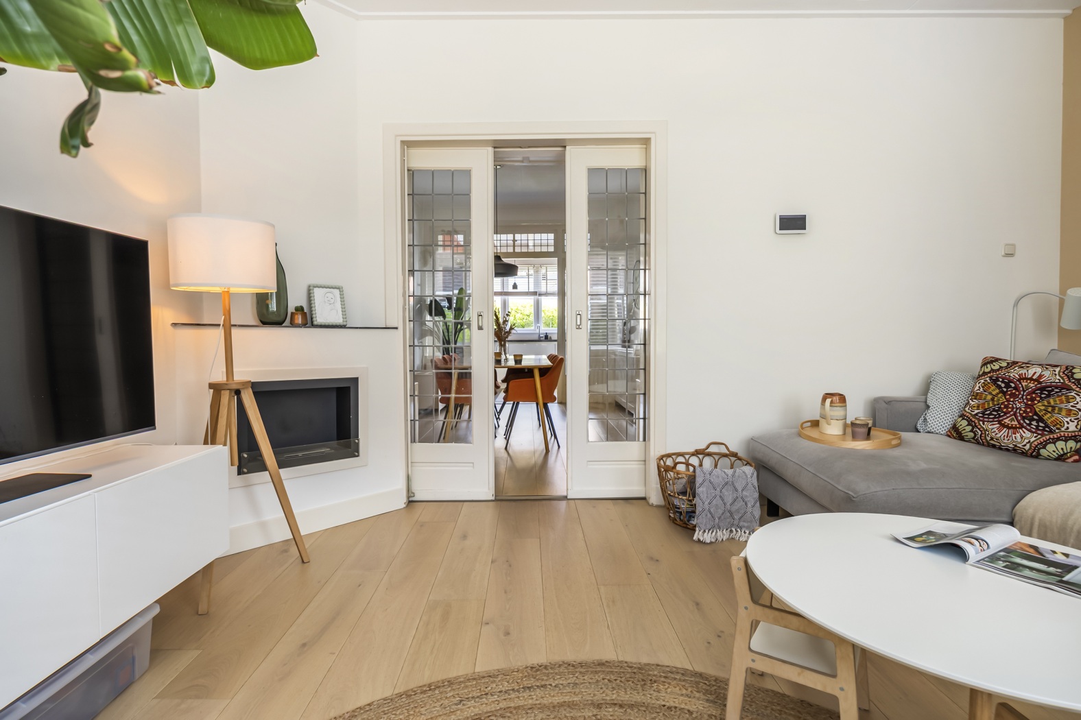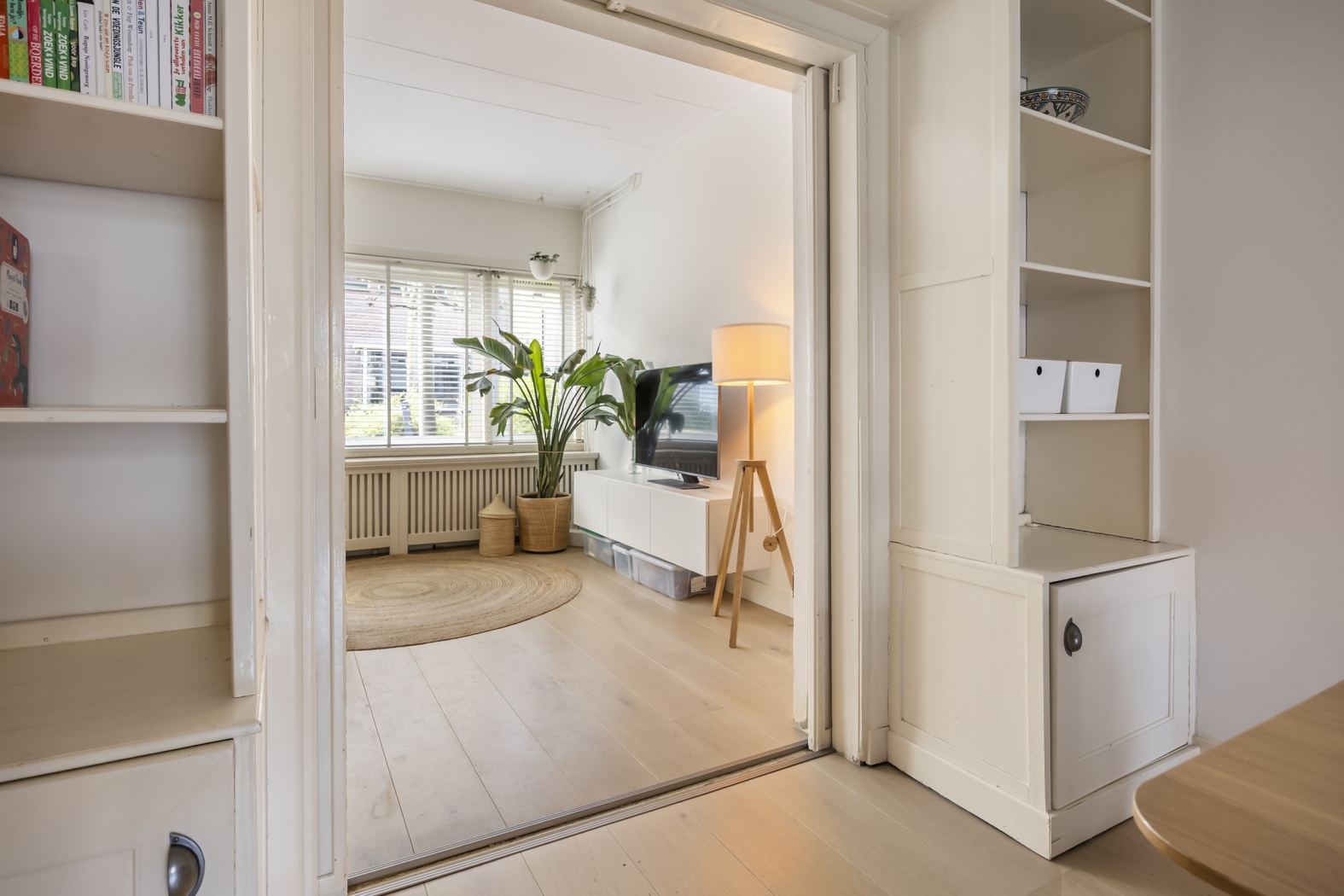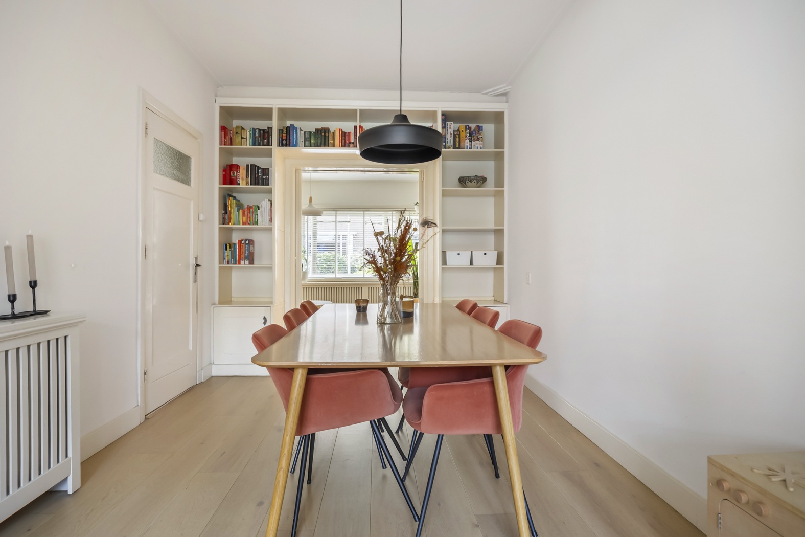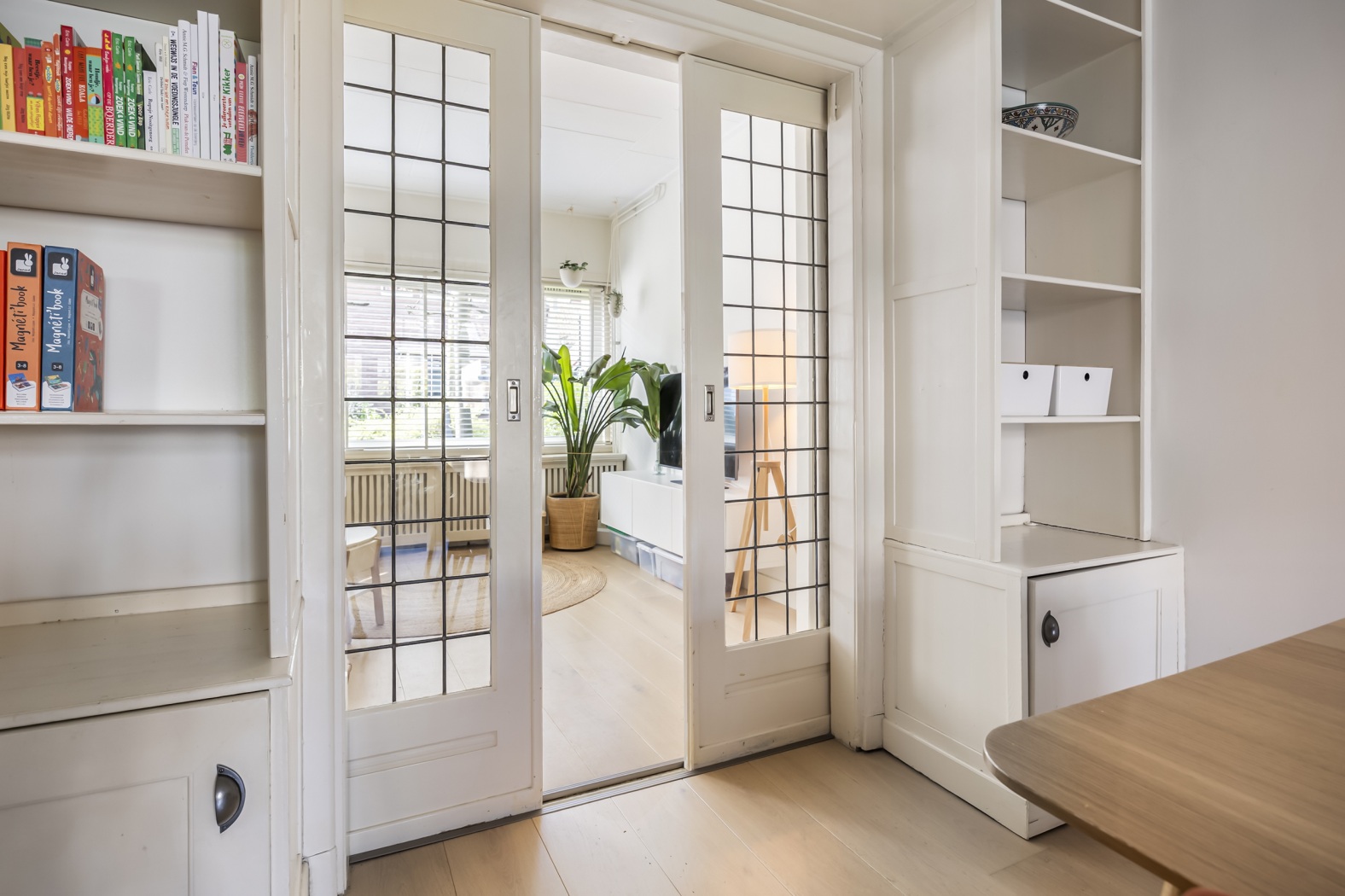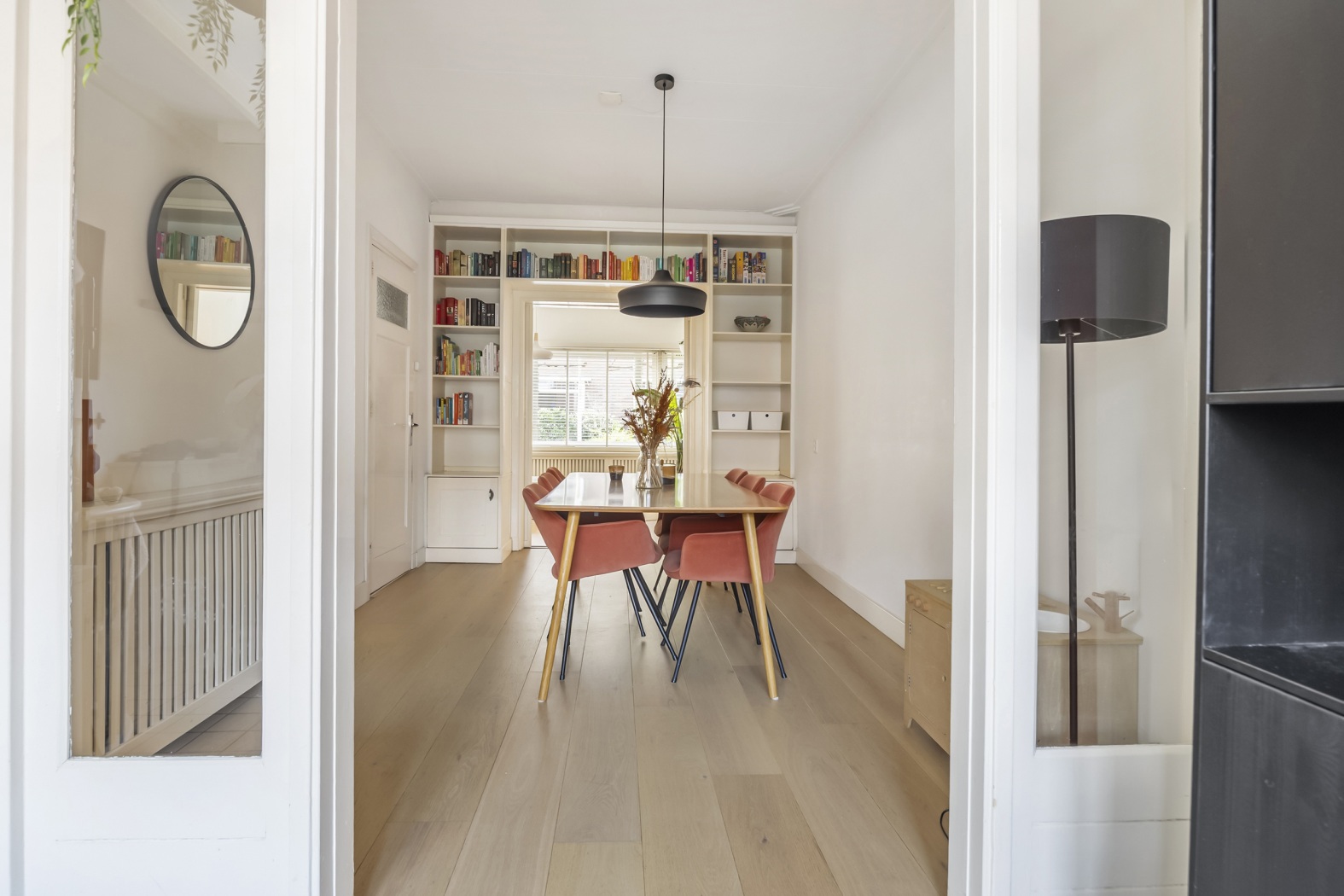 Bij binnenkomst valt direct de warme en uitnodigende uitstraling op. De woonkamer met ensuite eetkamer vormt het hart van de woning en ademt karakter. De erker aan de voorzijde zorgt voor een prettige lichtinval en een open, gezellige sfeer. Dankzij de speelse indeling is er volop ruimte voor zowel een comfortabele zithoek als een ruime eethoek. De authentieke inbouwkasten versterken het jaren ’30 gevoel en zijn bovendien praktisch in gebruik. In beide ruimtes ligt een houten parket vloer, passend bij de sfeer van het huis.