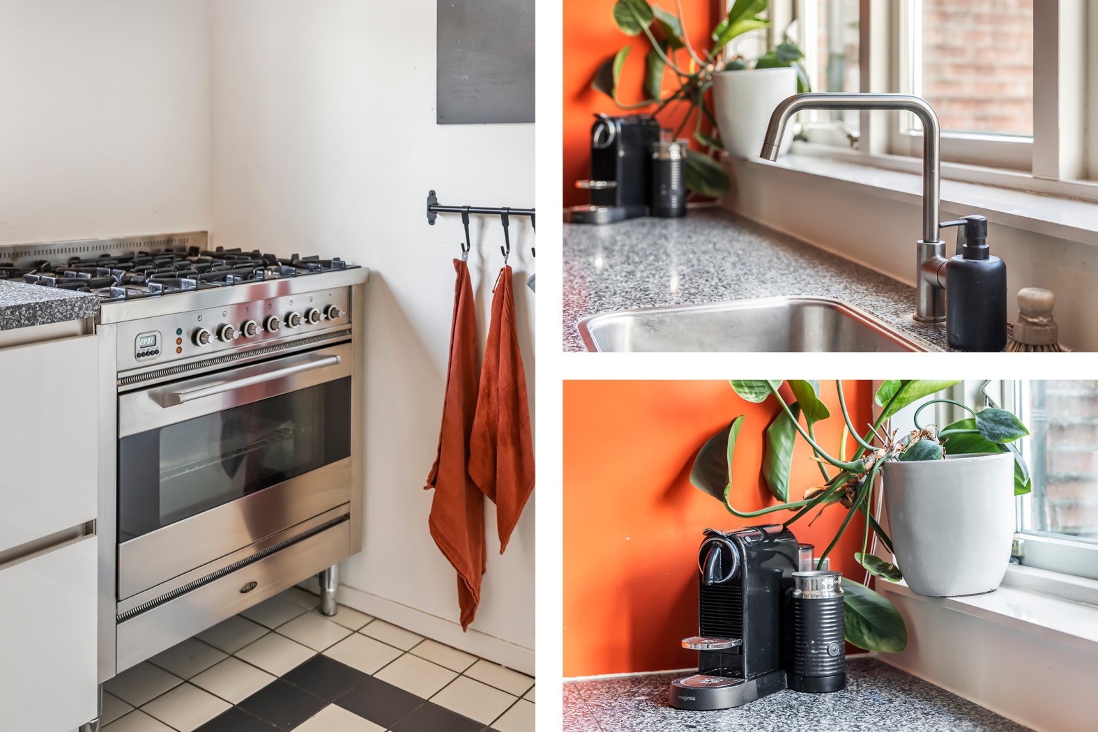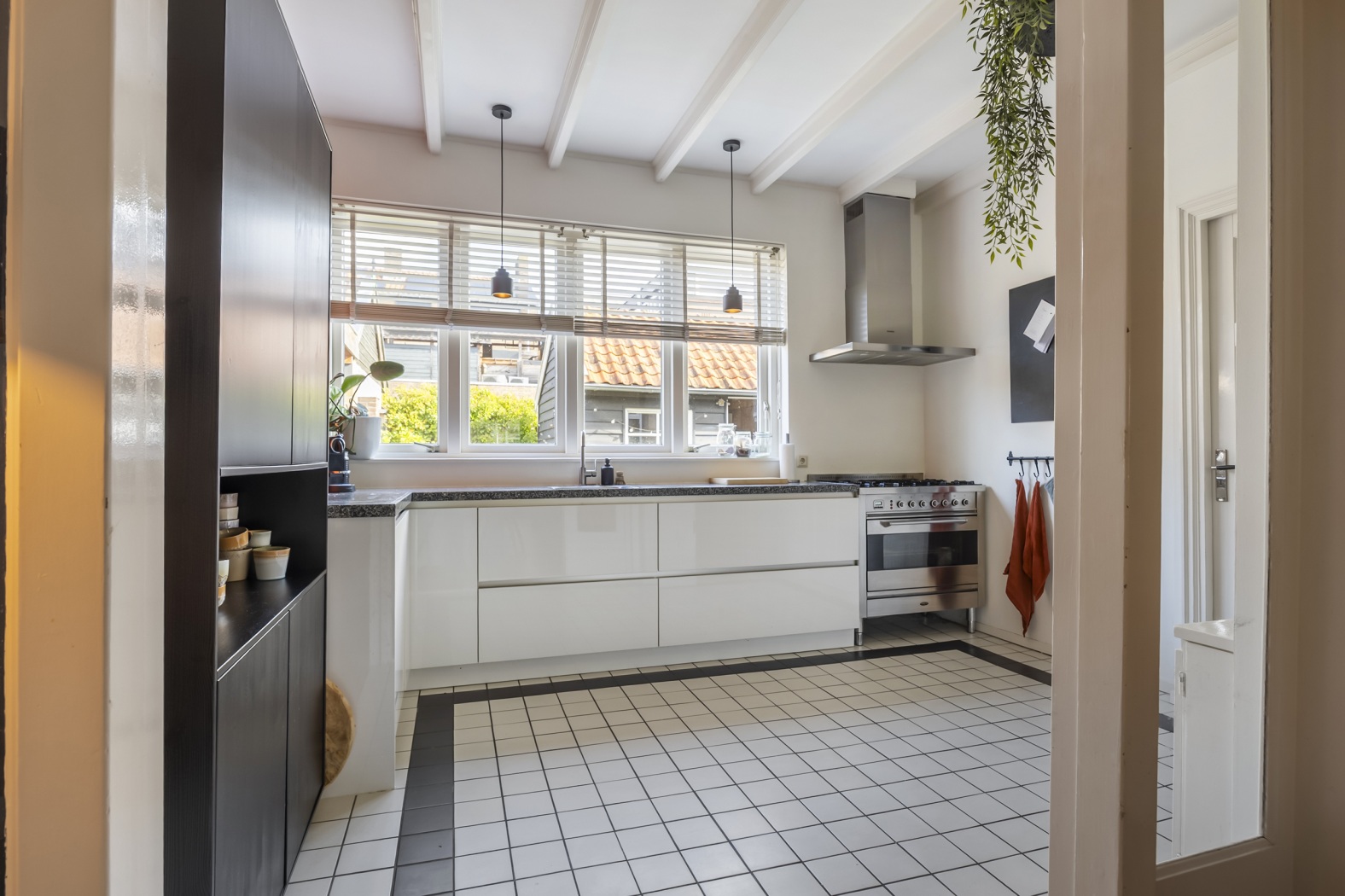 De open keuken sluit naadloos aan op de eetkamer en is modern uitgevoerd. Deze is voorzien van diverse inbouwapparatuur en afgewerkt met een onderhoudsvriendelijke tegelvloer, een fijne plek om te koken en in contact te blijven met het gezin of gasten. De aansluitingen voor wasmachine en droger zijn netjes weggewerkt in de bijkeuken, waar ook meteen veel opbergruimte is.