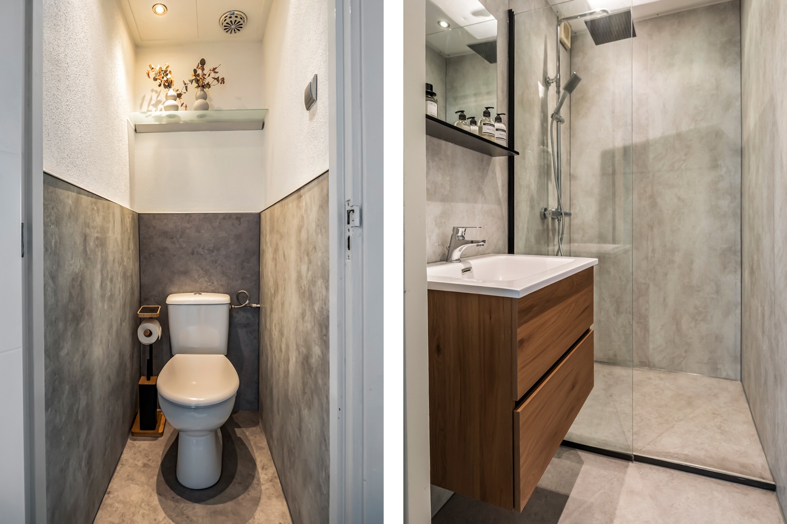 Via de hal bereik je zowel de badkamer als het separate toilet praktisch en logisch naast elkaar gesitueerd. De badkamer is volledig betegeld in een moderne stijl en uitgerust met een eigentijds wastafelmeubel met spiegelkast. De ruime inloopdouche, voorzien van zowel een regendouche als handdouche, maakt dit een heerlijke plek om de dag fris te beginnen of juist ontspannen af te sluiten.
