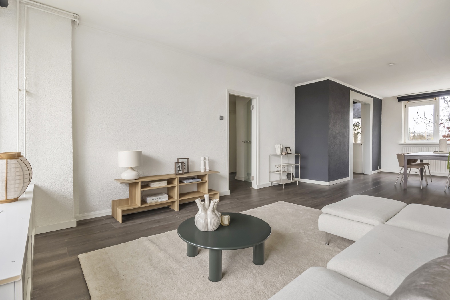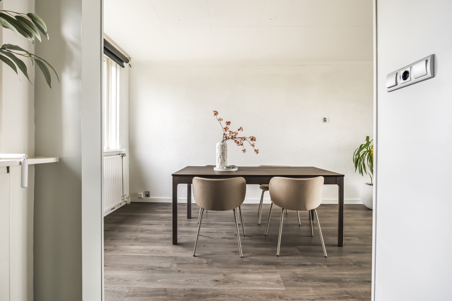 Via de glasdeur vanuit de hal stap je binnen in de woonkamer (32,5 m²), waar direct een warme en uitnodigende sfeer voelbaar is. De lichte wanden en nette laminaatvloer zorgen voor een frisse, open uitstraling. Er is volop ruimte voor een gezellige eethoek en een comfortabele zithoek: perfect voor ontspannen avonden in “Netflix-modus”.