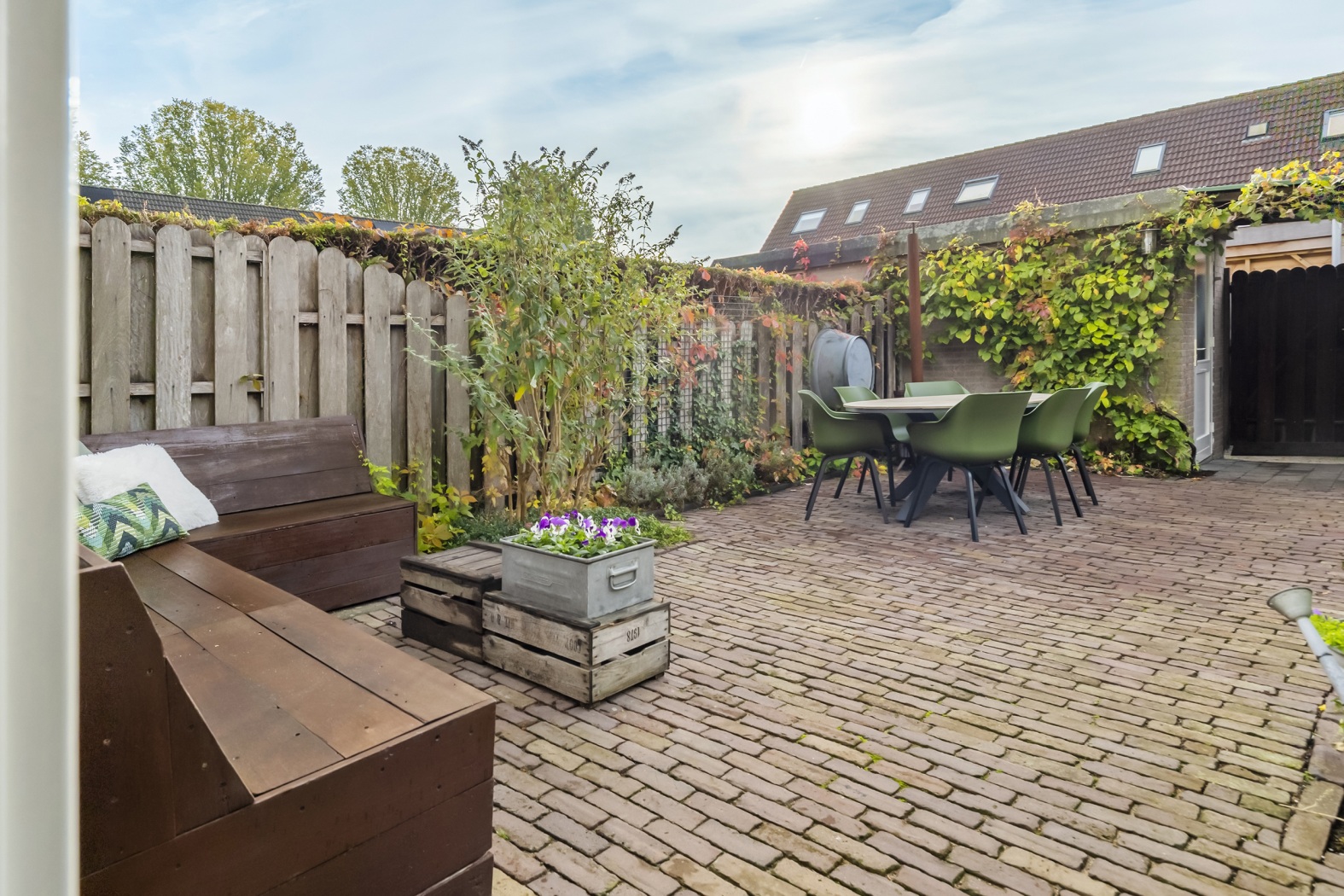 De onderhoudsvriendelijke achtertuin ligt heerlijk op het zuiden. De tuin is aangelegd met fraaie klinkerbestrating en groene borders. Achterin staat een praktische stenen berging en via de poort bereik je direct de brandgang. De schuttingen zorgen voor volop privacy en aan de achtergevel bevindt zich een zonnescherm dat tijdens zonnige dagen voor aangename schaduw zorgt.