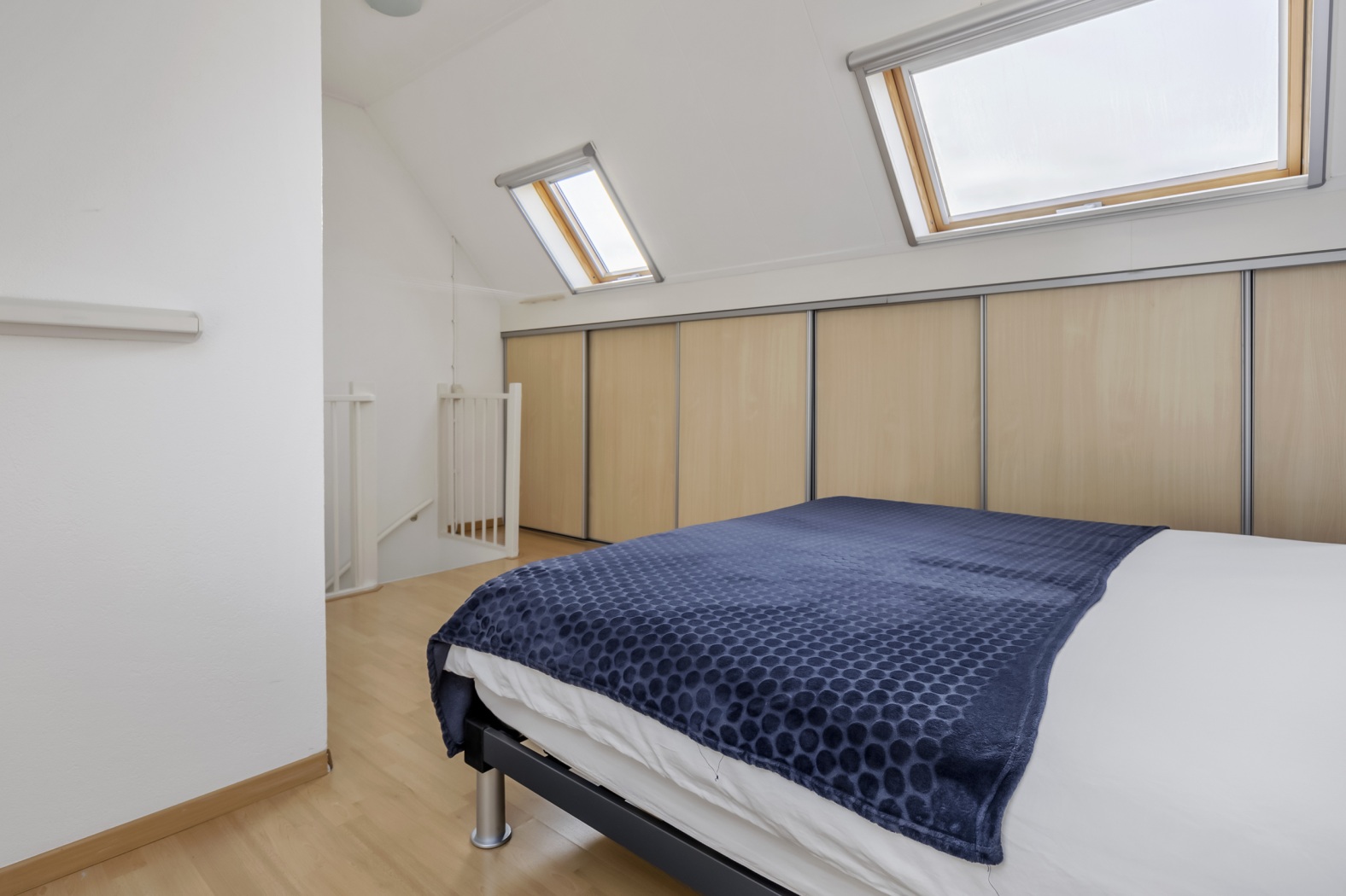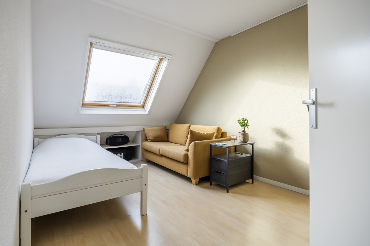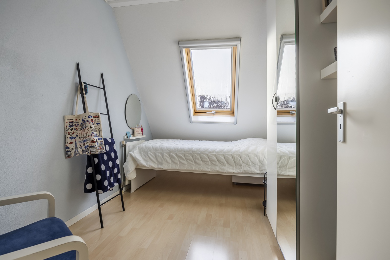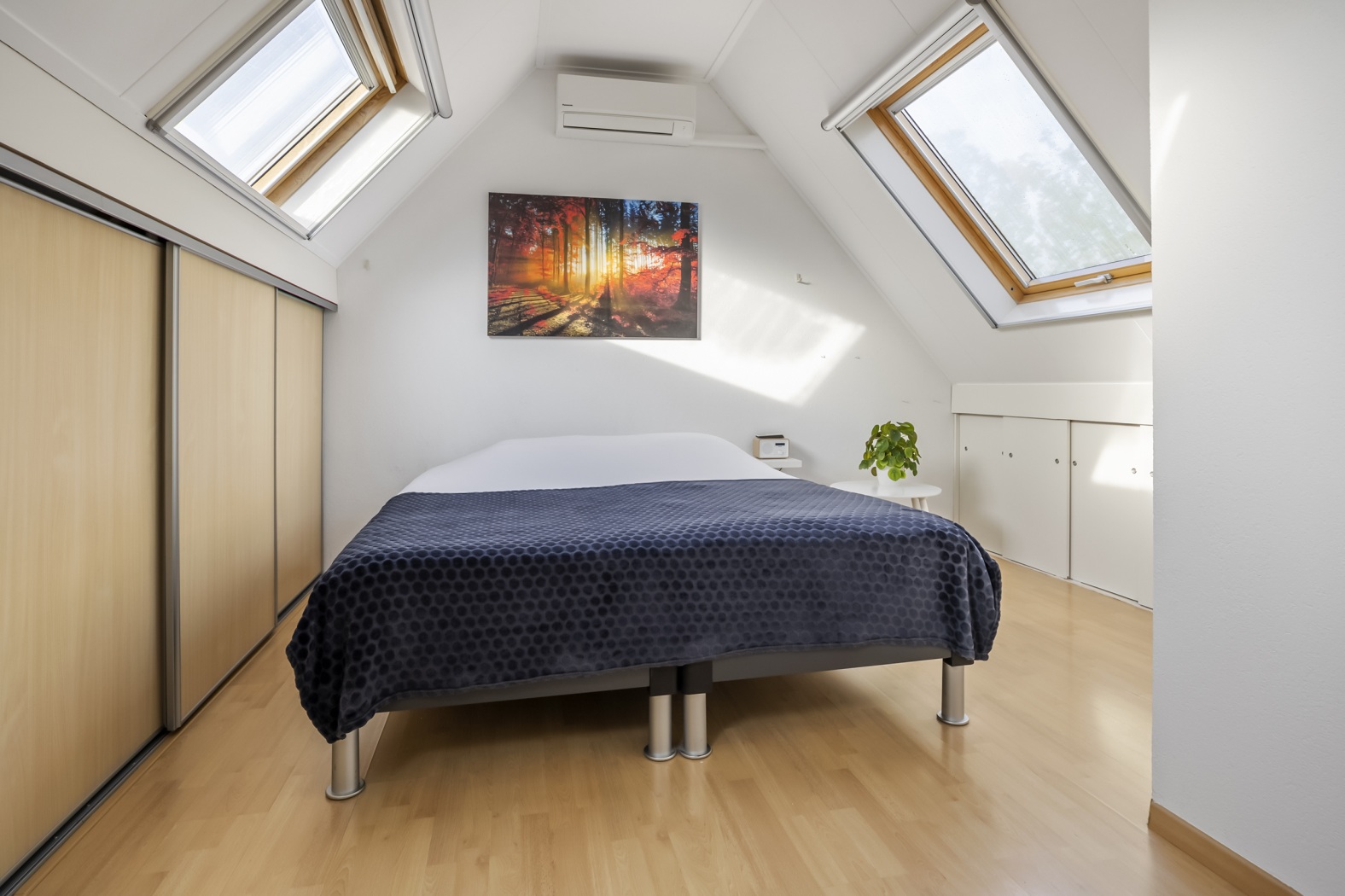 De tweede verdieping vormt een volwaardige woonlaag en biedt een ruime vierde slaapkamer die uitstekend dienst kan doen als masterbedroom. Dankzij de drie dakramen profiteer je hier van veel lichtinval en in de warmere maanden zorgt de airconditioning voor een aangename temperatuur. Achter de schuifdeuren aan beide zijden bevindt zich praktische bergruimte. Daarnaast is er een aparte ruimte met de opstelplaats voor de cv-installatie en aansluitingen voor de wasmachine en droger.