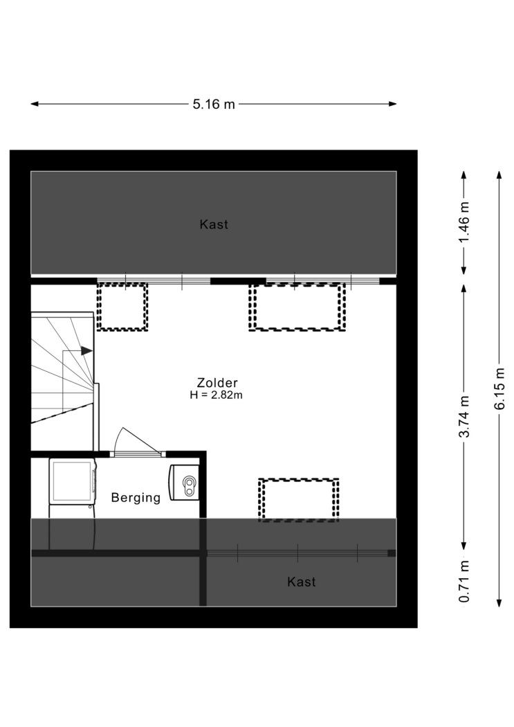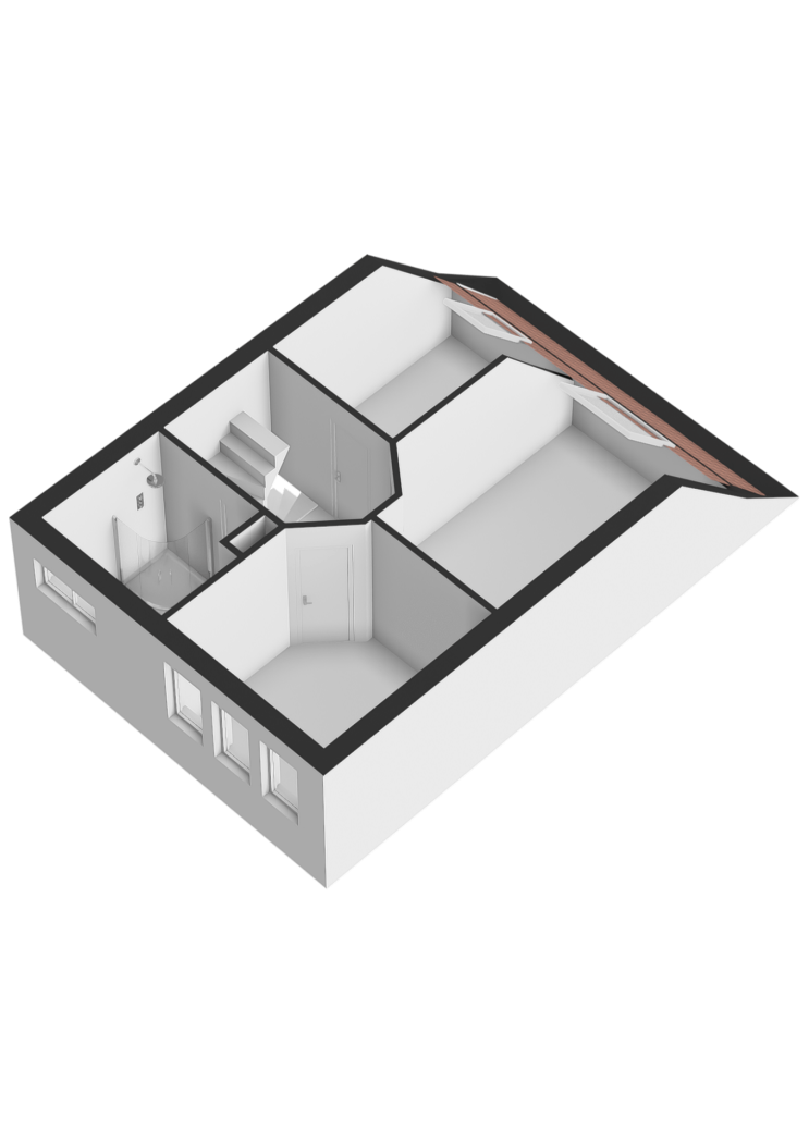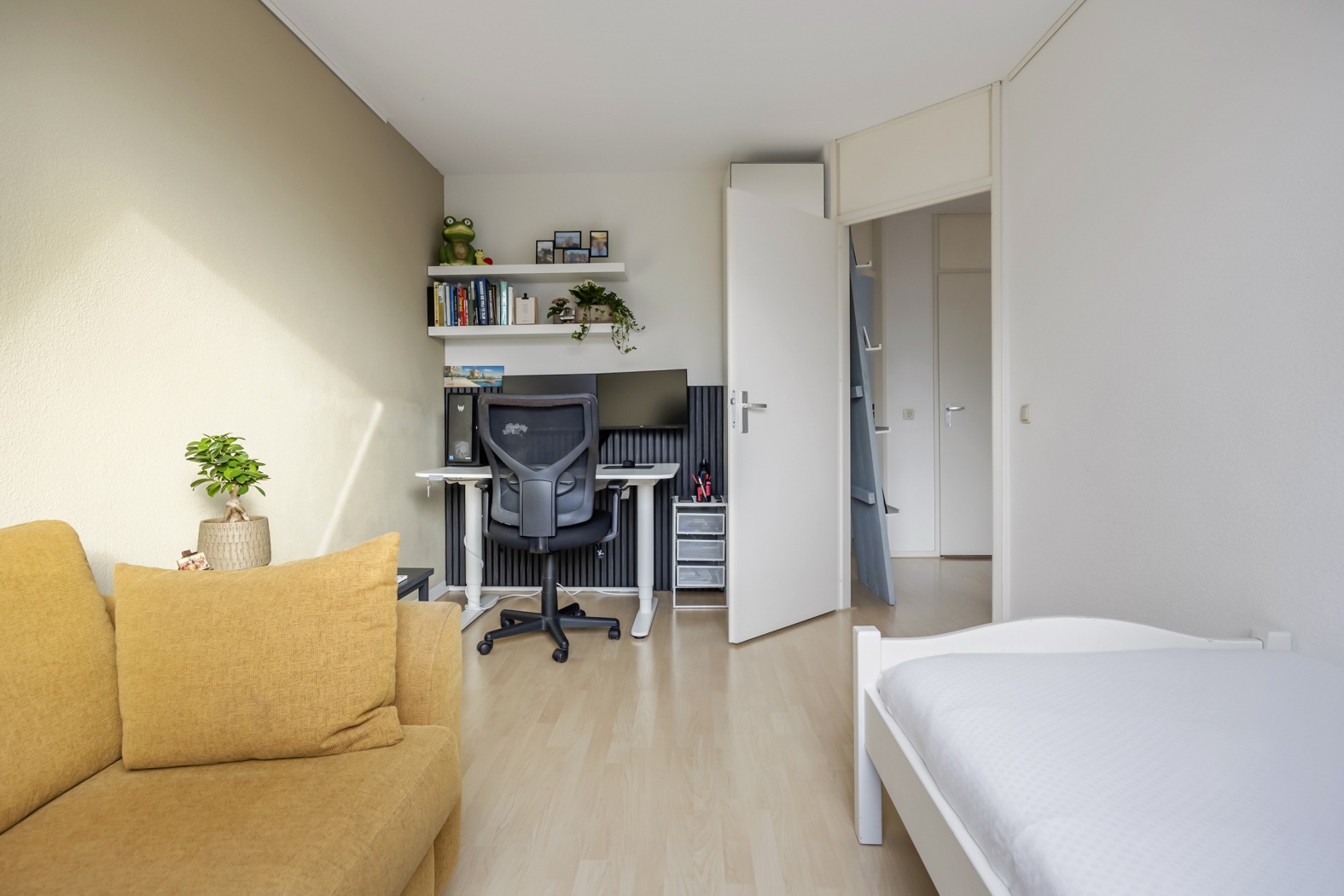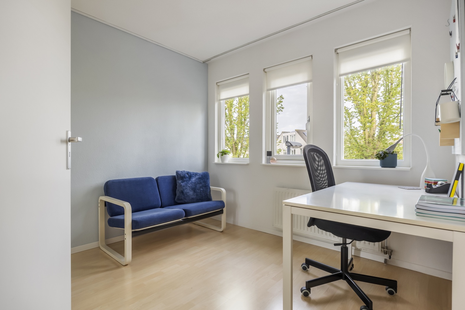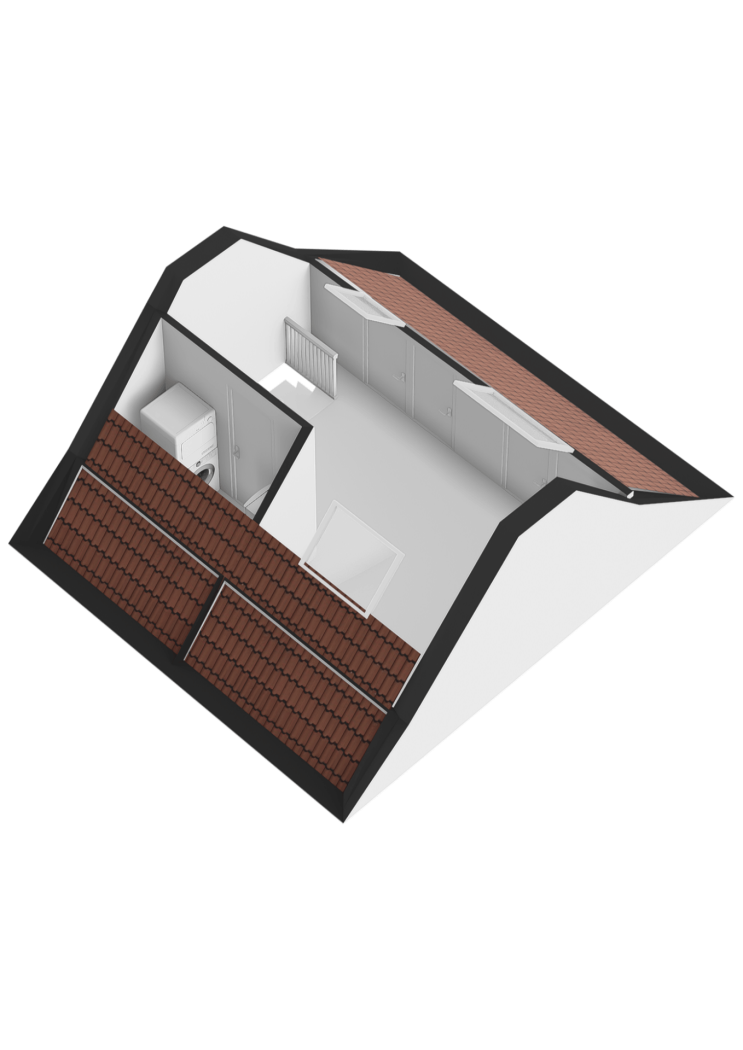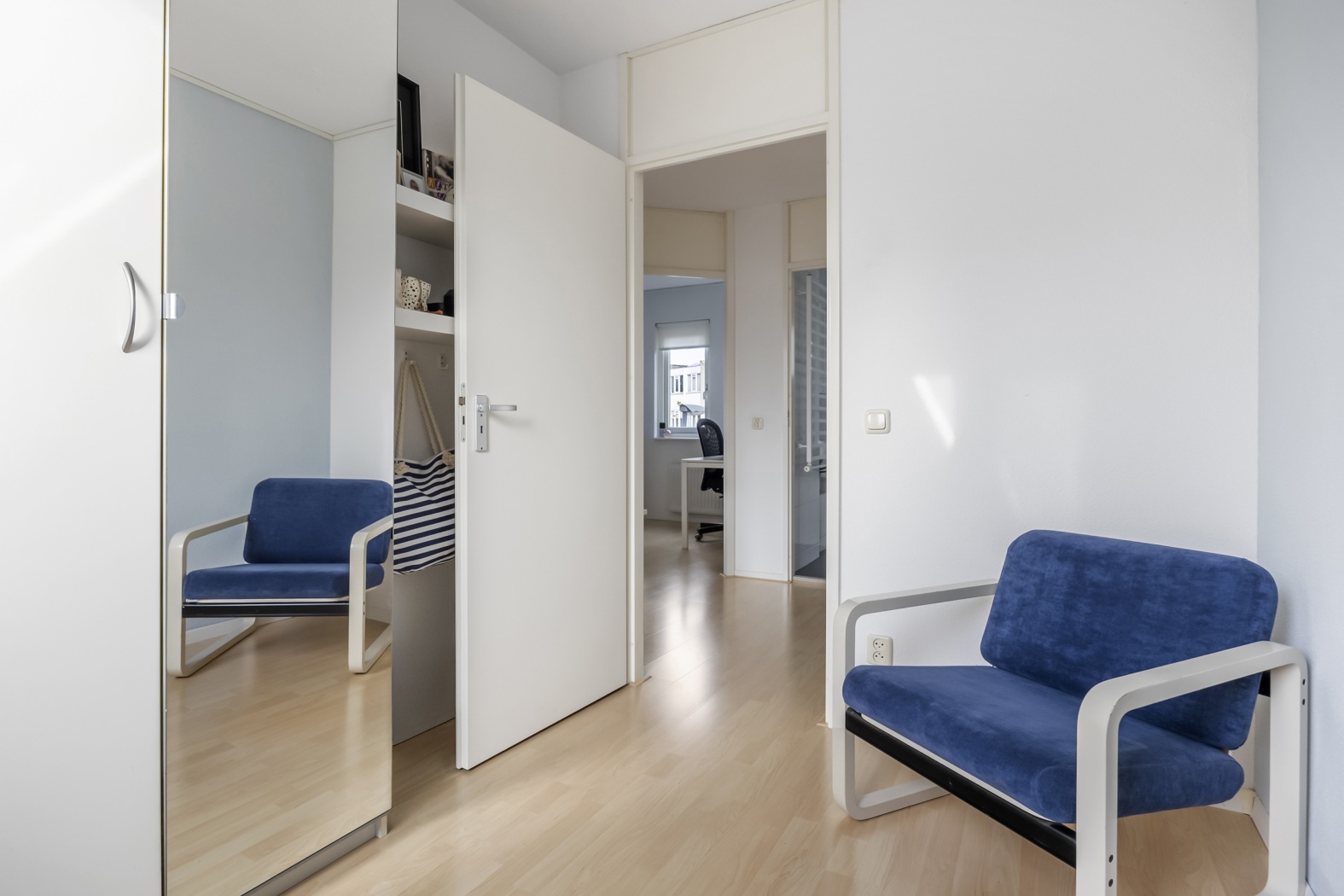 De tweede verdieping vormt een volwaardige woonlaag en biedt een ruime vierde slaapkamer die uitstekend dienst kan doen als masterbedroom. Dankzij de drie dakramen profiteer je hier van veel lichtinval en in de warmere maanden zorgt de airconditioning voor een aangename temperatuur. Achter de schuifdeuren aan beide zijden bevindt zich praktische bergruimte. Daarnaast is er een aparte ruimte met de opstelplaats voor de cv-installatie en aansluitingen voor de wasmachine en droger.