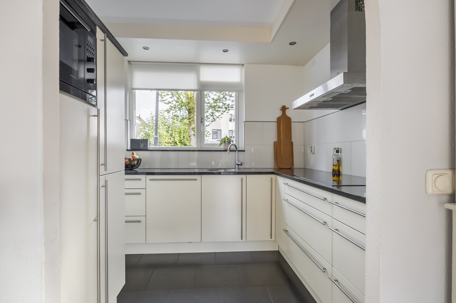 De keuken aan de voorzijde staat in open verbinding met de woonkamer via een stijlvolle toog. Je kijkt hier leuk uit over de straat en de singel. De moderne keuken is uitgevoerd met witte kastfronten in een praktische hoekopstelling, aangevuld met een hoge apparatenkast. Je beschikt over alle benodigde inbouwapparatuur, zoals een inductiekookplaat, rvs-afzuigkap, combi-oven, koelkast en vaatwasmachine. In het plafond zijn spotjes geïntegreerd en op de vloer liggen plavuizen, wat zorgt voor een frisse en onderhoudsvriendelijke afwerking.