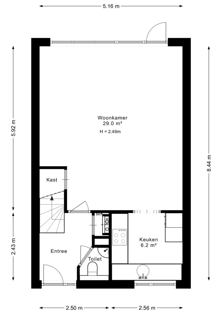 De entree met luifel verleent toegang tot de woonkamer, de toiletruimte, de meterkast en de trapopgang naar de verdieping.