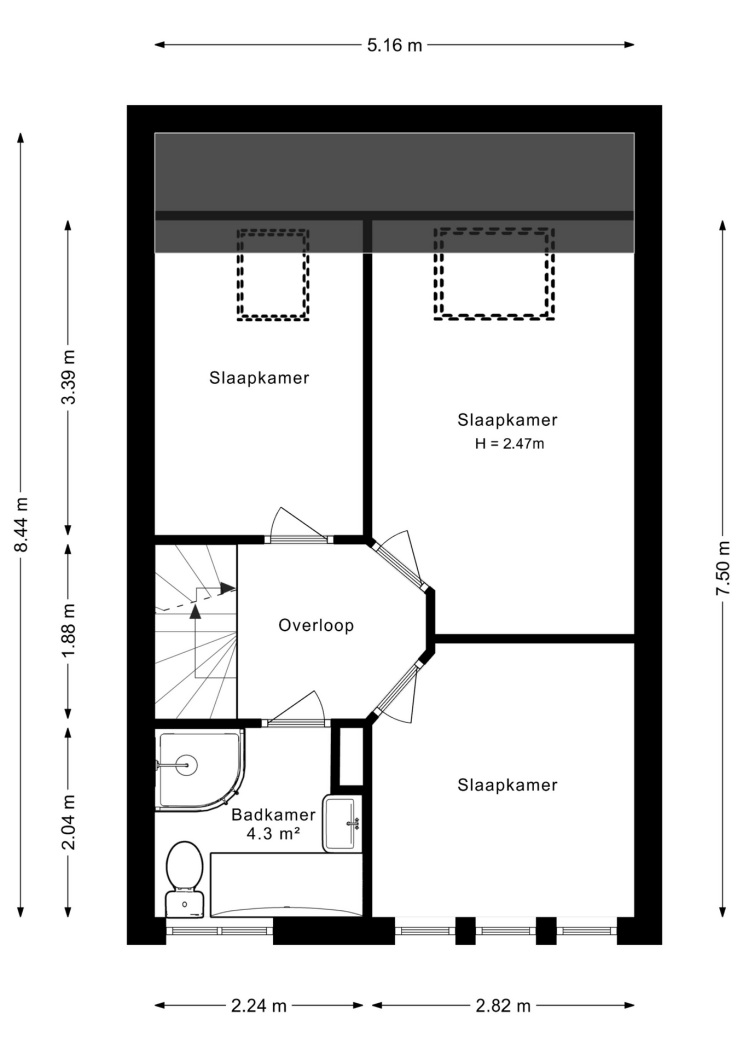 Op de eerste verdieping bevinden zich drie goed bemeten slaapkamers 1 aan de voorzijde met drie lichtramen en 2 aan de achterzijde met dakramen.
