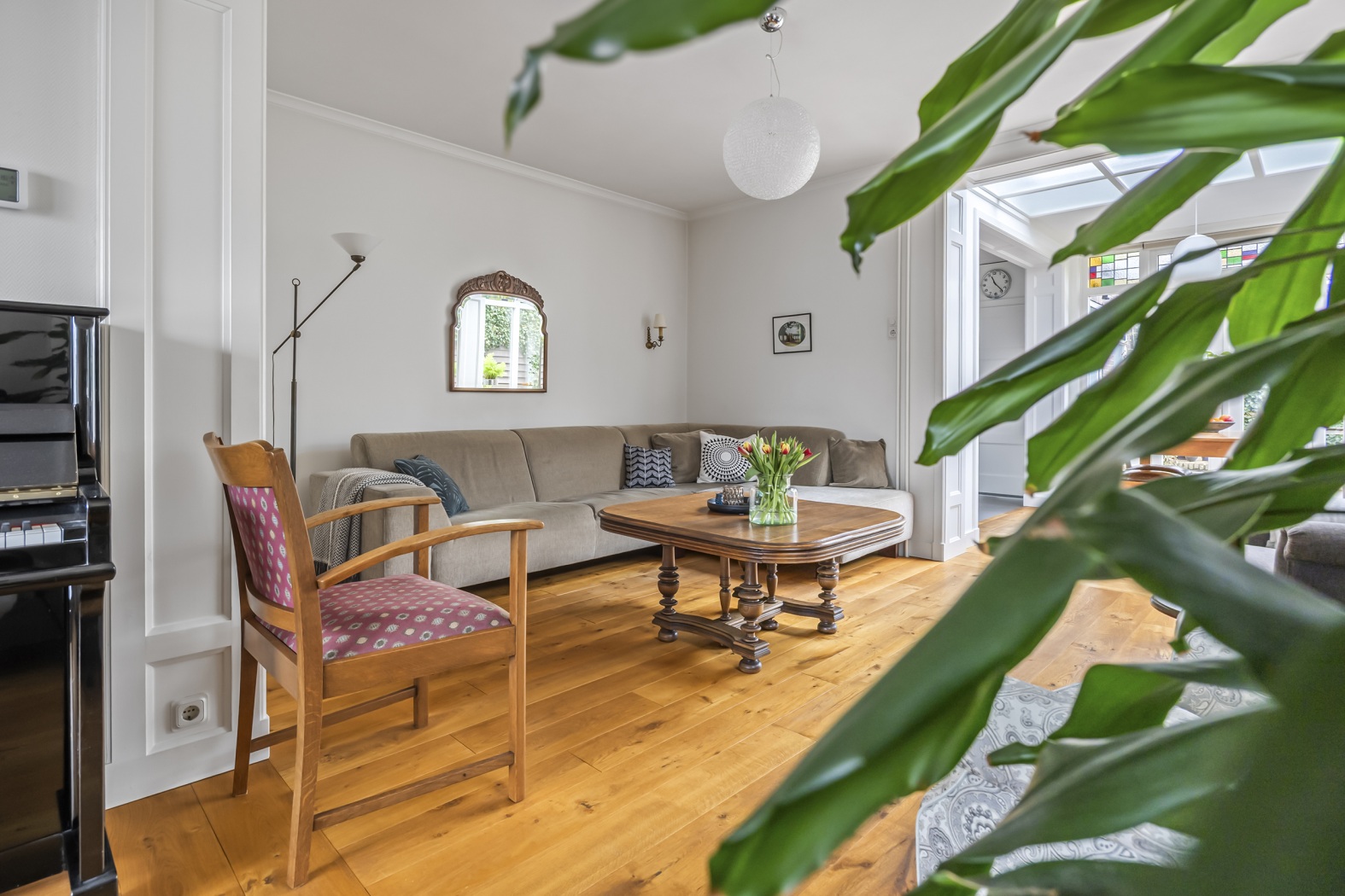 Met oog voor de jaren dertig kenmerken is deze woning onderhouden, verbouwd en verbeterd. Hoge plinten, platstukken, houten kraaldelen, getimmerde vensterbanken, paneeldeuren, houten boeiboorden met zinken kraallat, massief eikenvloeren; je vindt ze hier. Glas-in-lood zit overal in dubbel glas; dat scheelt een hoop tocht!