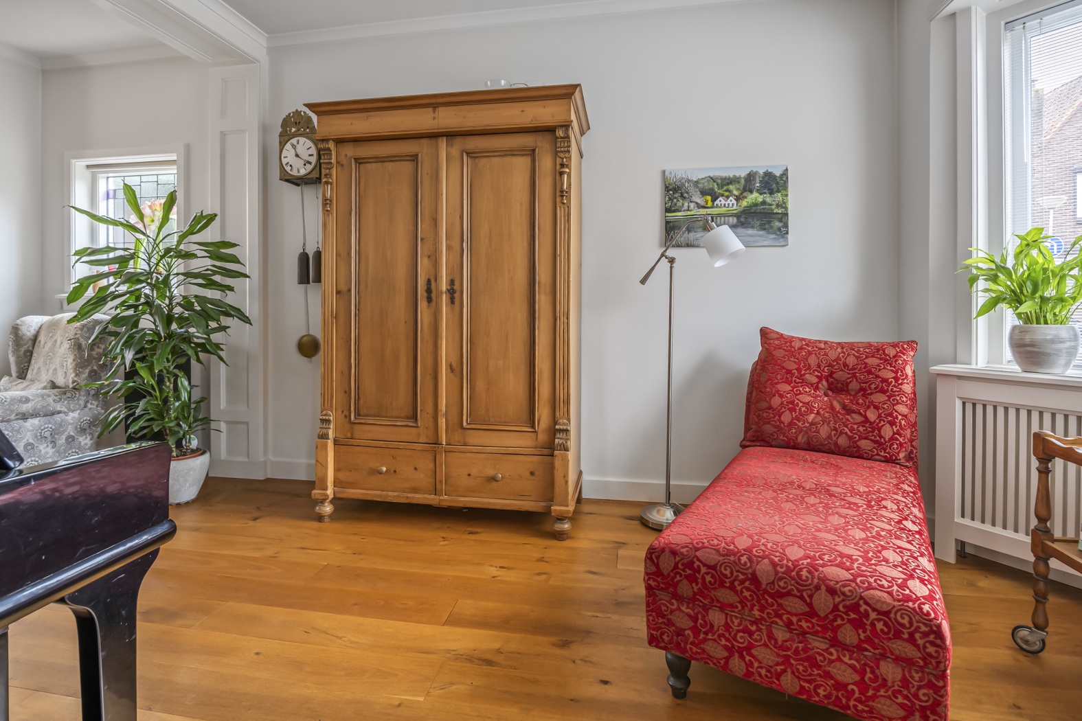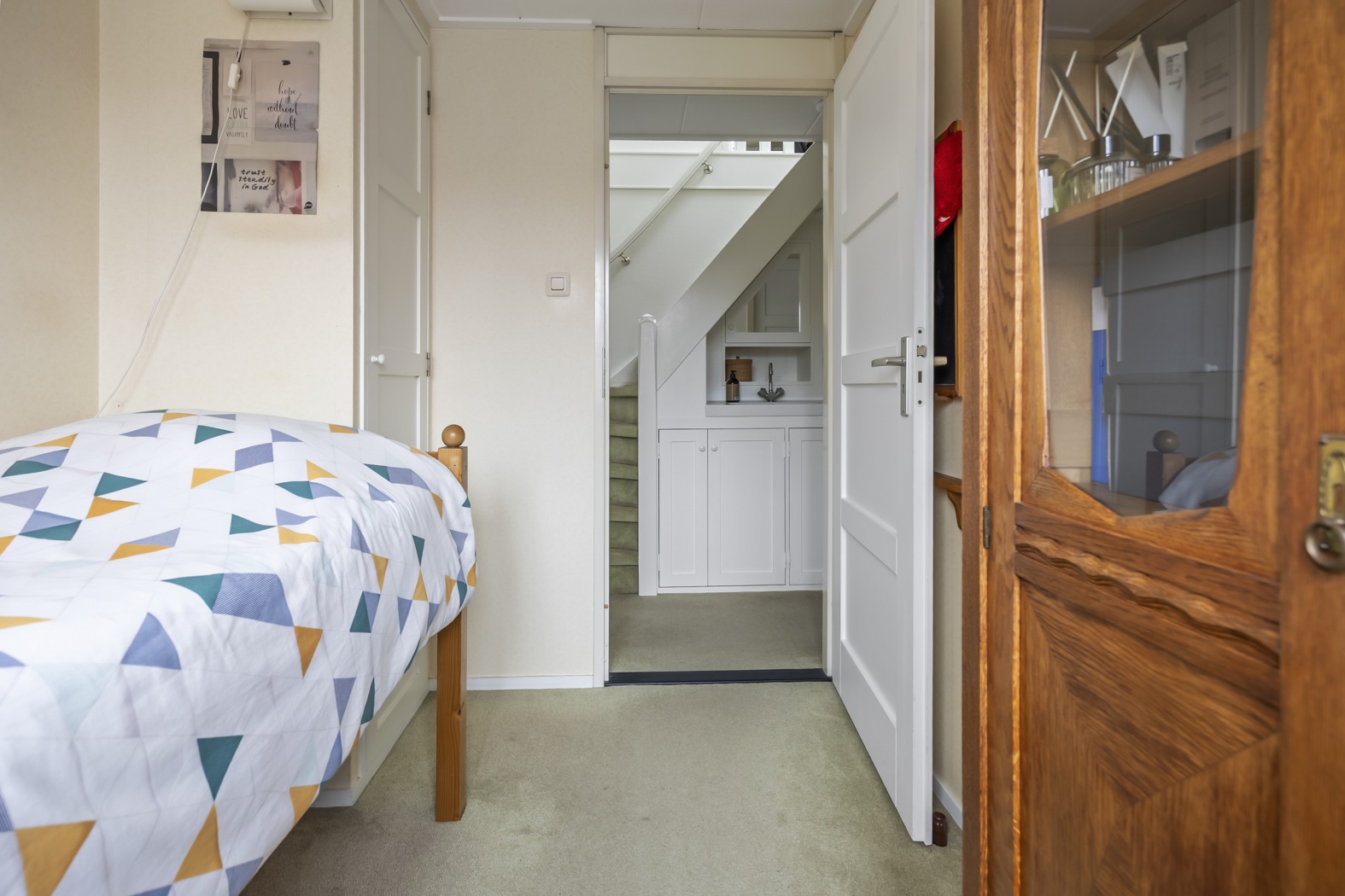 Door de hele woning heen zijn mooie vaste kasten. Van beneden tot boven. We noemen bijvoorbeeld een praktische opbergkast in de gang, een kledingkast op élke slaapkamer en niet te vergeten: een stijlvolle getimmerde boekenkast in de woonkamer met verstelbare planken.