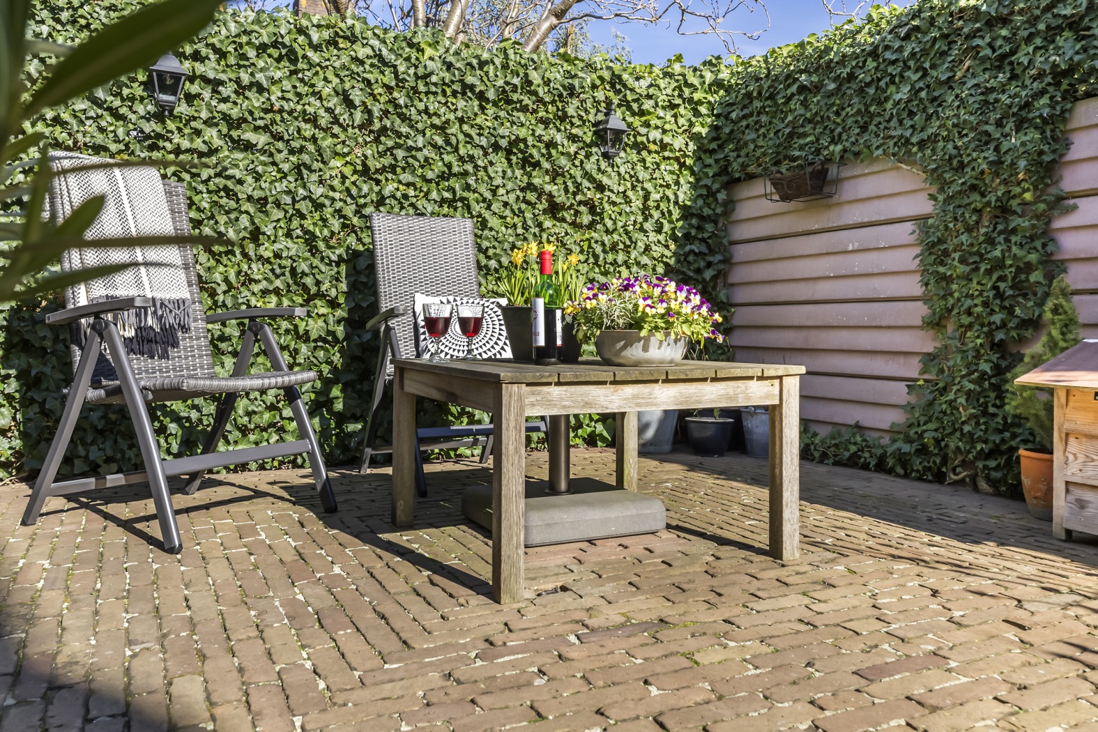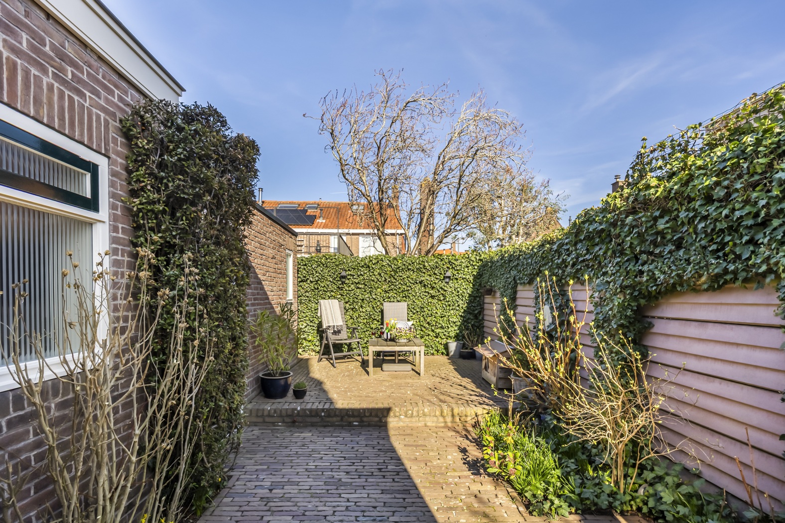 Via de geheel openslaande deuren kom je in de achtertuin met vaste planten en struiken. De bestrating, aangelegd in 2005, bestaat uit oude, gebakken klinkers. Insiders weten dat je in deze wijk je tuin nooit hoeft op te hogen; hoe fijn is dat? Een onderhoudsvrije betonnen schutting is deels begroeid met winterhard groen. Je vindt hier ook drie buitenstopcontacten en gezellige tuinverlichting op het terras.