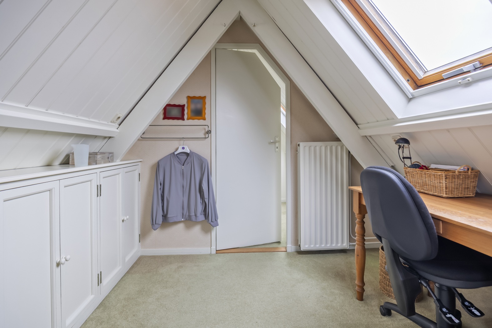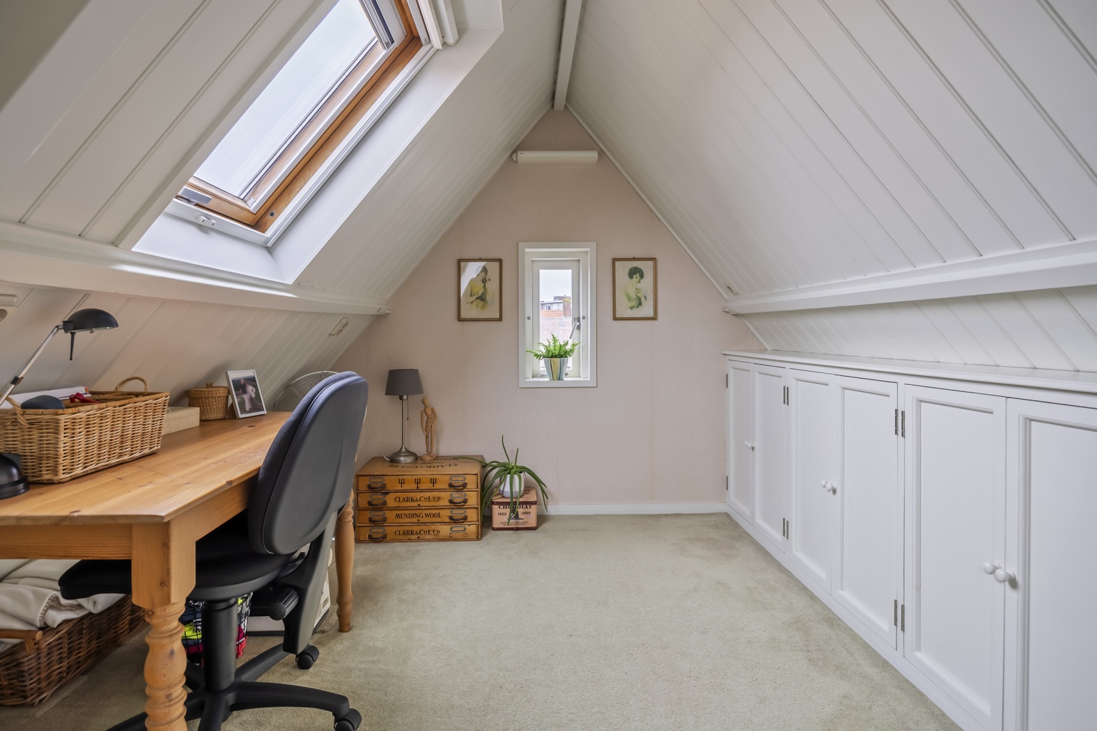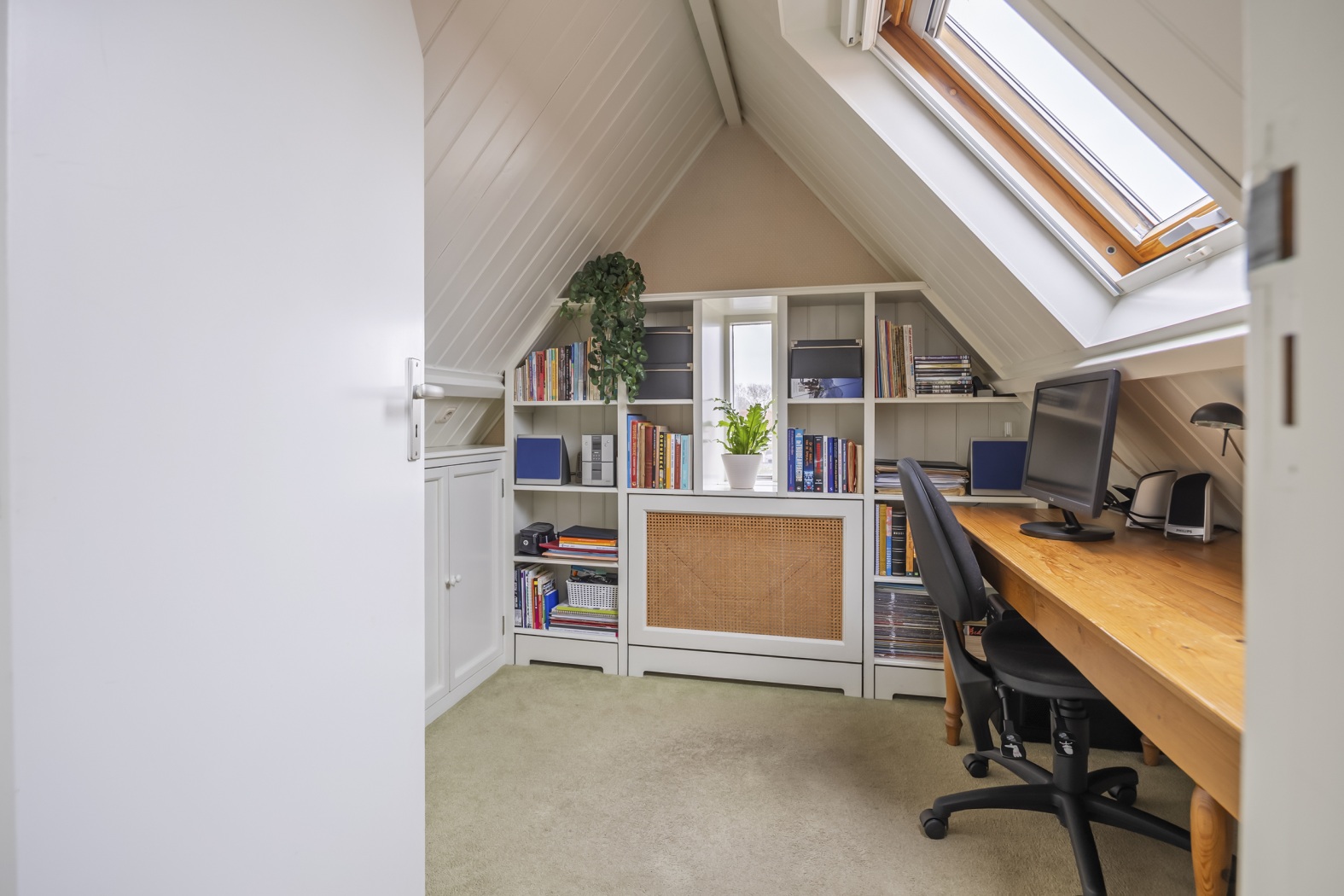 De vaste trap naar zolder brengt je naar een voorzolder met aan elke zijde een kamer. De voorste ingericht als thuiswerkplek met bedraad internet, een vaste boekenkast om het voorraam heen getimmerd en volop ruimte onder een schuine zijde. De was drogen of strijken kan op de achterste kamer. Extra daglicht op je werk? Daar zorgen drie Velux dakvensters voor die helemaal naar buiten opengaan zodat jij je hoofd niet stoot.