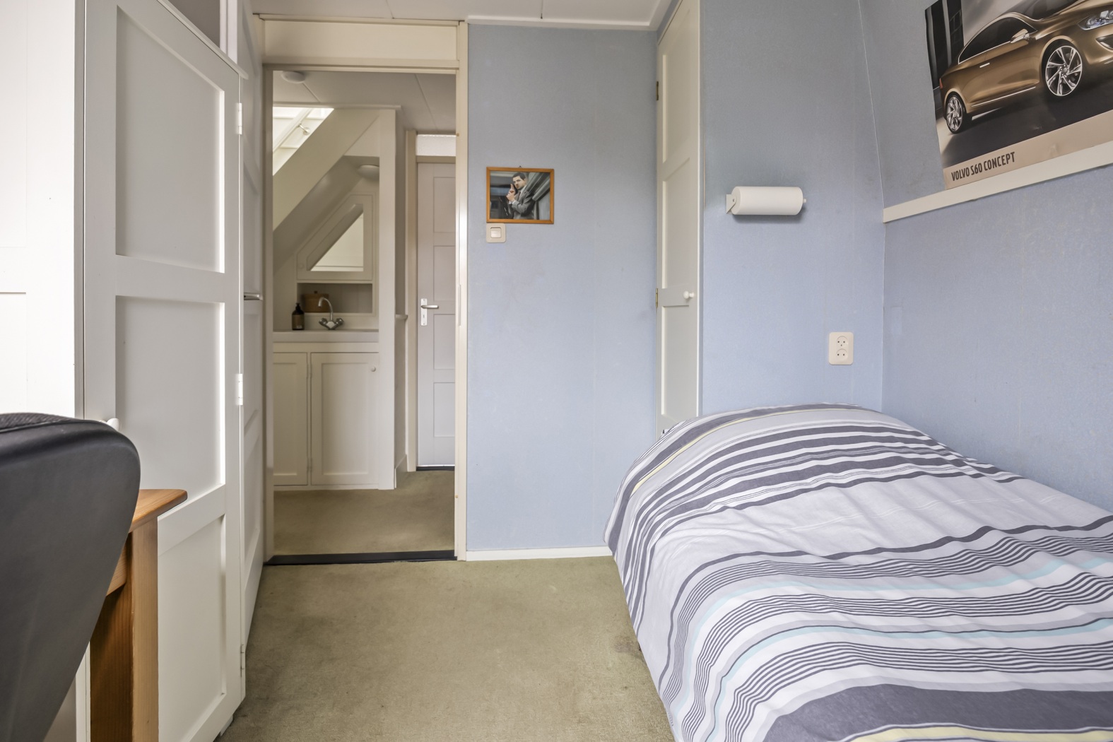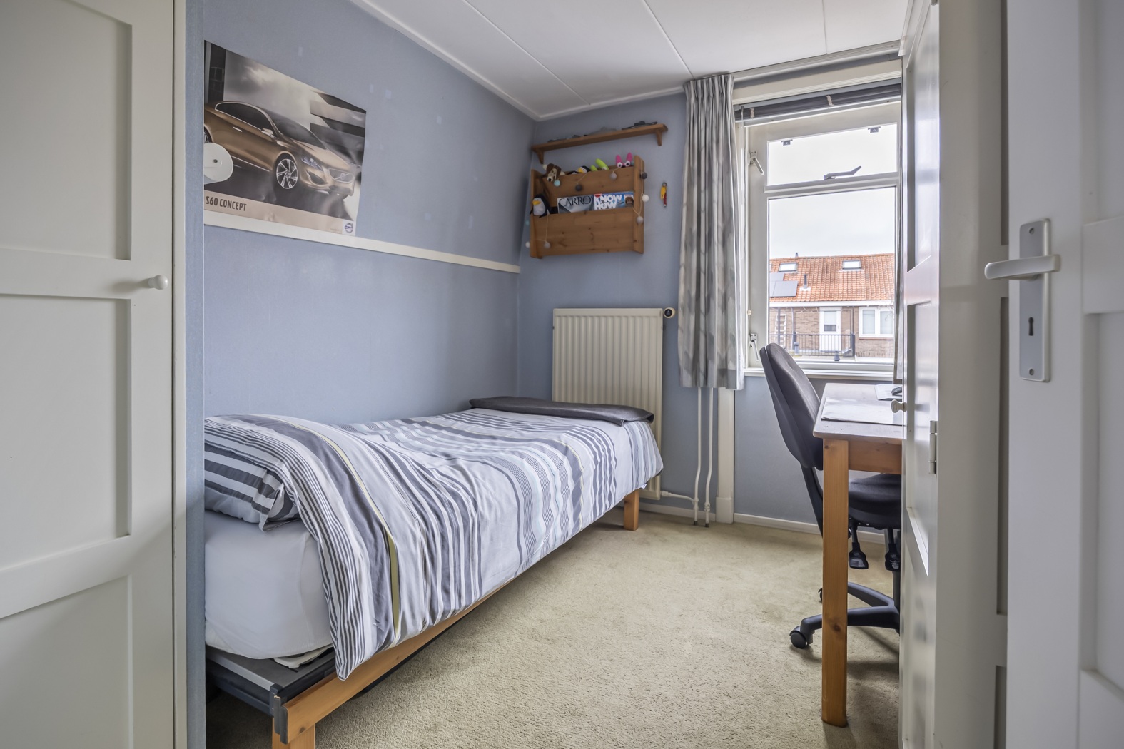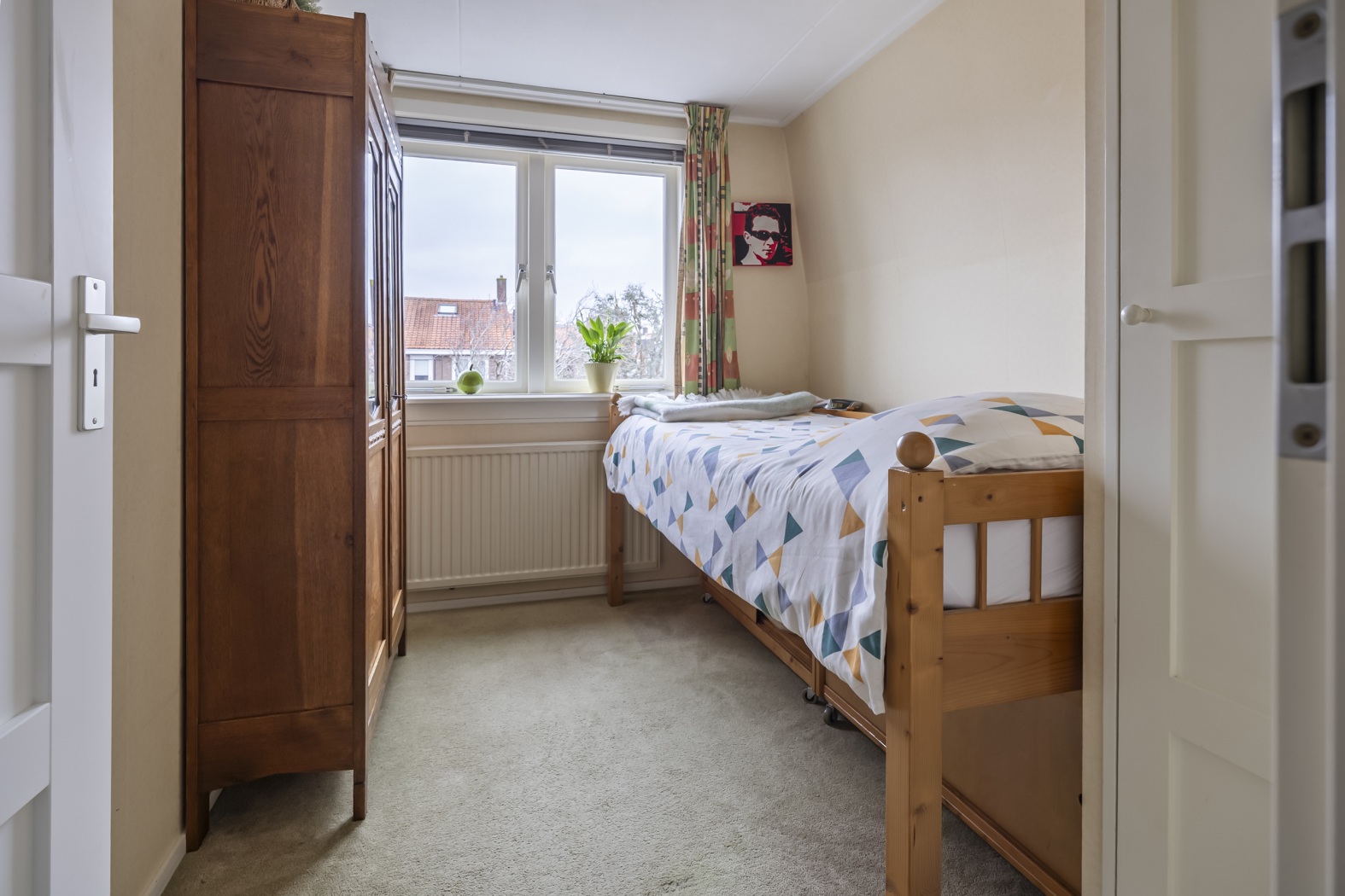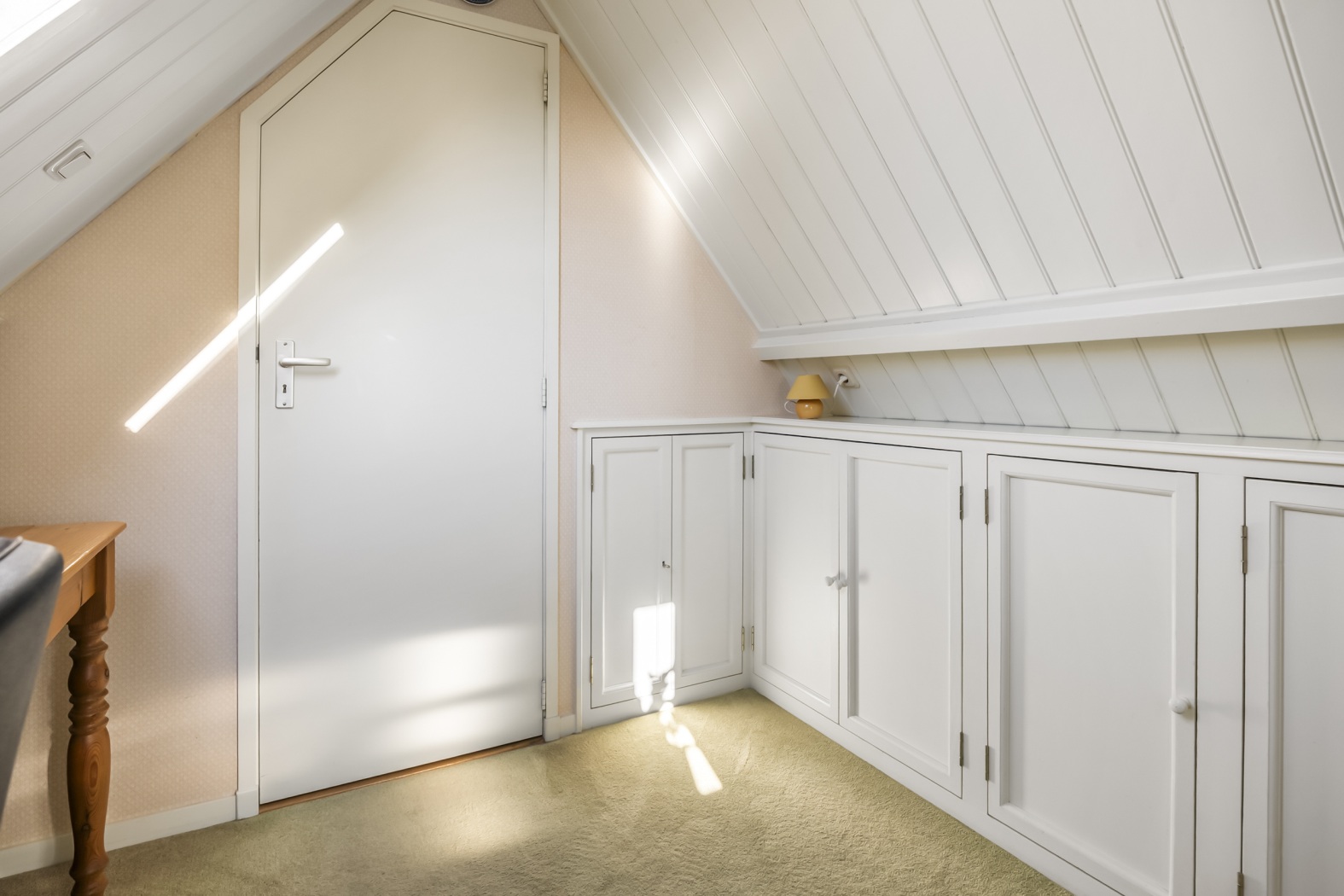 De vaste trap naar zolder brengt je naar een voorzolder met aan elke zijde een kamer. De voorste ingericht als thuiswerkplek met bedraad internet, een vaste boekenkast om het voorraam heen getimmerd en volop ruimte onder een schuine zijde. De was drogen of strijken kan op de achterste kamer. Extra daglicht op je werk? Daar zorgen drie Velux dakvensters voor die helemaal naar buiten opengaan zodat jij je hoofd niet stoot.
