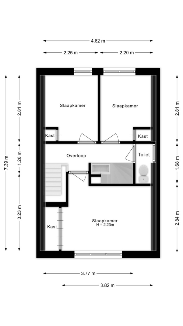 Aan de achterkant heeft een van de twee aanwezige slaapkamers een balkondeur met klepraampje naar het platte dak. Een borstwering met vensterbank voorkomt dat je zo door kunt lopen, maar indien gewenst is dit eenvoudig te demonteren. De andere slaapkamer heeft twee openslaande ramen voor voldoende daglicht en ventilatie. Een ruim toilet en een fijne wasgelegenheid met nog meer opbergruimte maakt de slaapverdieping compleet.