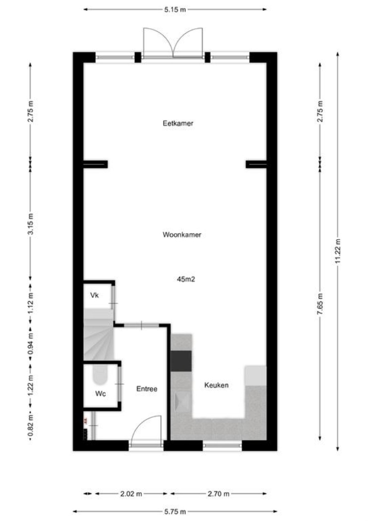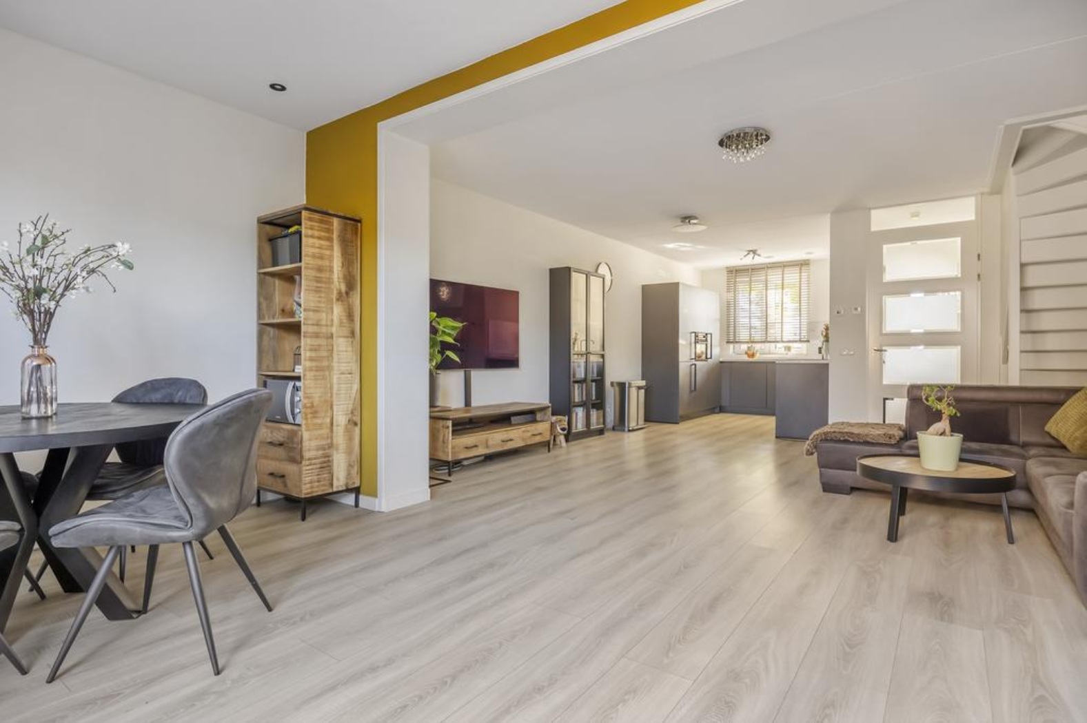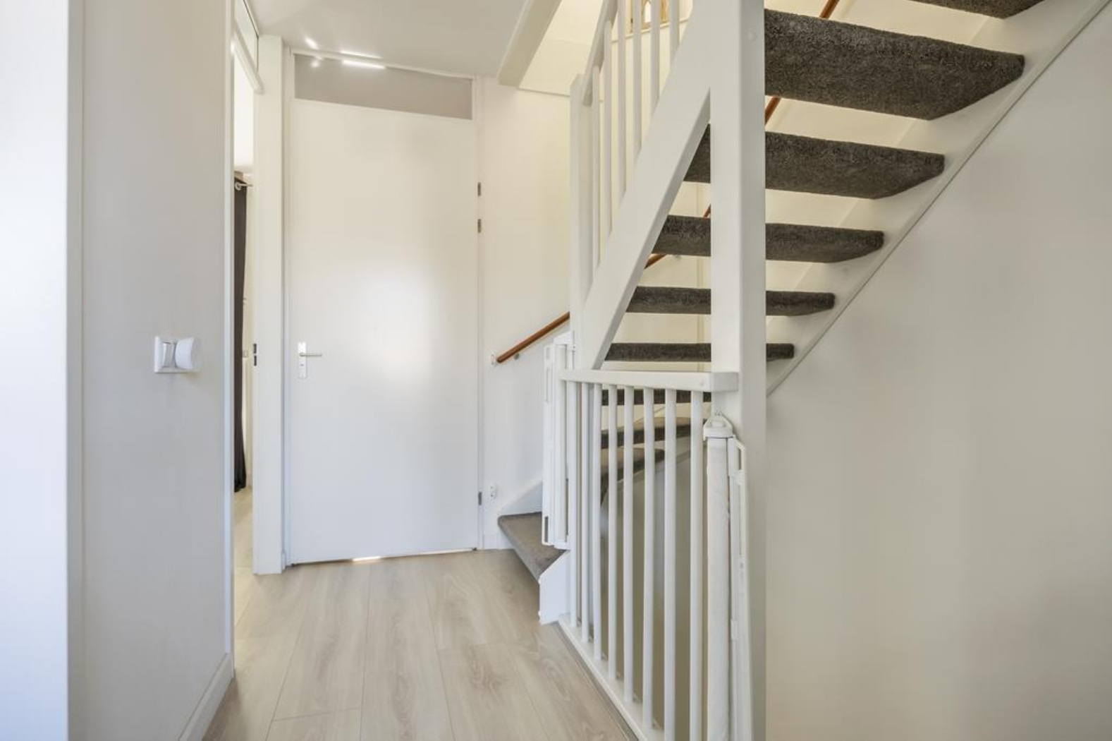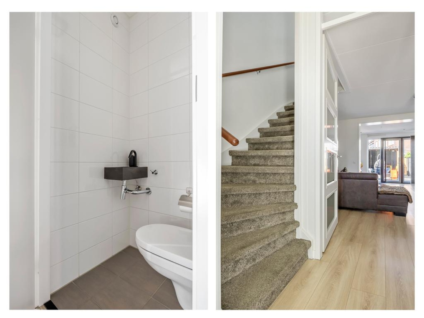 Via de verzorgde voortuin bereik je de entree. In de hal bevinden zich de meterkast, het moderne toilet en de trapopgang naar boven. De begane grond is afgewerkt met een nette laminaatvloer en vloerverwarming, wat zorgt voor comfort en een strakke uitstraling.