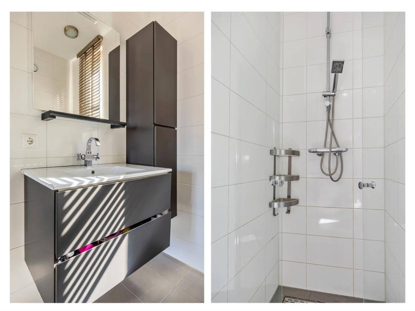De moderne badkamer is compleet uitgevoerd met een ruime inloopdouche, tweede toilet, wastafelmeubel met spiegel en een designradiator. Een verzorgde en frisse ruimte waar je de dag ontspannen begint.