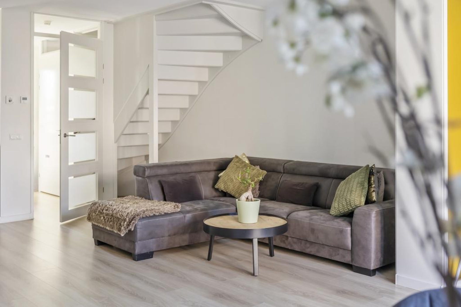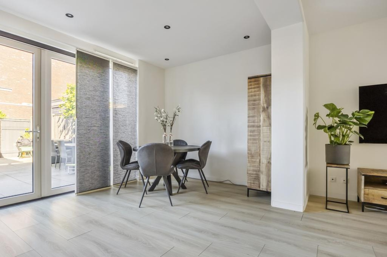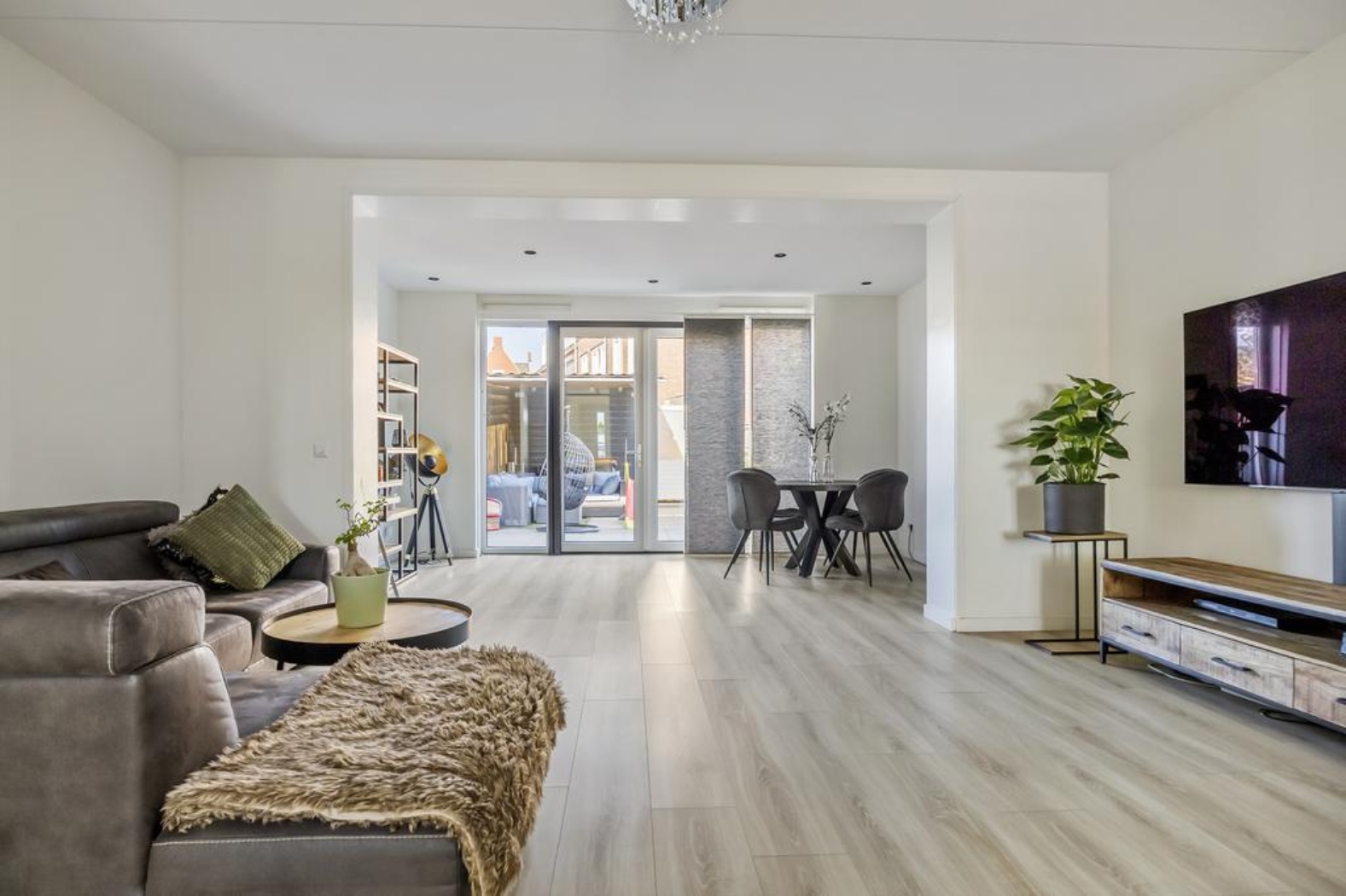 Aan de achterzijde is de woning royaal uitgebouwd, waardoor een heerlijke leefruimte van circa 45 m² is ontstaan. Hier geniet je van een fijne zithoek, volop lichtinval dankzij de grote ramen en dubbele openslaande deuren naar de tuin. De strakke plafondafwerking met inbouwspots geeft de ruimte een moderne sfeer.