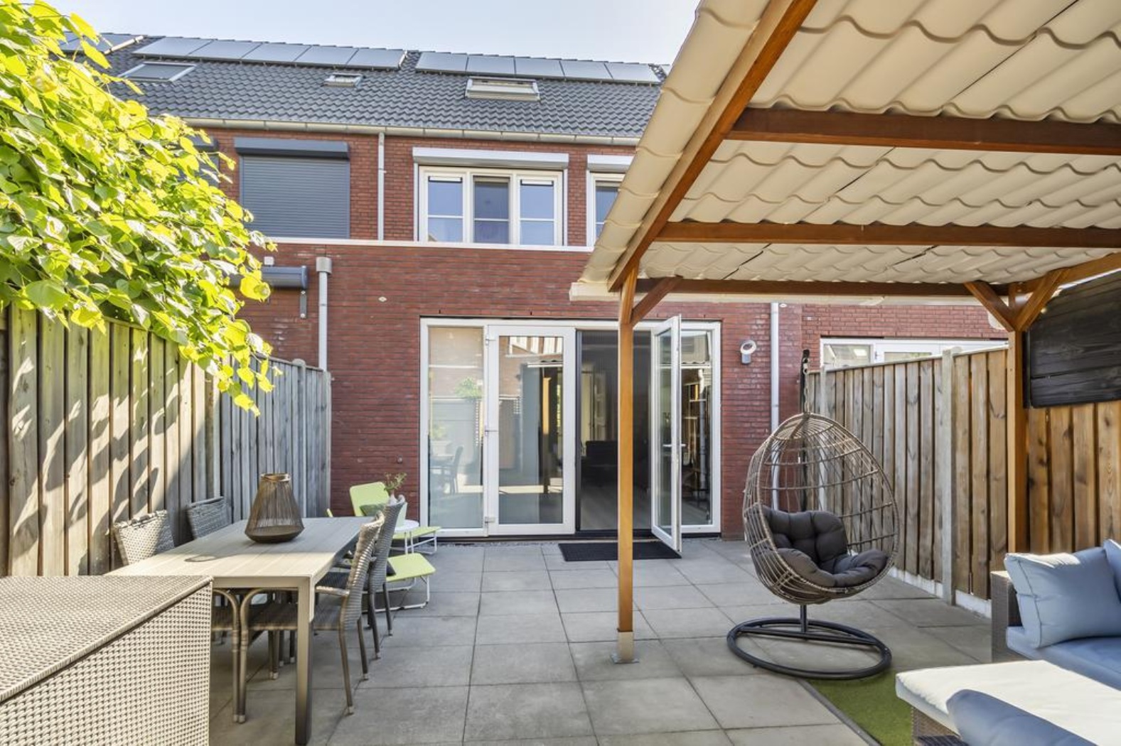 De zonnige achtertuin ligt op het westen en is onderhoudsvriendelijk aangelegd met terrastegels. Achterin vind je een houten berging en een sfeervolle overkapping waar je tot in de late uurtjes kunt genieten van het buitenleven. Dankzij de achterom naar het rustige parkeerpleintje combineer je privacy met praktisch gemak.