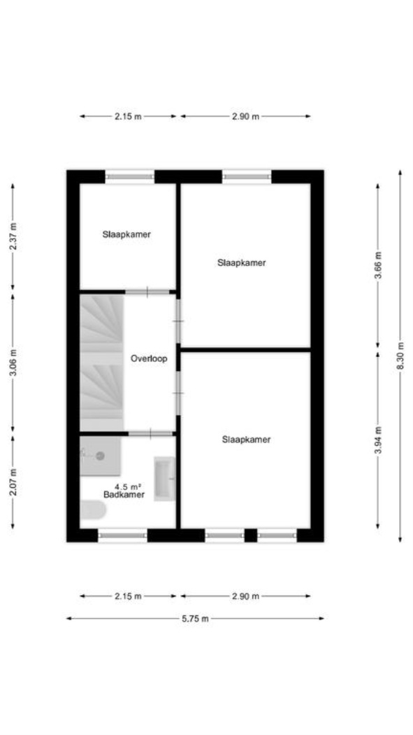 Op de eerste verdieping vind je drie goed bemeten slaapkamers. Twee kamers liggen aan de achterzijde, één aan de voorzijde. Alle kamers zijn voorzien van rolluiken, ideaal voor comfort en privacy.
