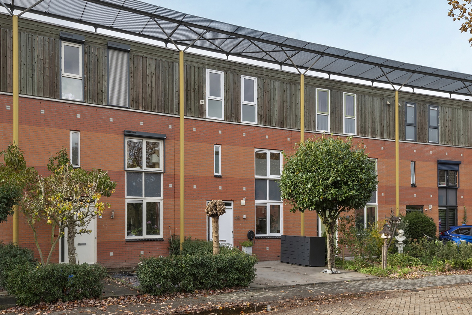 Aan de voorzijde ligt een verzorgde voortuin met parkeerplaats op eigen terrein en een laadpunt voor de elektrische auto.