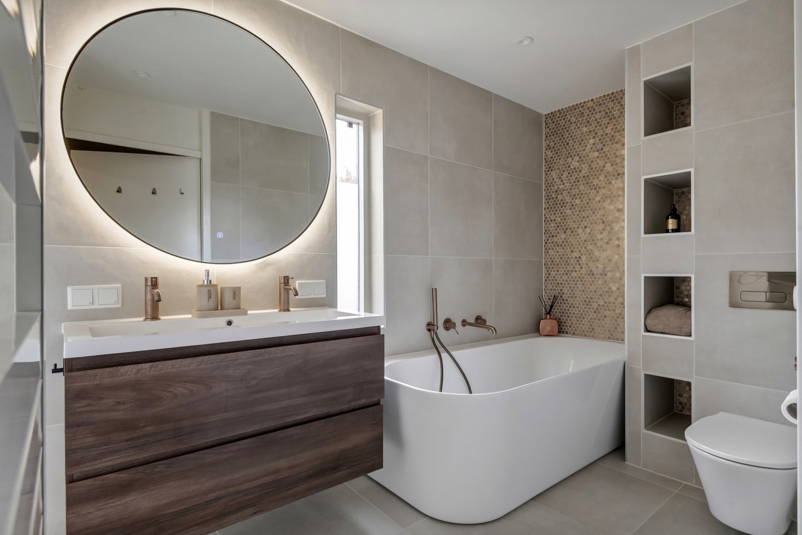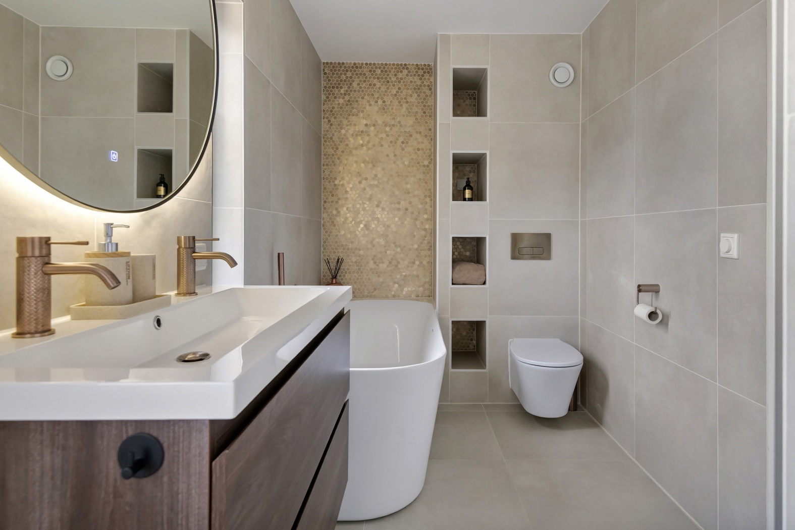 •Luxe, woningbrede badkamer (2024): ligbad, dubbele wastafel, inloopdouche & toilet