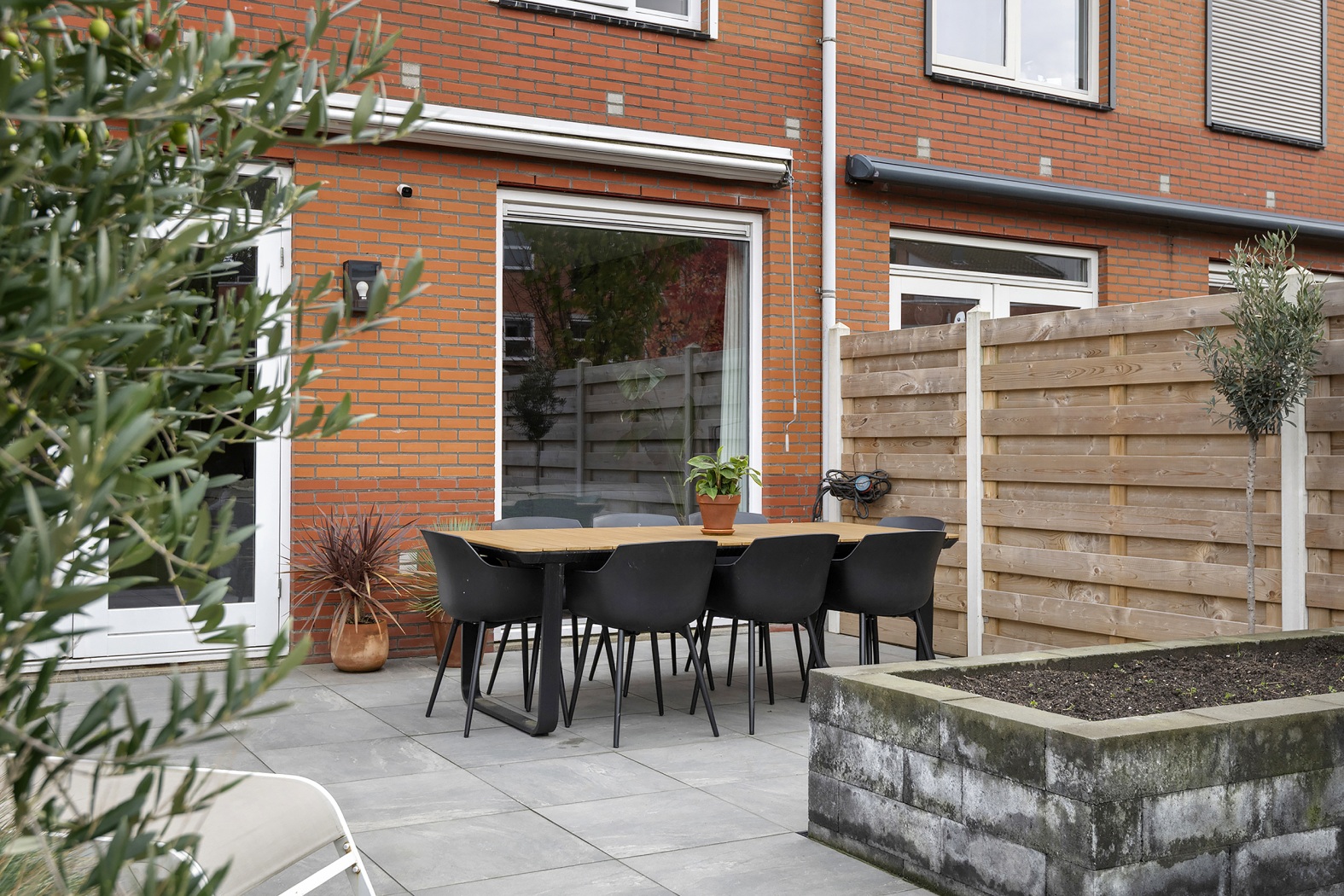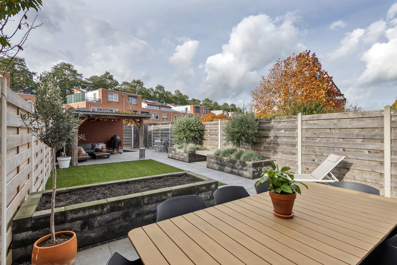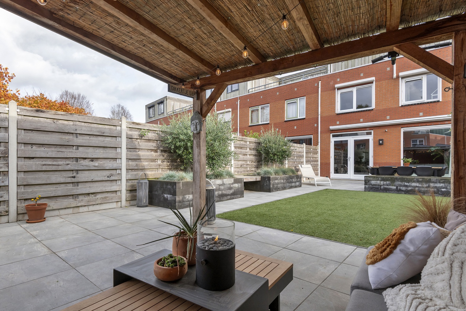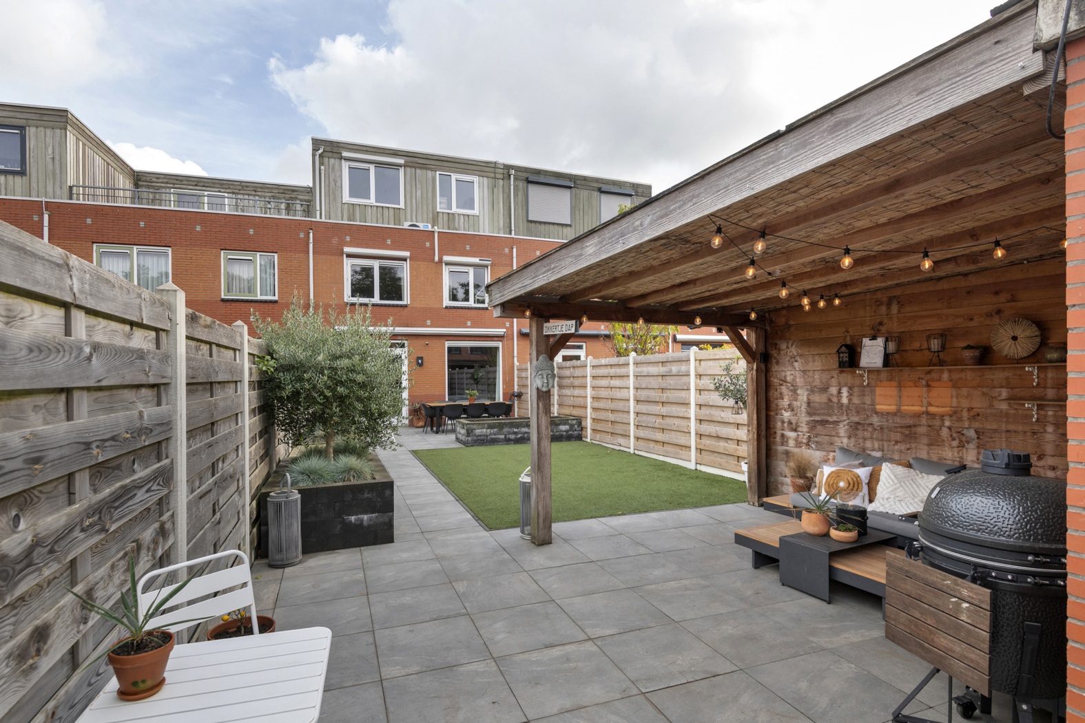 En dan de tuin… maar liefst 18 meter diep, met volop zon en een fijne lounge overkapping. Hier kun je de zomer alvast vooruit voelen.