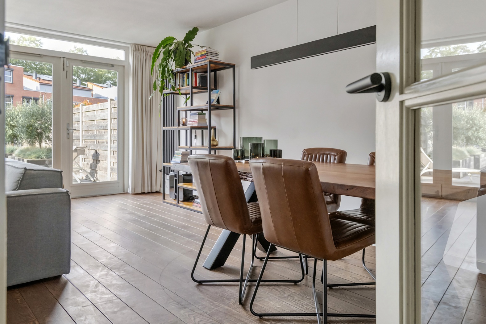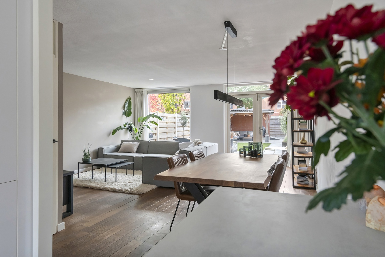 De tuingerichte woonkamer is licht en sfeervol, met een raam tot aan de grond en dubbele tuindeuren waardoor je een fijn zicht hebt op de achtertuin. Nabij de keuken is ruimte voor een gezellige eettafel. De houten vloerdelen zorgen voor een warme, huiselijke uitstraling.