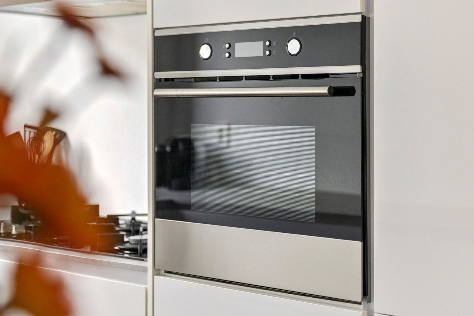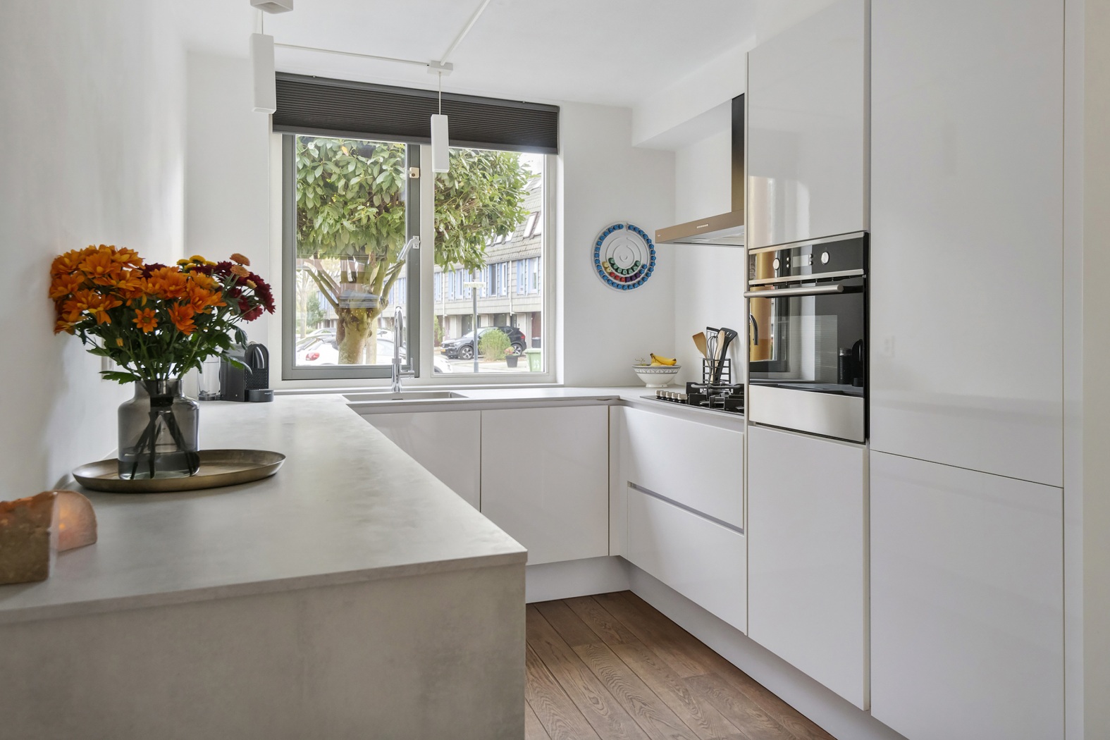 De keuken (2017) is uitgevoerd in een ruime U-opstelling met een raam aan de voorzijde. De witte, greeploze fronten en het betonlook werkblad geven een moderne en strakke uitstraling. De keuken is compleet uitgerust met o.a. een gaskookplaat, rvs-afzuigkap, oven, koel-/vriescombinatie, vaatwasmachine en Quooker. Dankzij de praktische indeling met veel laden en kastruimte is er meer dan voldoende opbergruimte.